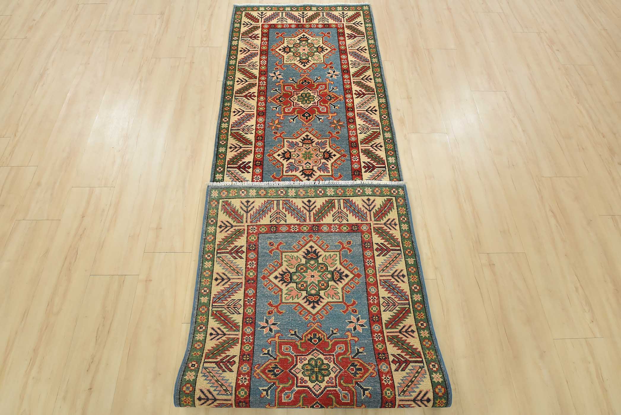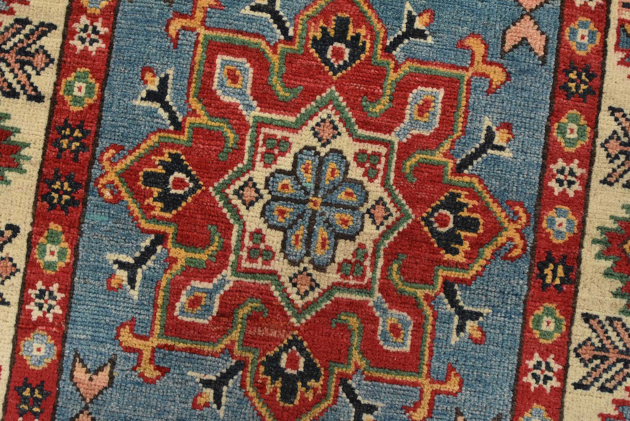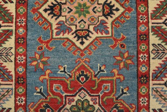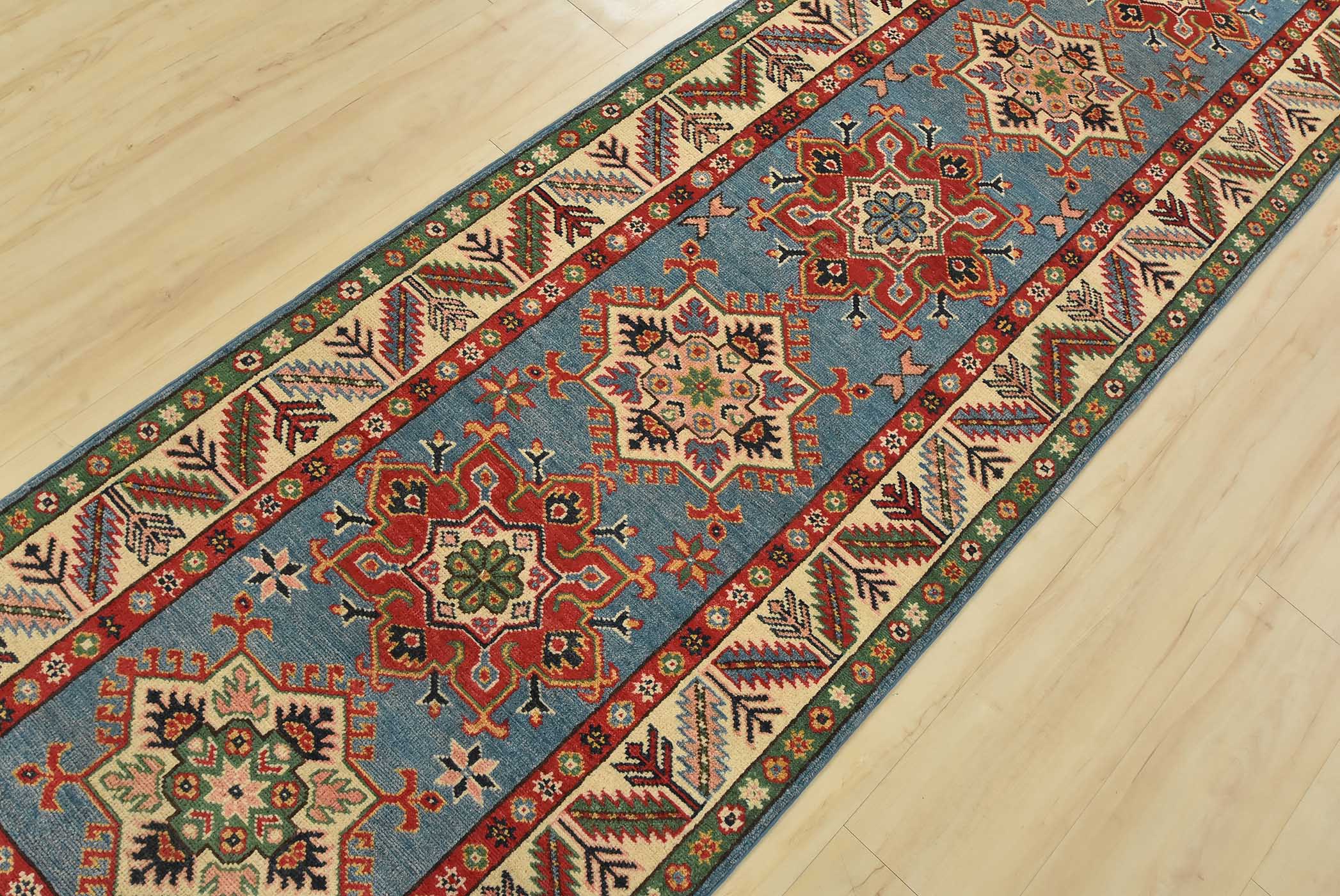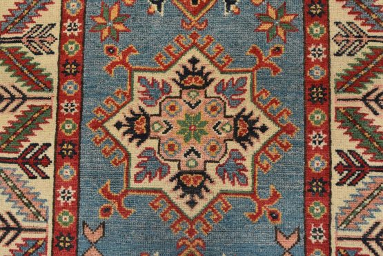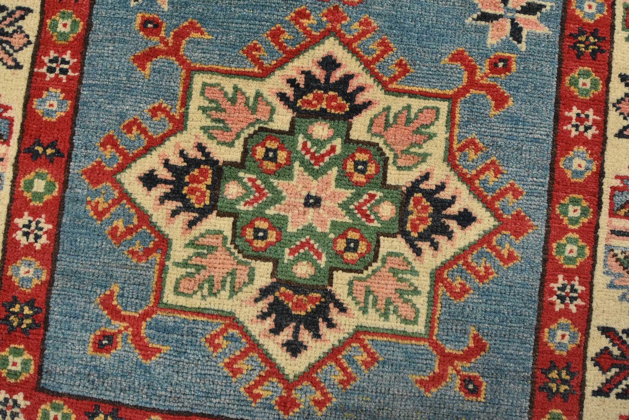 A tribal Caucasian Kazak runner hand-knotted with fine wool on a cotton foundation. This rug features a row of geometric medallions set against a blue background. It is new and in excellent condition.