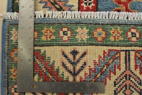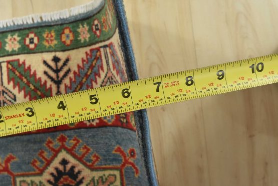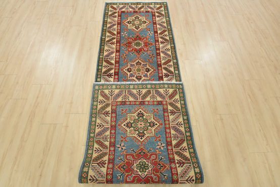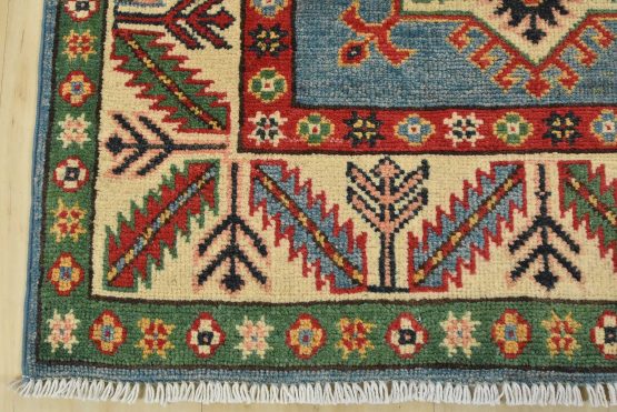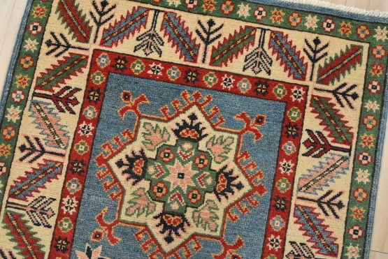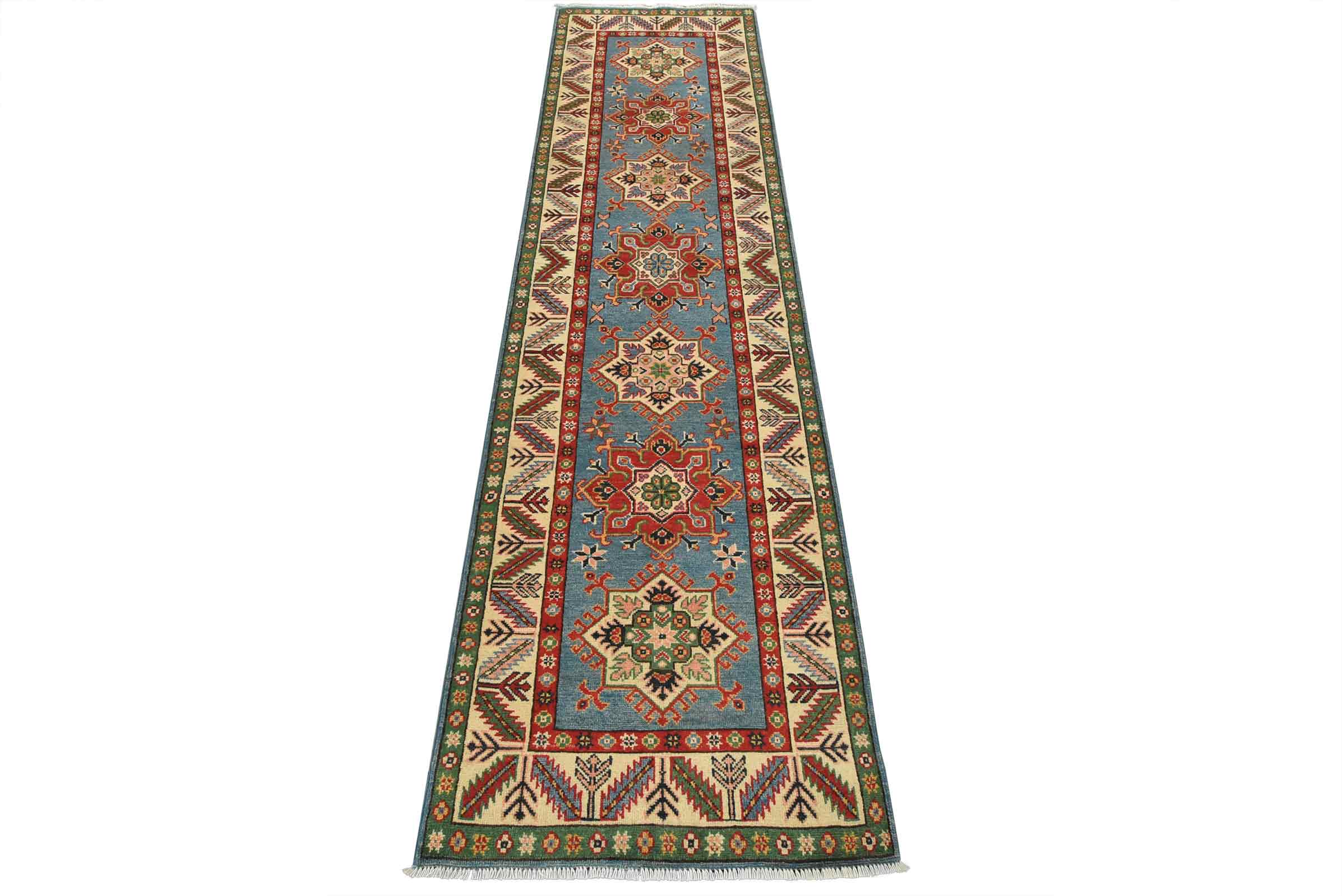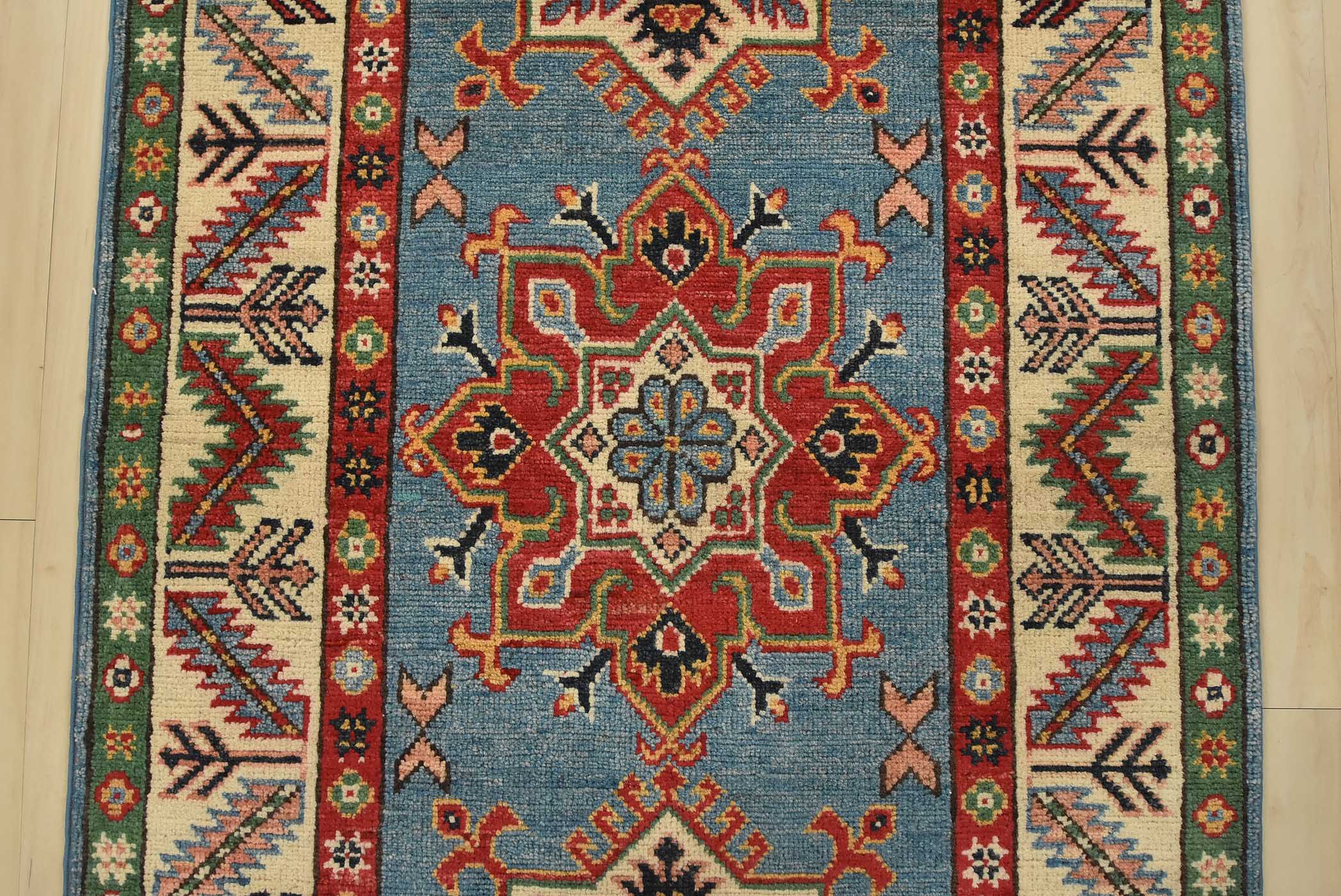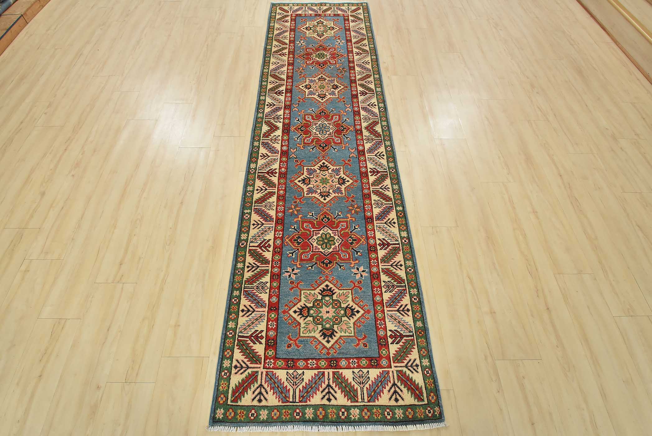 A tribal Caucasian Kazak runner hand-knotted with fine wool on a cotton foundation. This rug features a row of geometric medallions set against a blue background. It is new and in excellent condition.