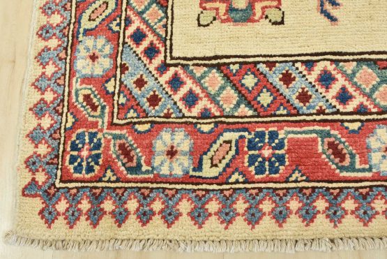 Original antique Kazak rugs from the Caucasus region inspire the creation of new Kazak rugs. These rugs are woven with fine wool using traditional Kazak patterns and finished with a low-cut pile to give them an authentic vintage look.