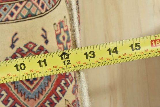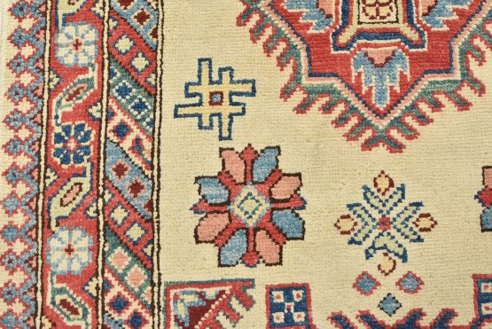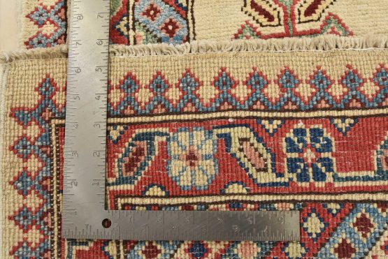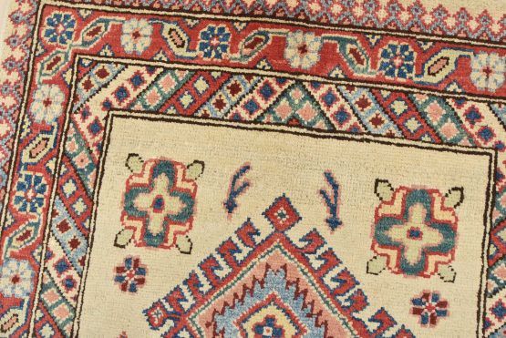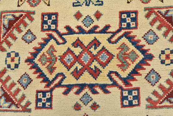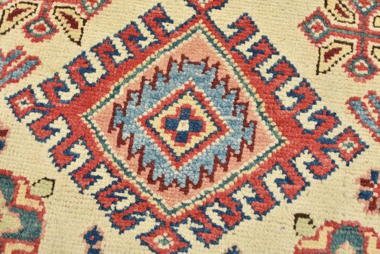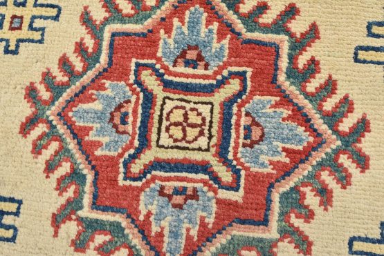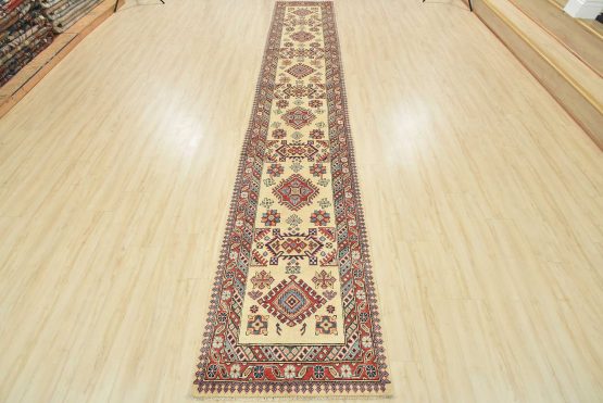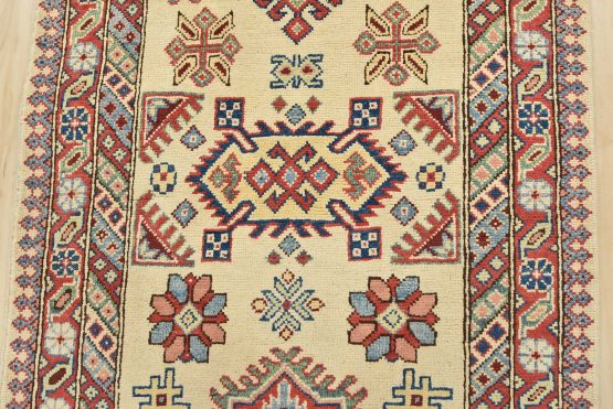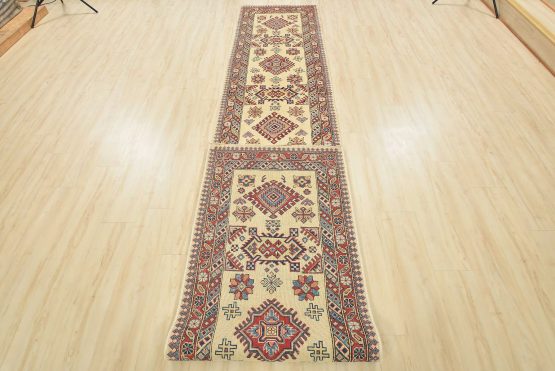A tribal Caucasian Kazak runner hand-knotted with an all-wool pile on a cotton foundation. This oriental rug features a row of geometric medallions surrounded by small geometric motifs set against a beige background. It is new and in excellent condition.