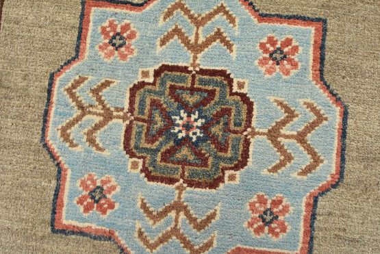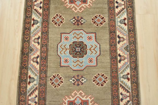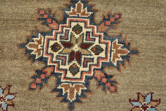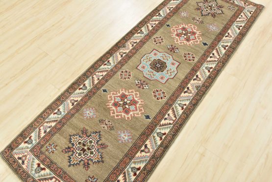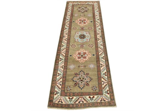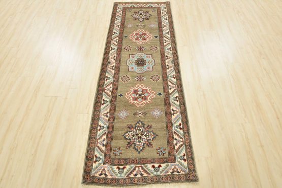 A tribal Caucasian Kazak runner hand-knotted with an all-wool pile on a cotton foundation. This oriental rug features geometric medallions surrounded by small geometric motifs set against a brown background. It is new and in excellent condition.