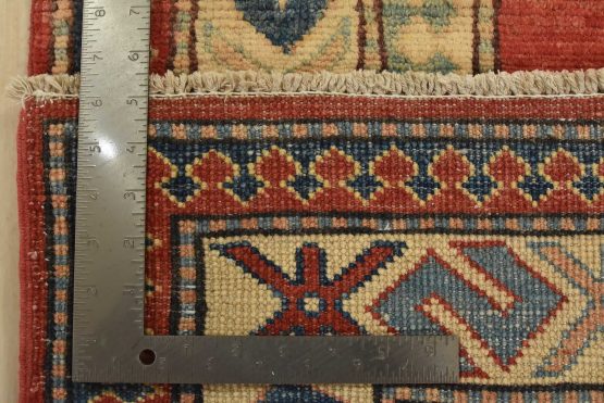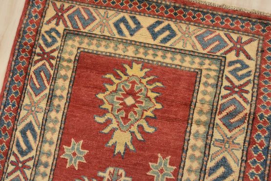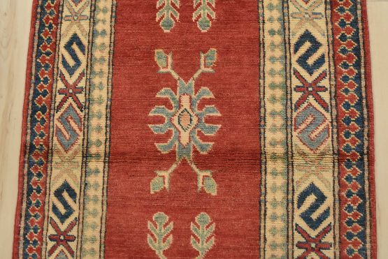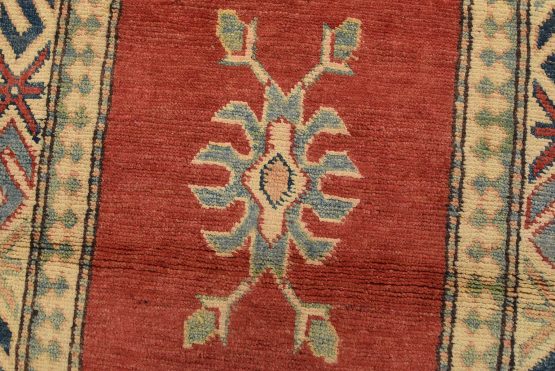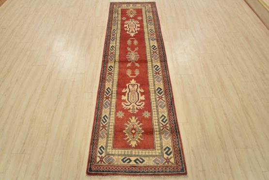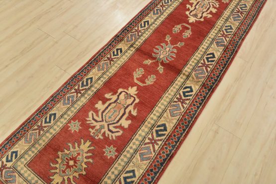 A traditional Caucasian Kazak runner hand-knotted with an all-wool pile on a cotton foundation. This oriental rug features botanical motifs set against a red background. It is new and in excellent condition.