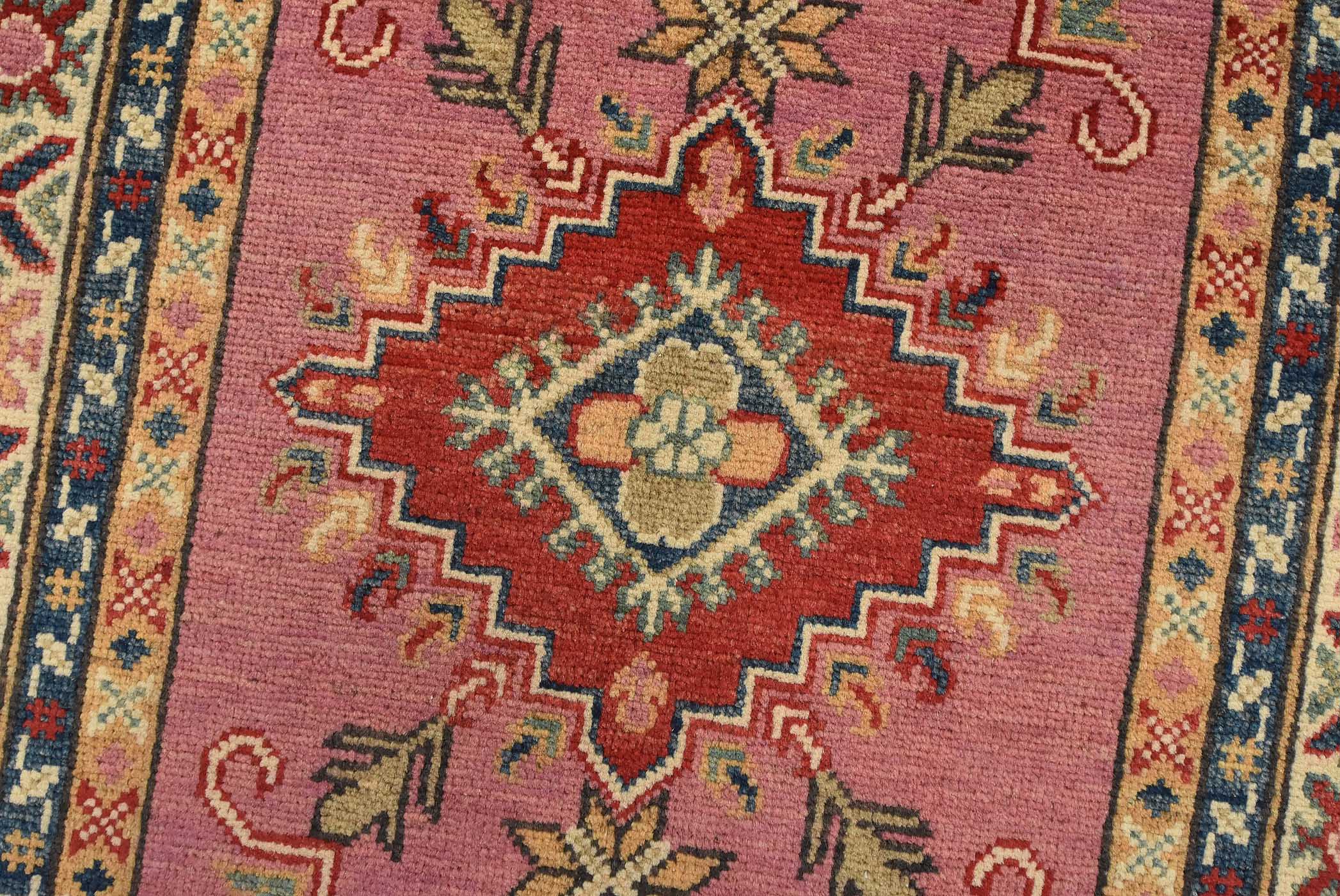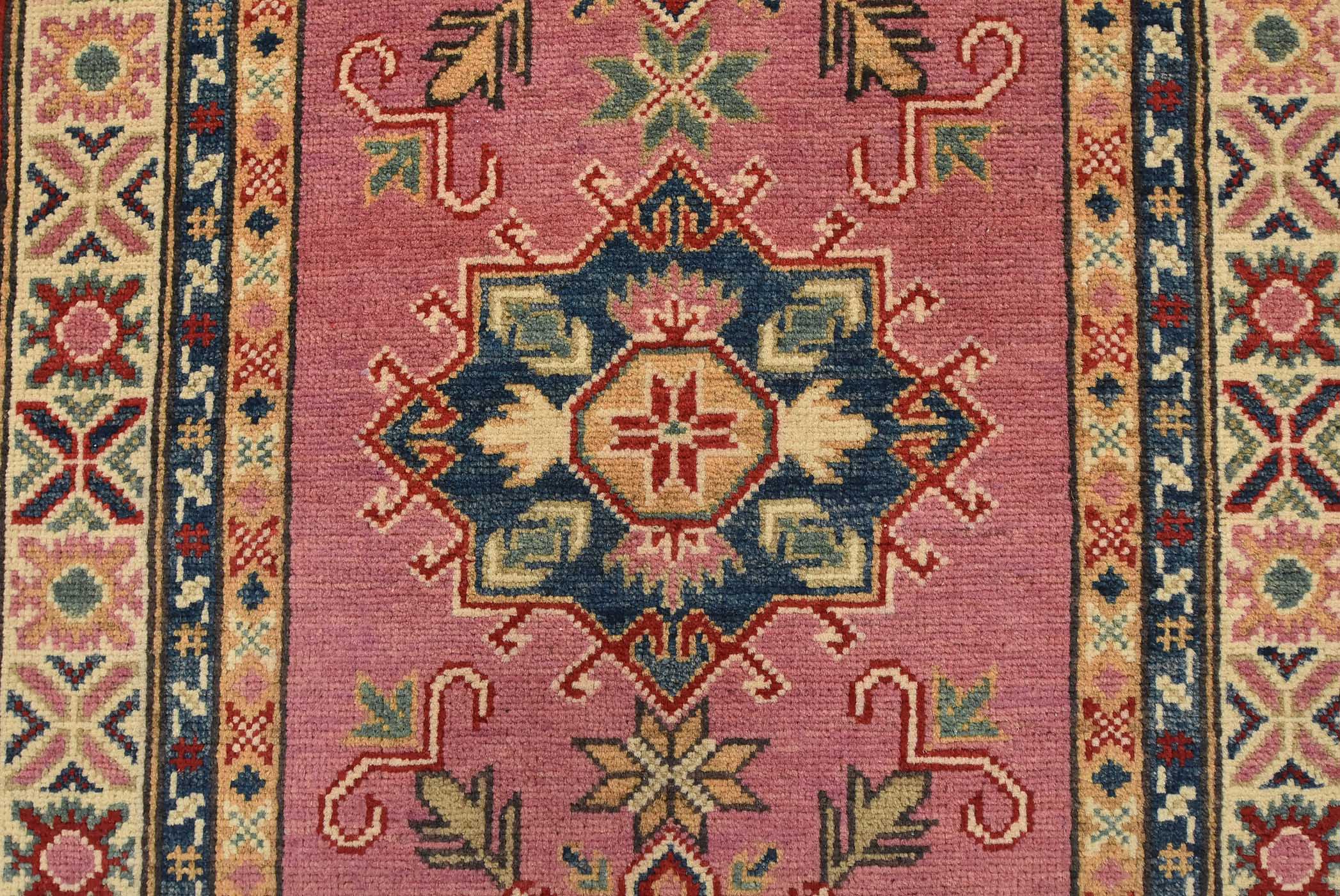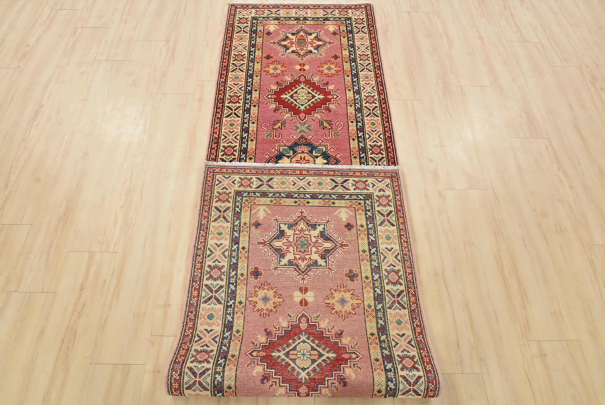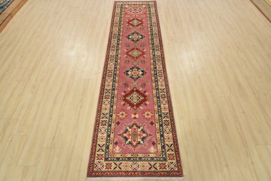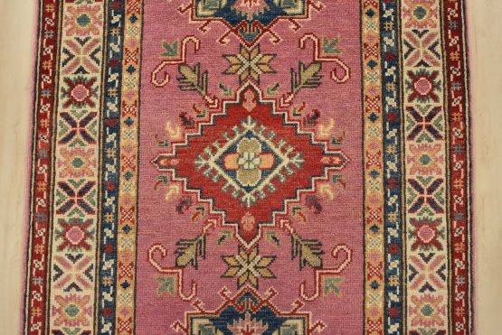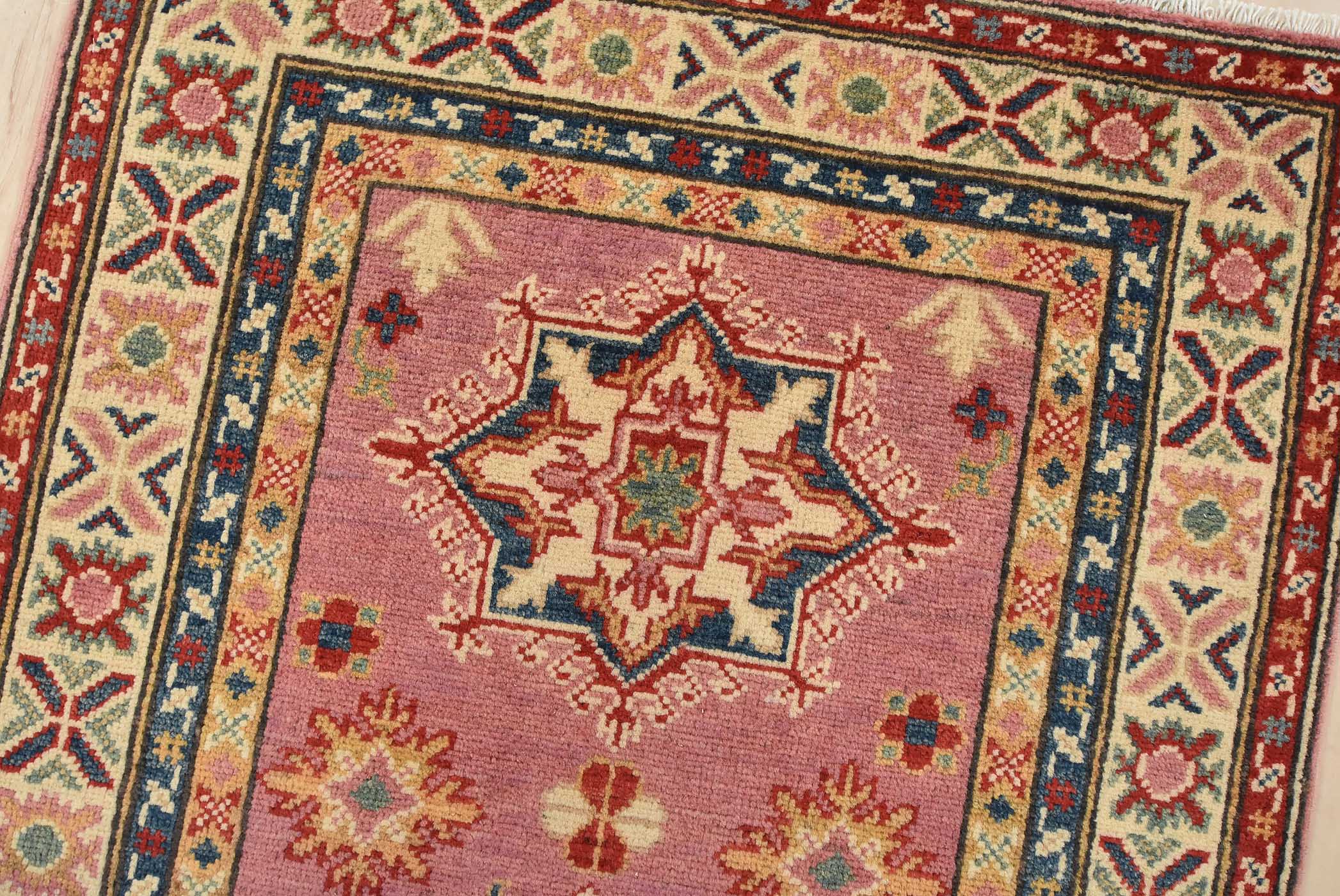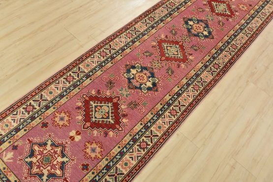 A tribal Caucasian Kazak runner hand-knotted with fine wool on a cotton foundation. This rug features a row of geometric medallions surrounded by small geometric motifs set against a pink background. It is new and in excellent condition.