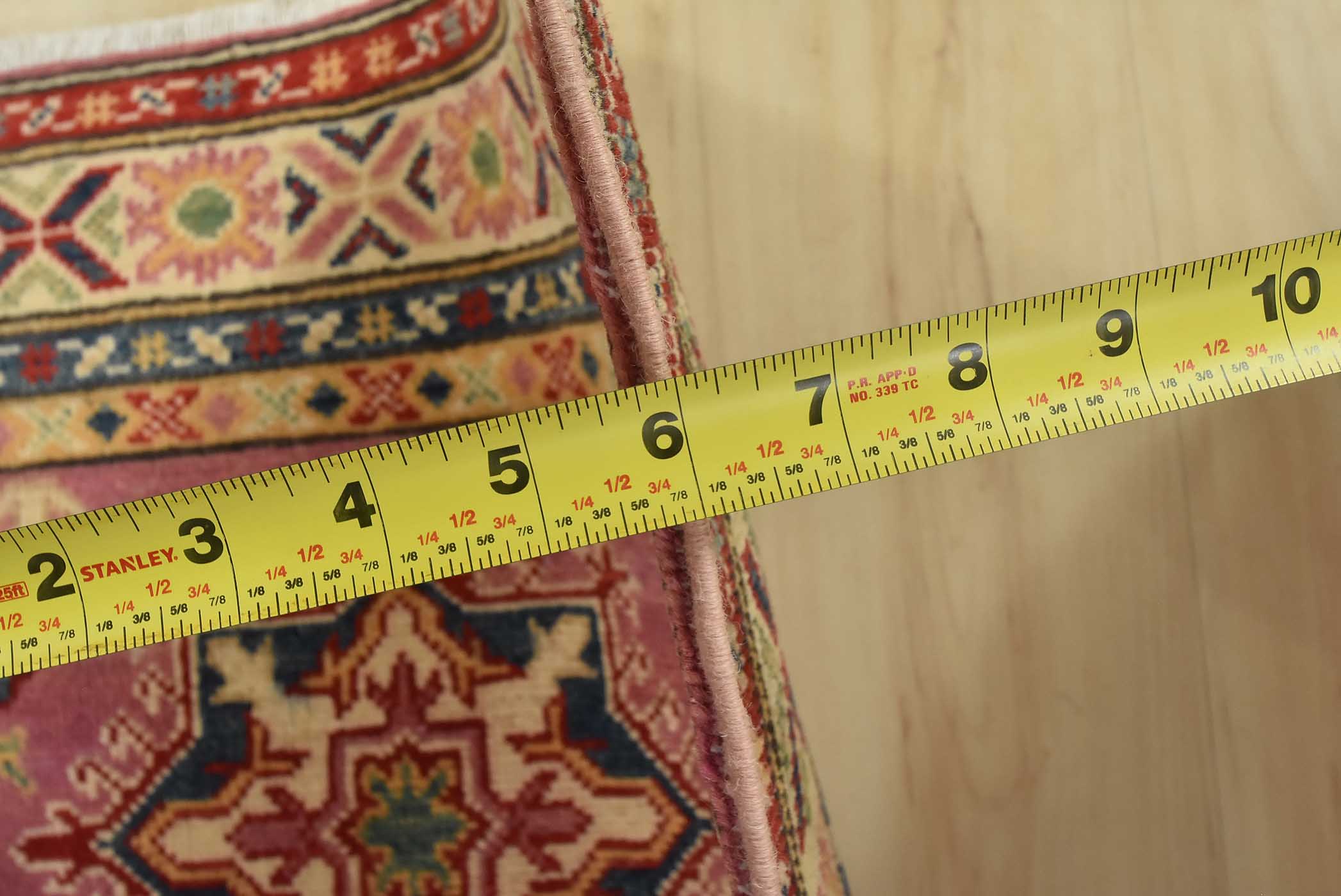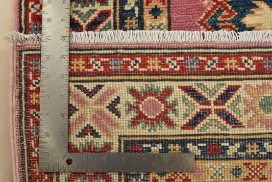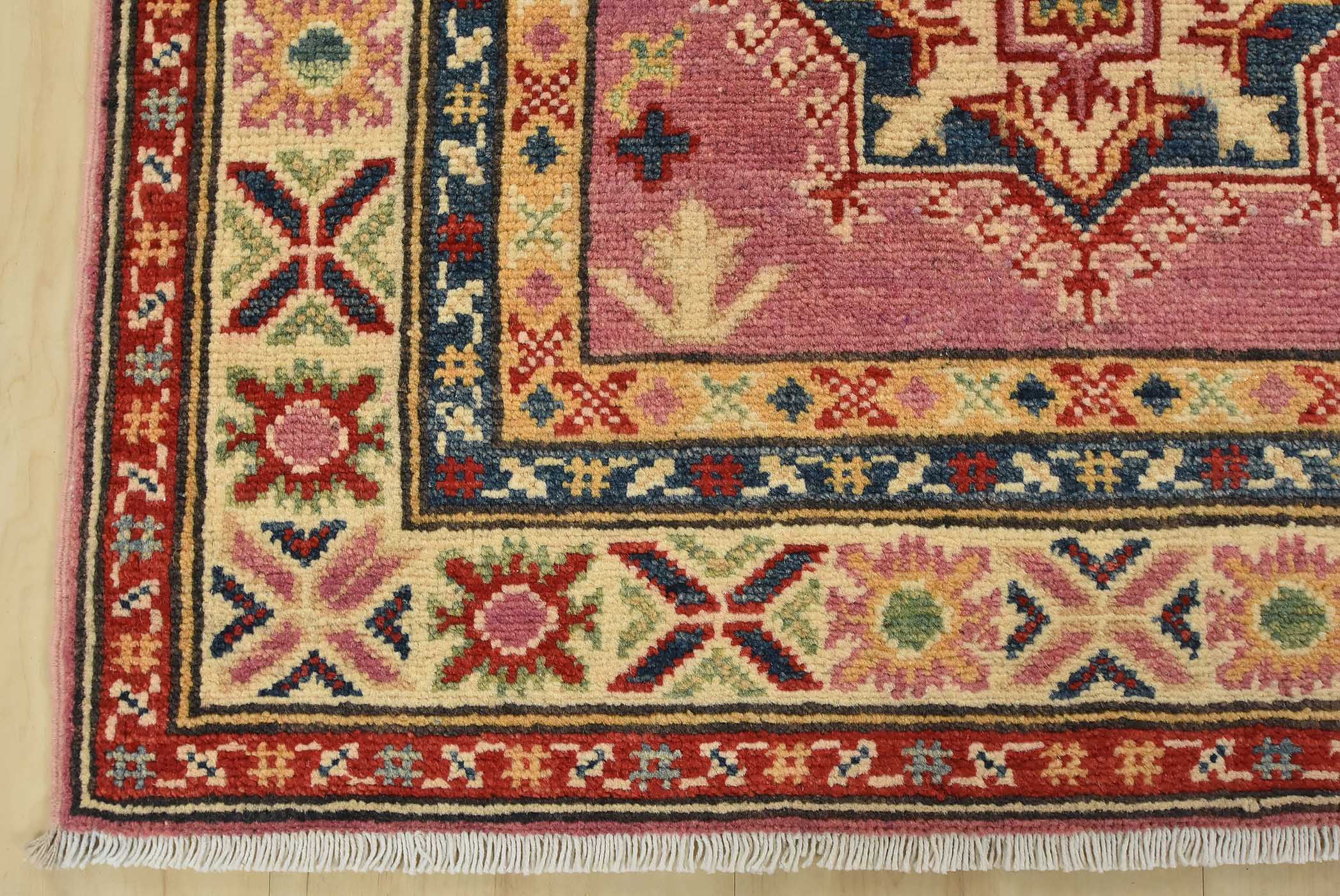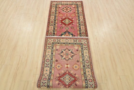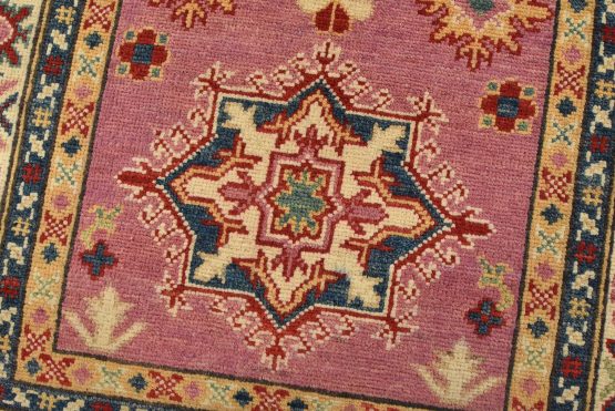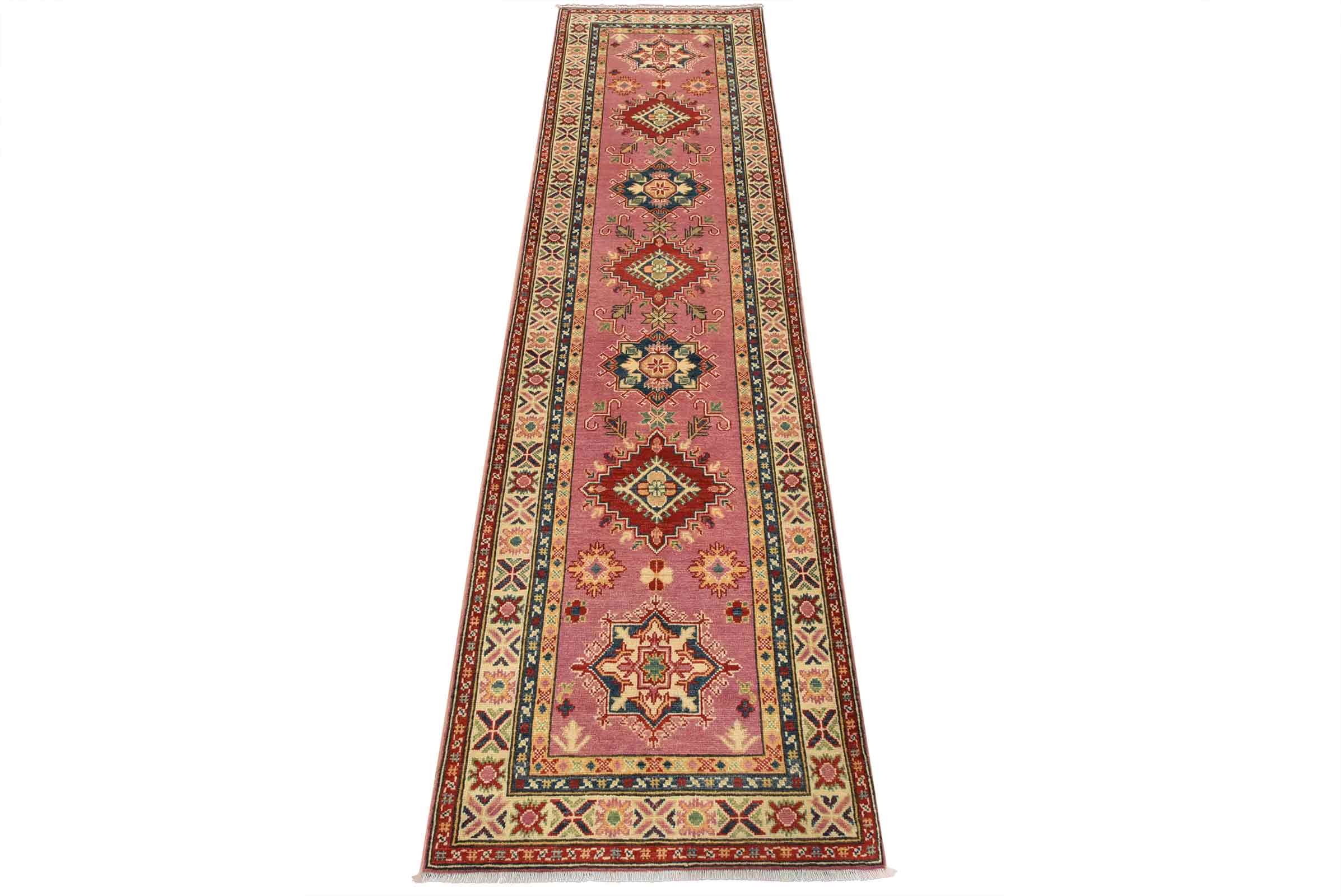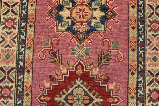 A tribal Caucasian Kazak runner hand-knotted with fine wool on a cotton foundation. This rug features a row of geometric medallions surrounded by small geometric motifs set against a pink background. It is new and in excellent condition.