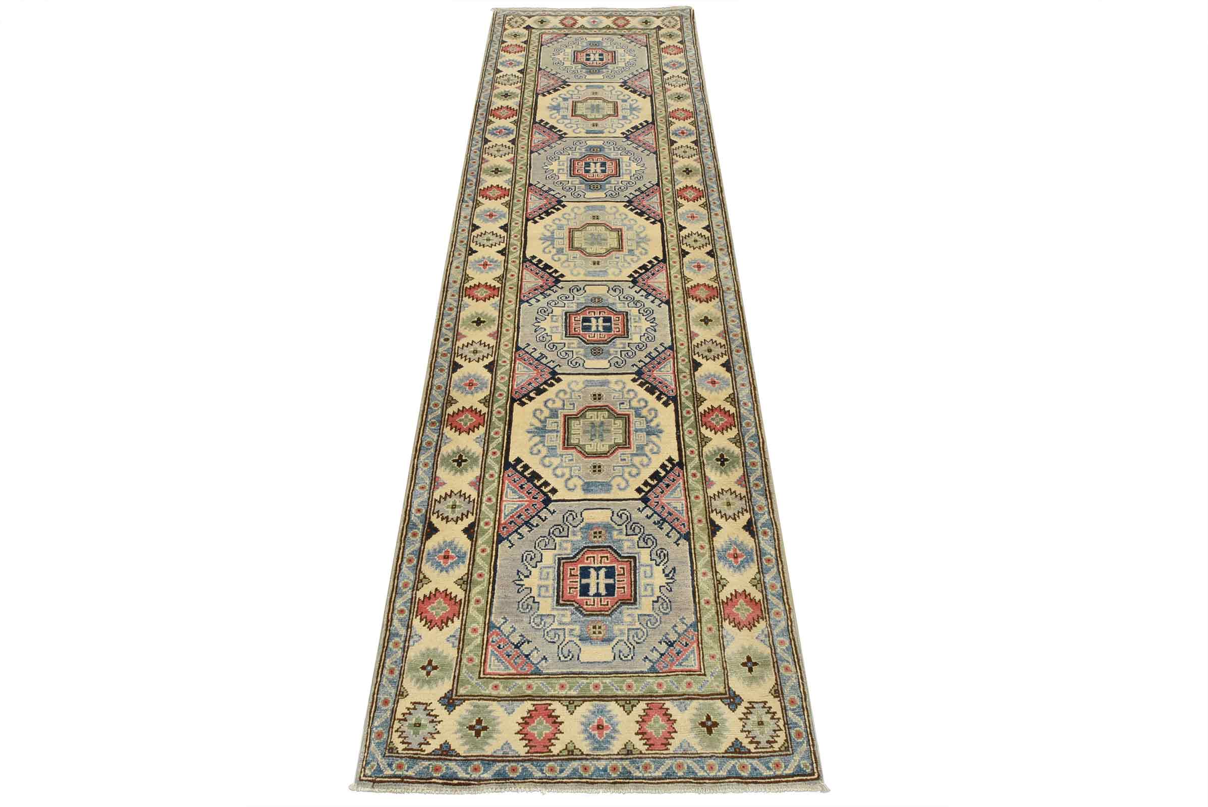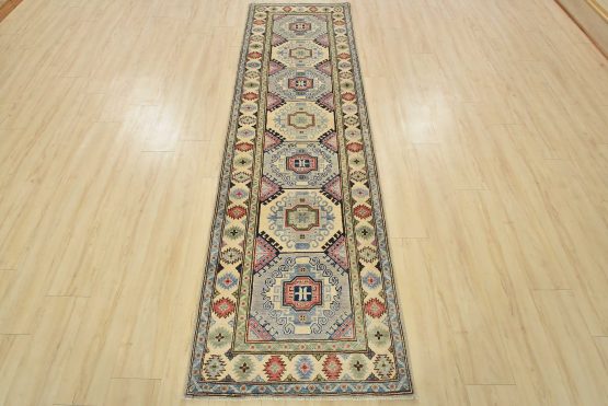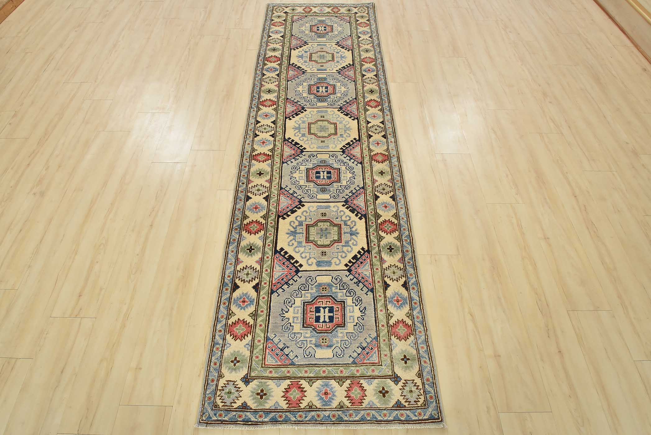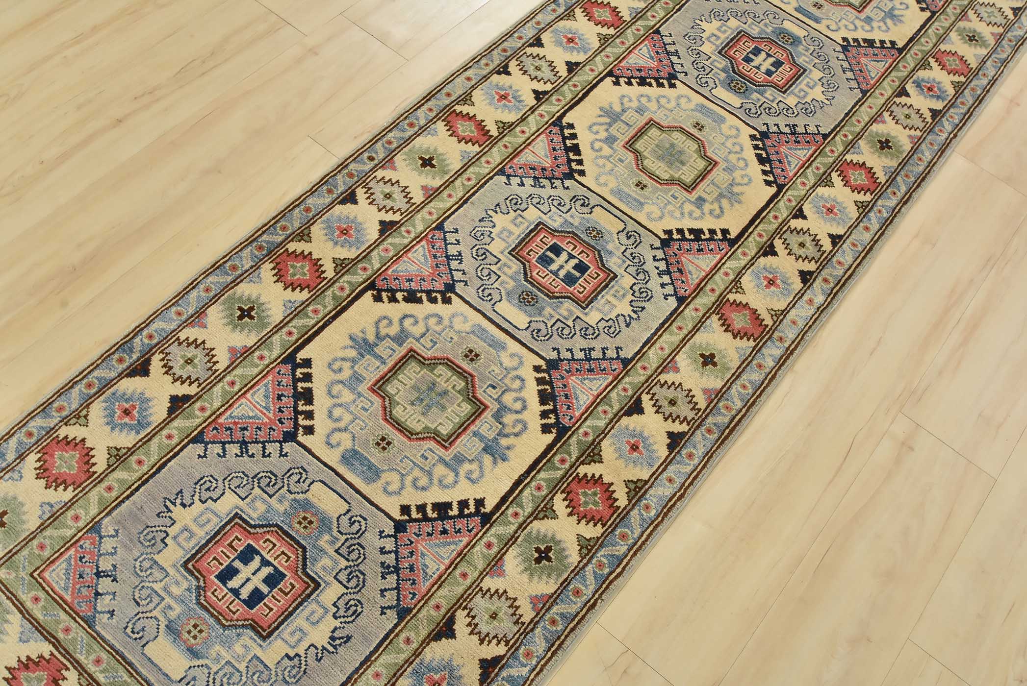 A tribal Caucasian Kazak runner hand-knotted with fine wool on a cotton foundation. This rug features a row of geometric medallions. It is new and in excellent condition.