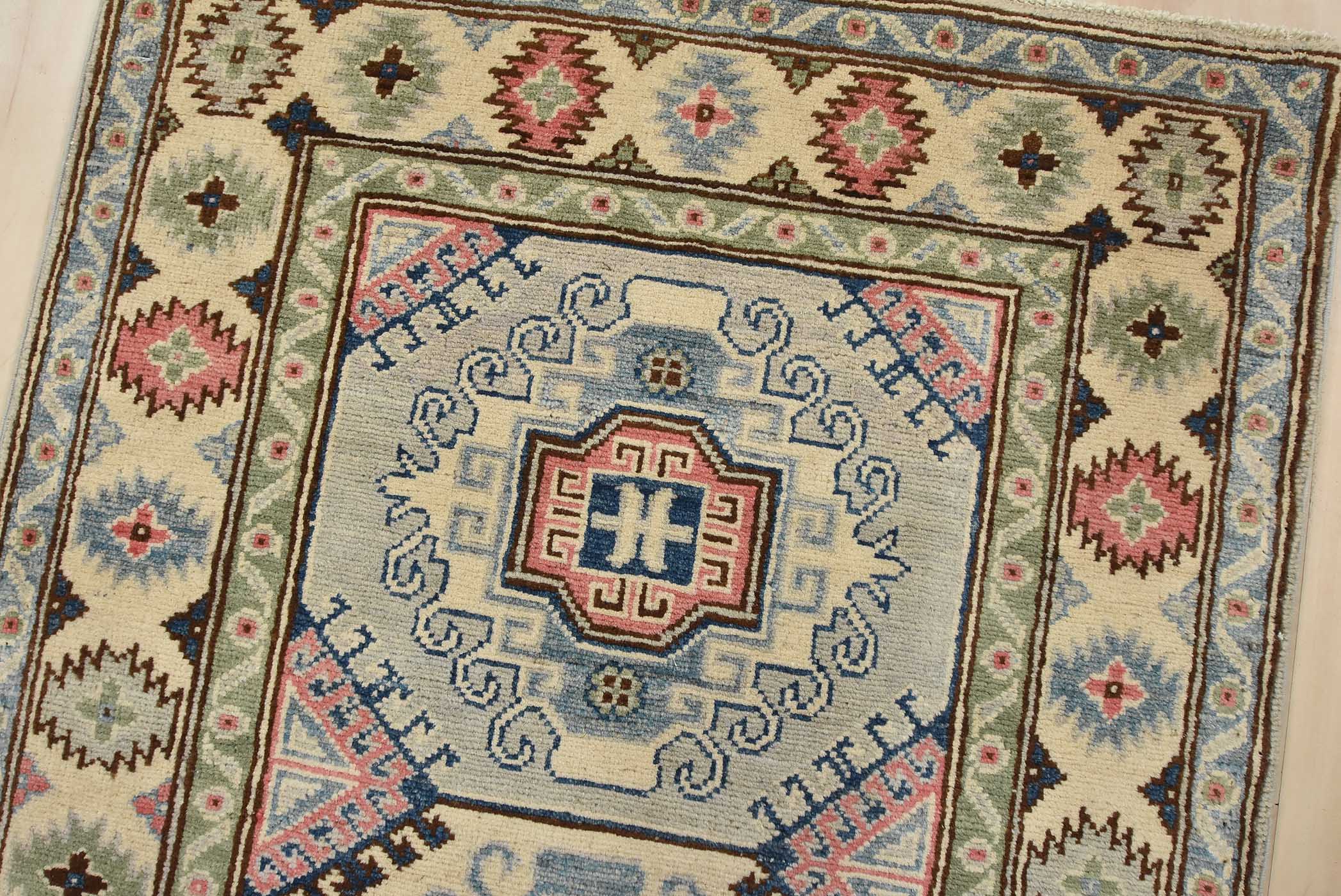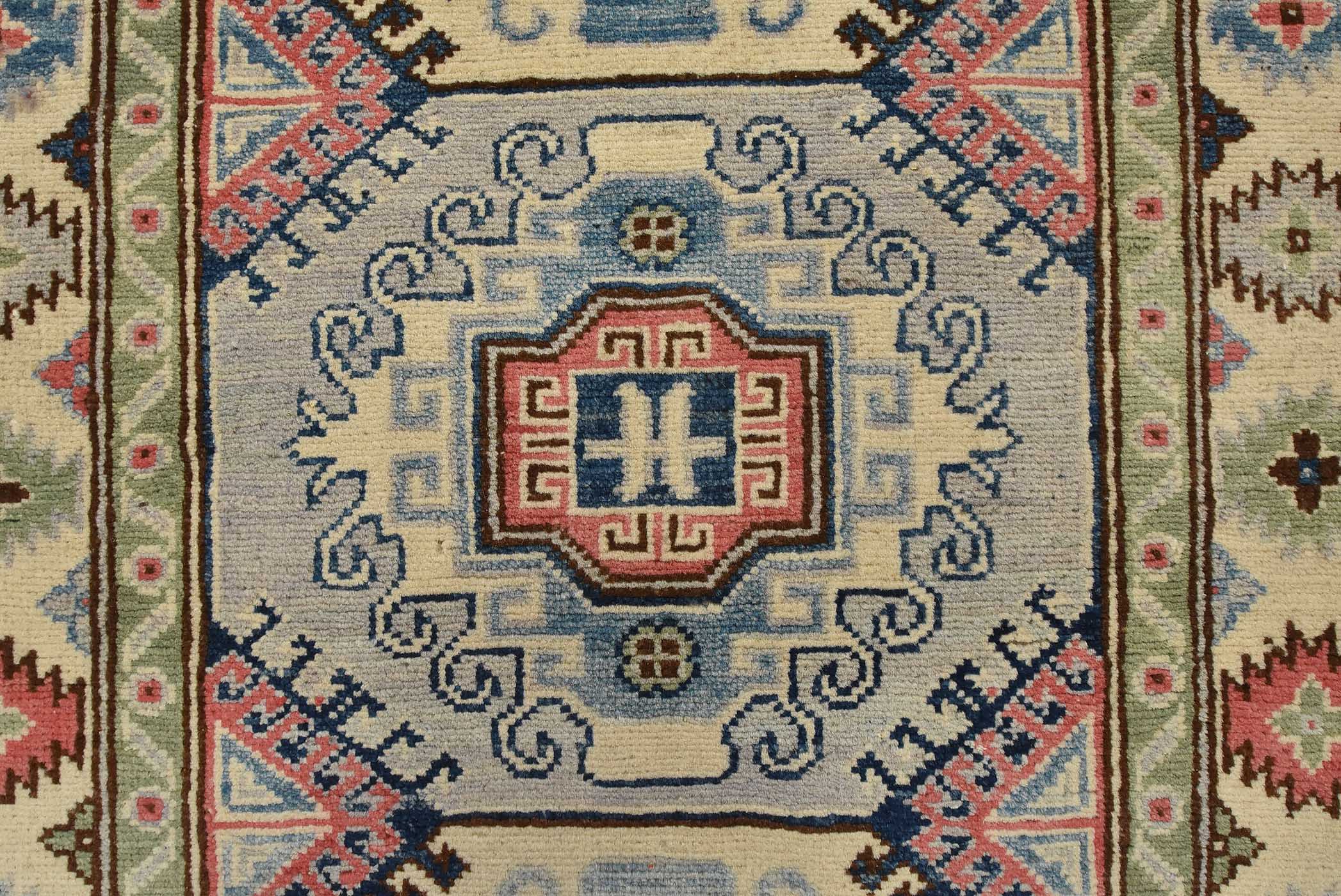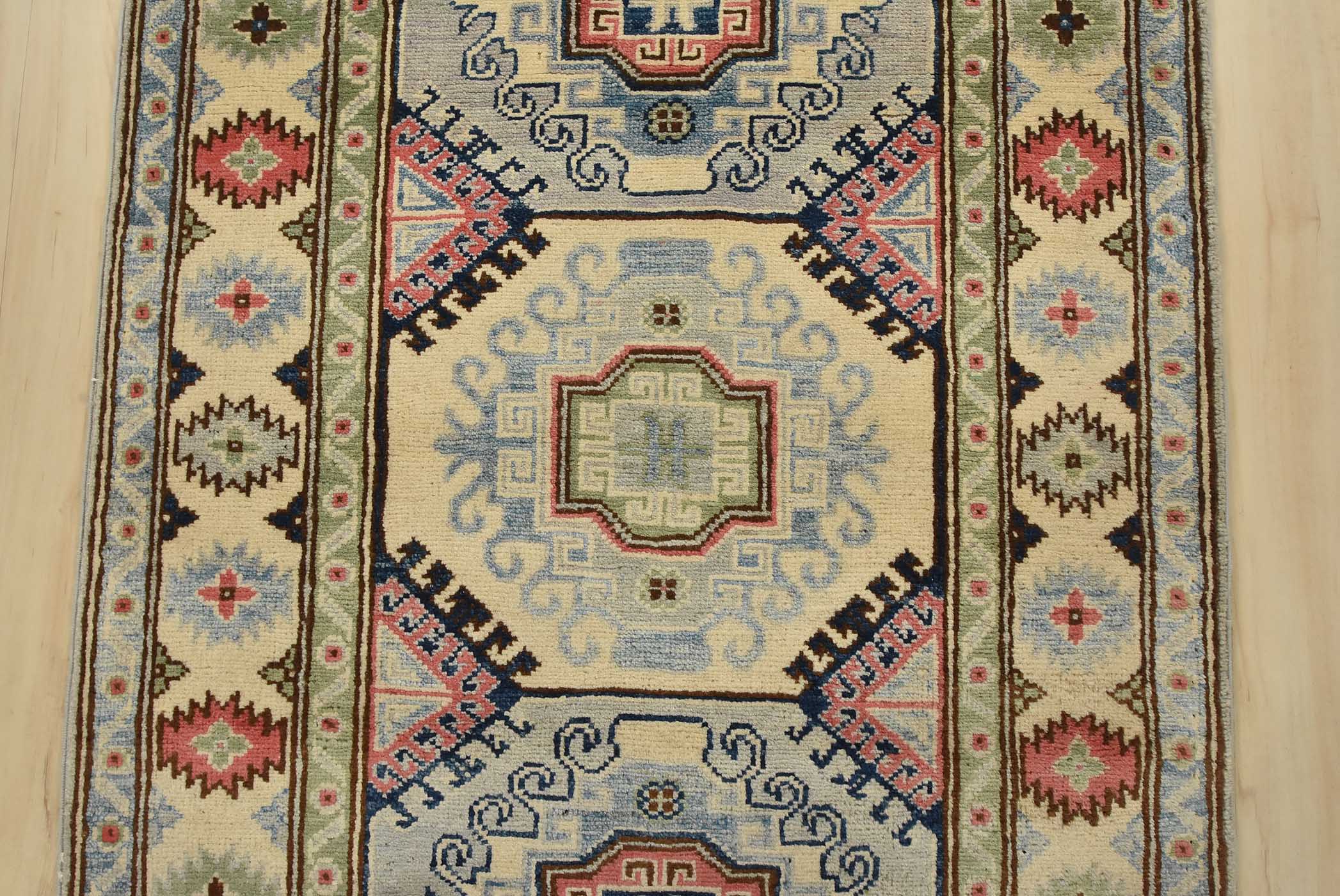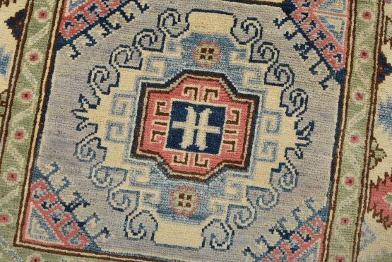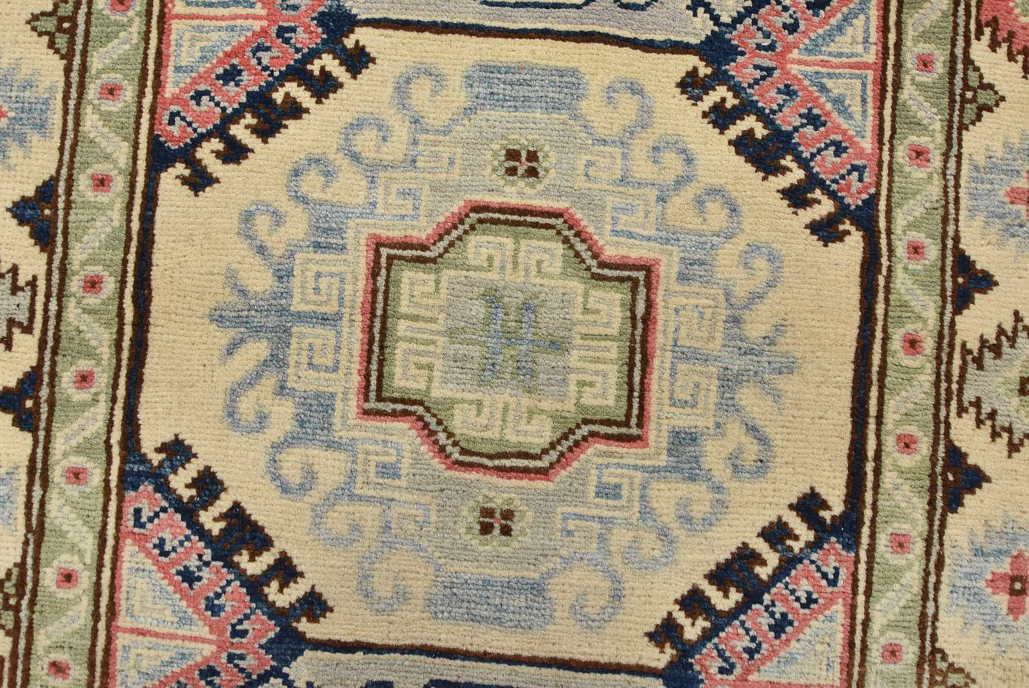 A tribal Caucasian Kazak runner hand-knotted with fine wool on a cotton foundation. This rug features a row of geometric medallions. It is new and in excellent condition.
