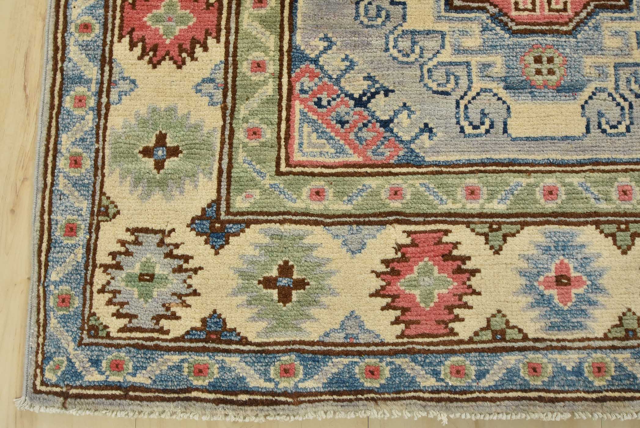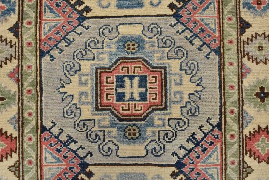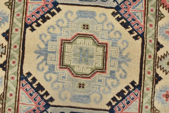 Original antique Kazak rugs from the Caucasus region inspire the creation of new Kazak rugs. These rugs are woven with fine wool using traditional Kazak patterns and finished with a low-cut pile to give them an authentic vintage look.