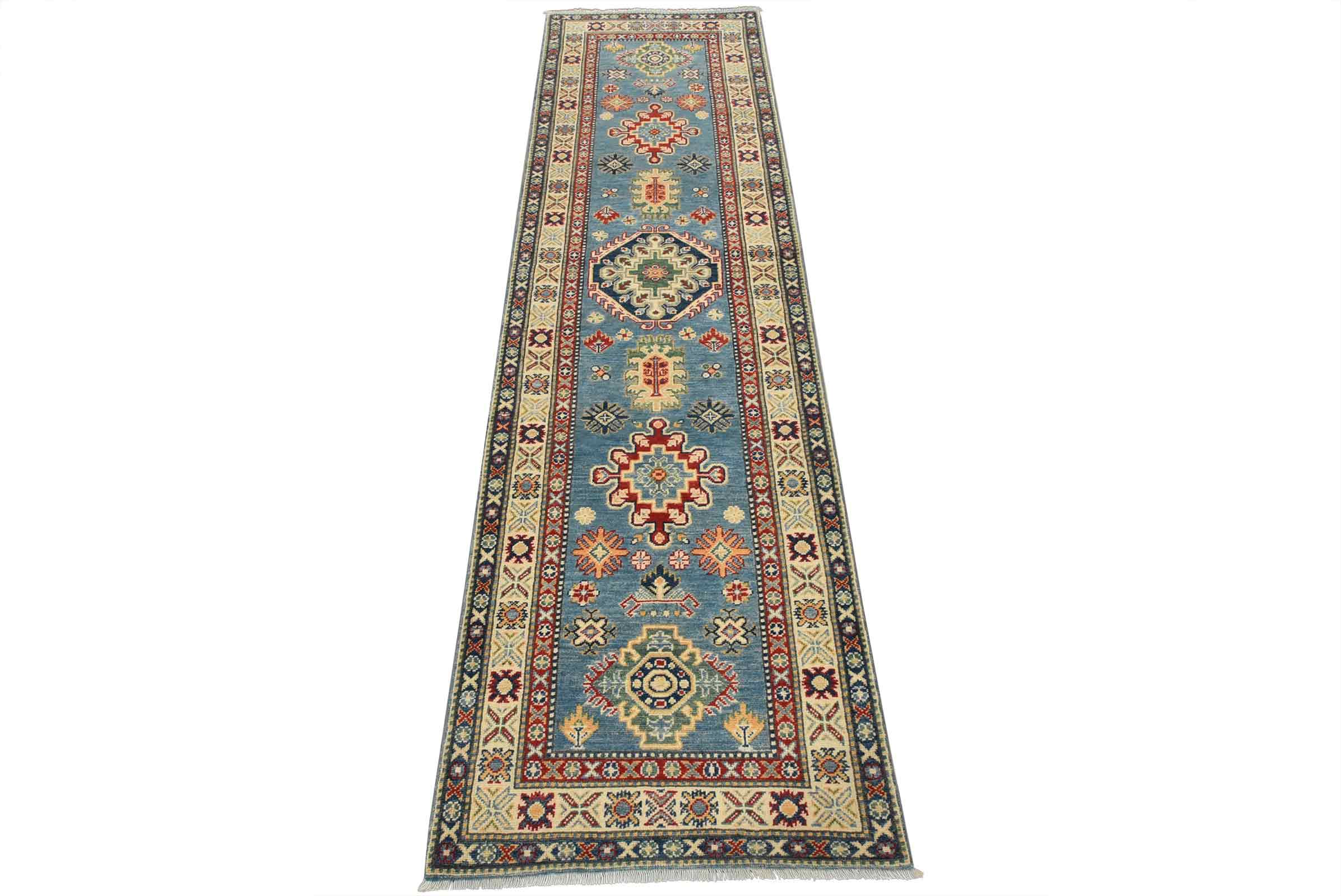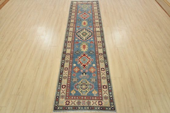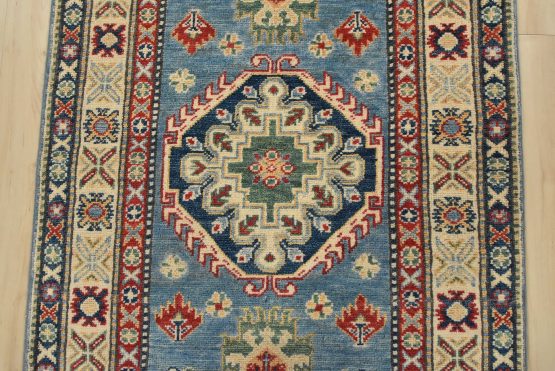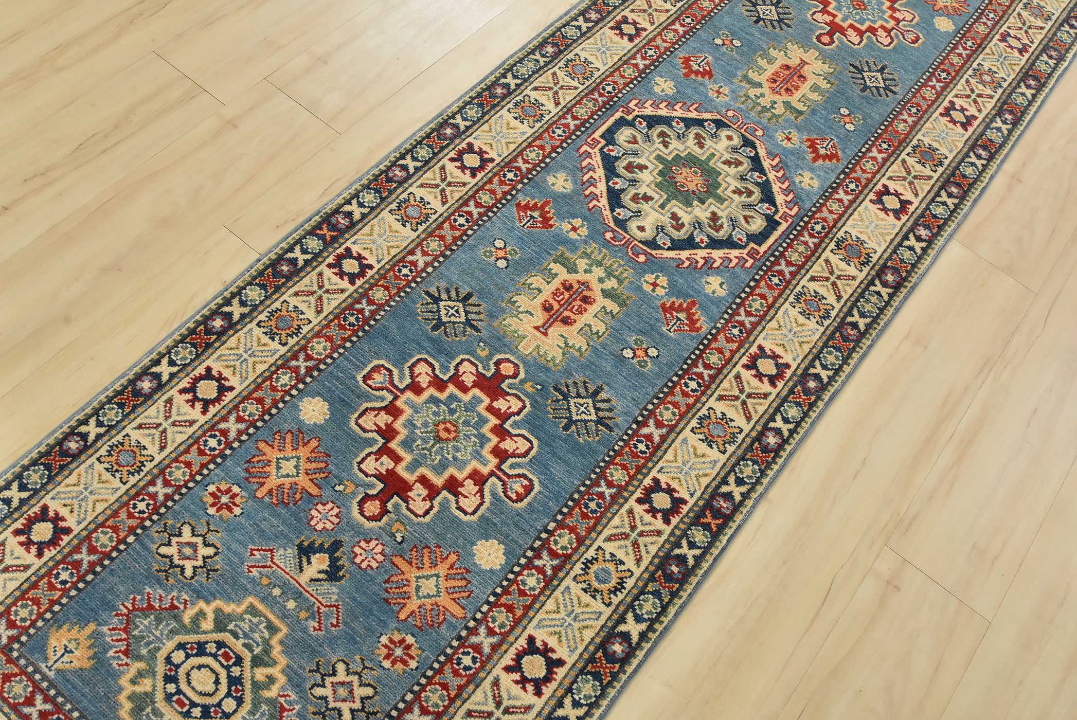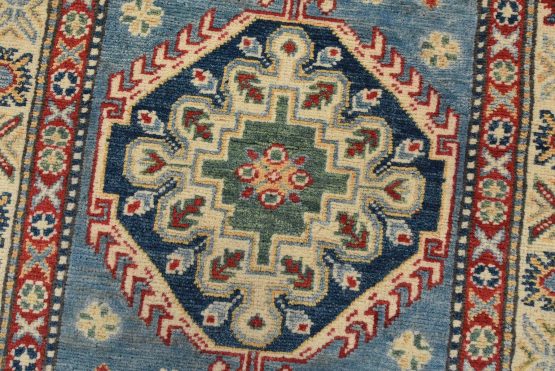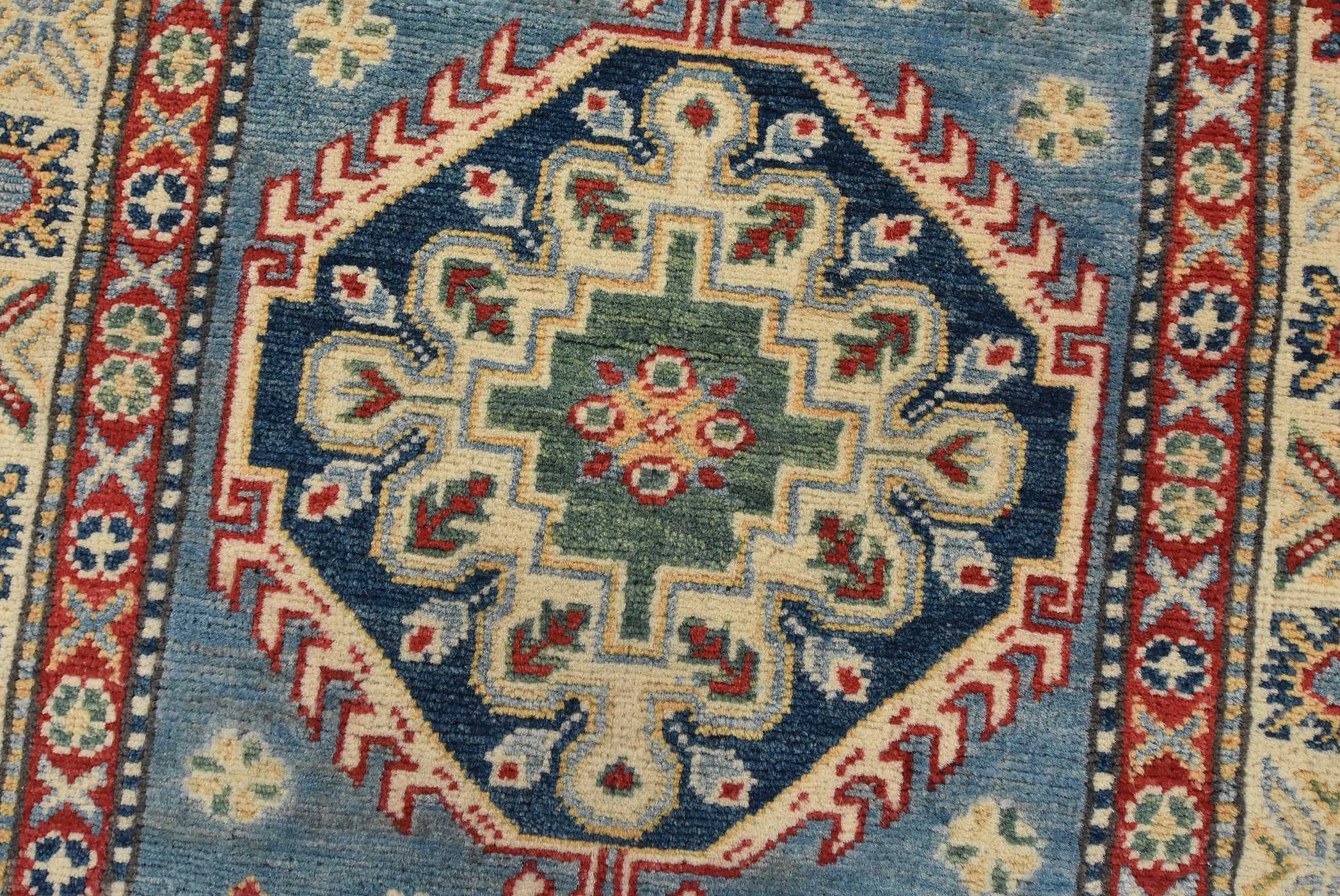 A tribal Caucasian Kazak runner hand-knotted with fine wool on a cotton foundation. This rug features a row of medallions surrounded by small geometric motifs set against a blue background. It is new and in excellent condition.