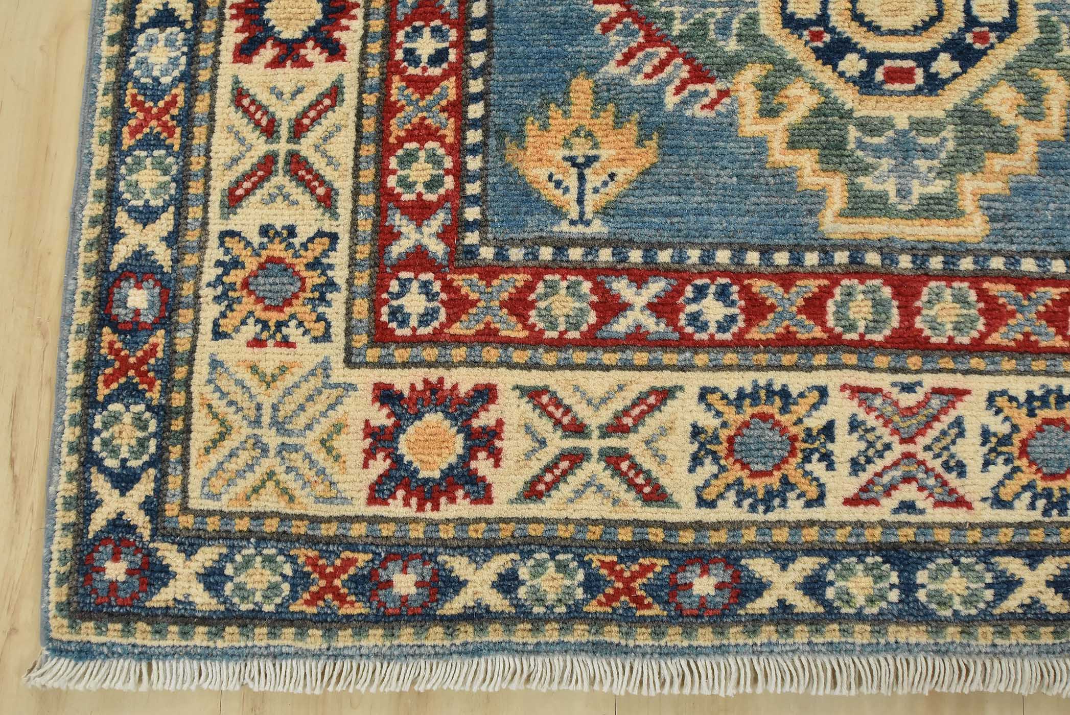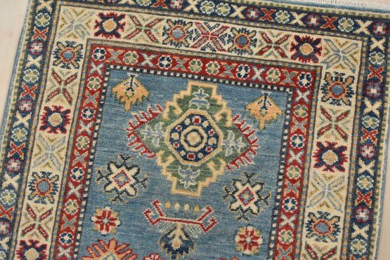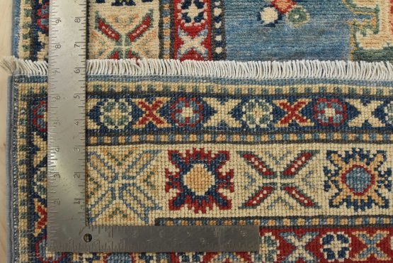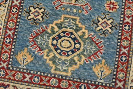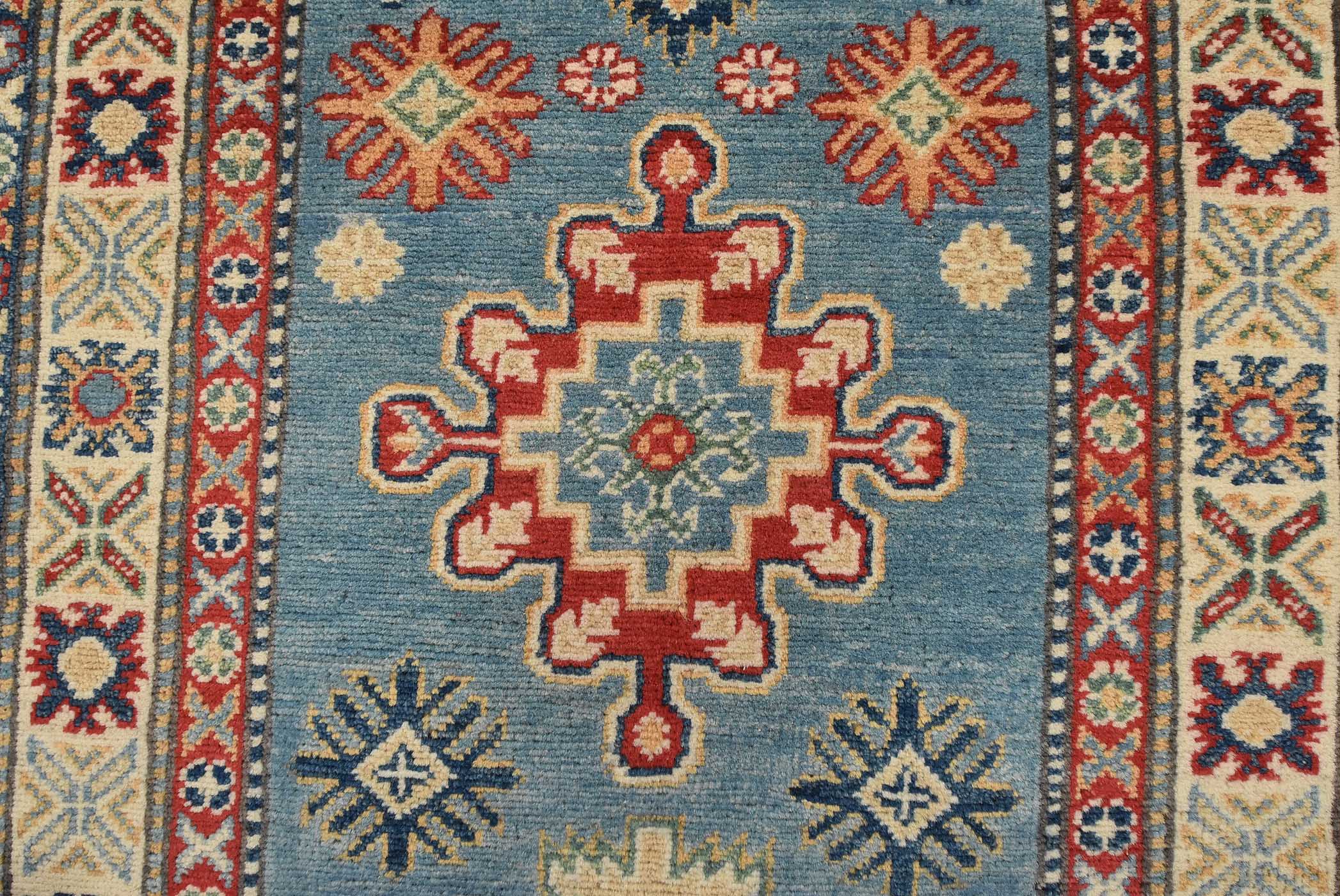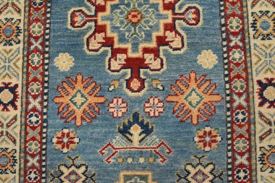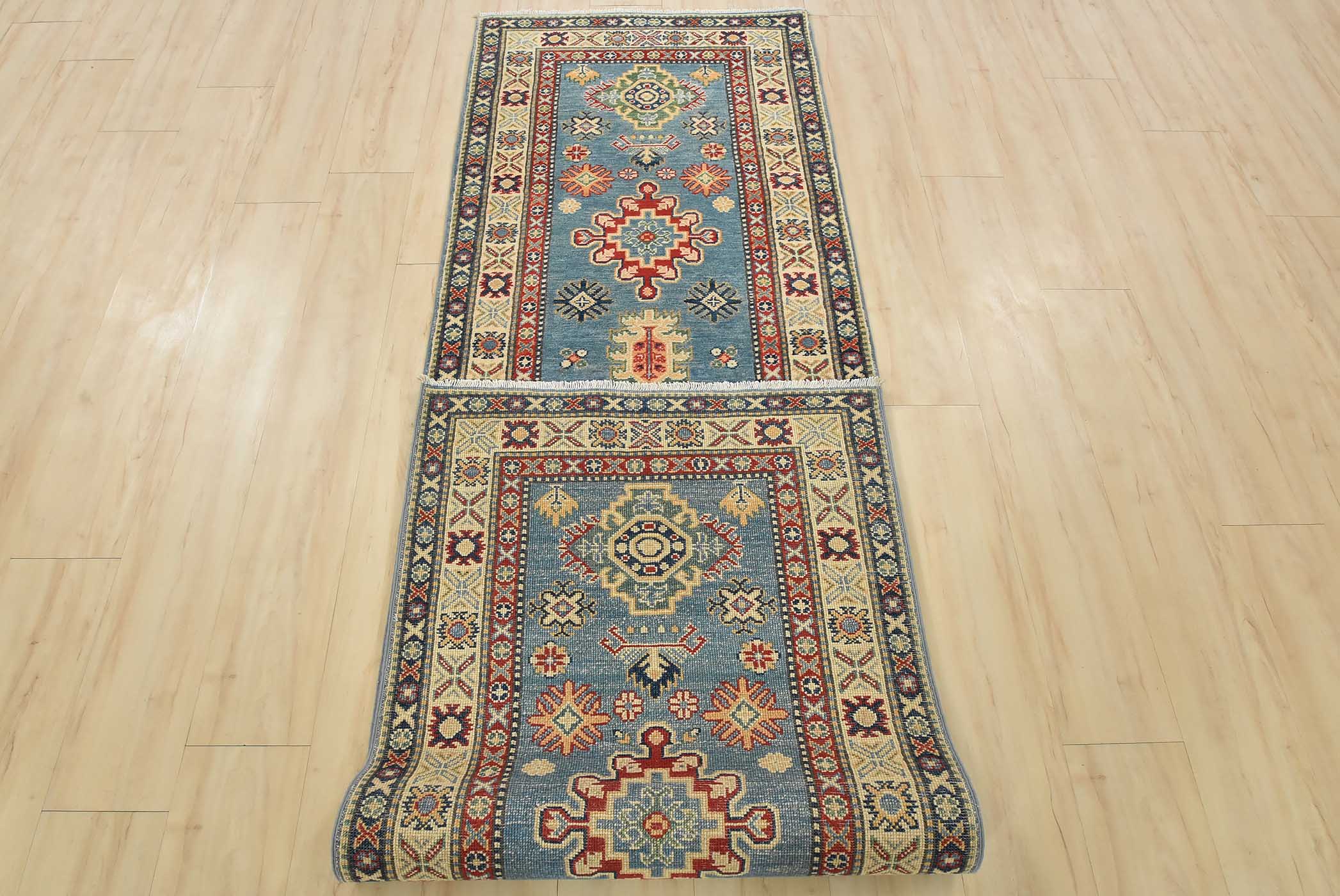 A tribal Caucasian Kazak runner hand-knotted with fine wool on a cotton foundation. This rug features a row of medallions surrounded by small geometric motifs set against a blue background. It is new and in excellent condition.