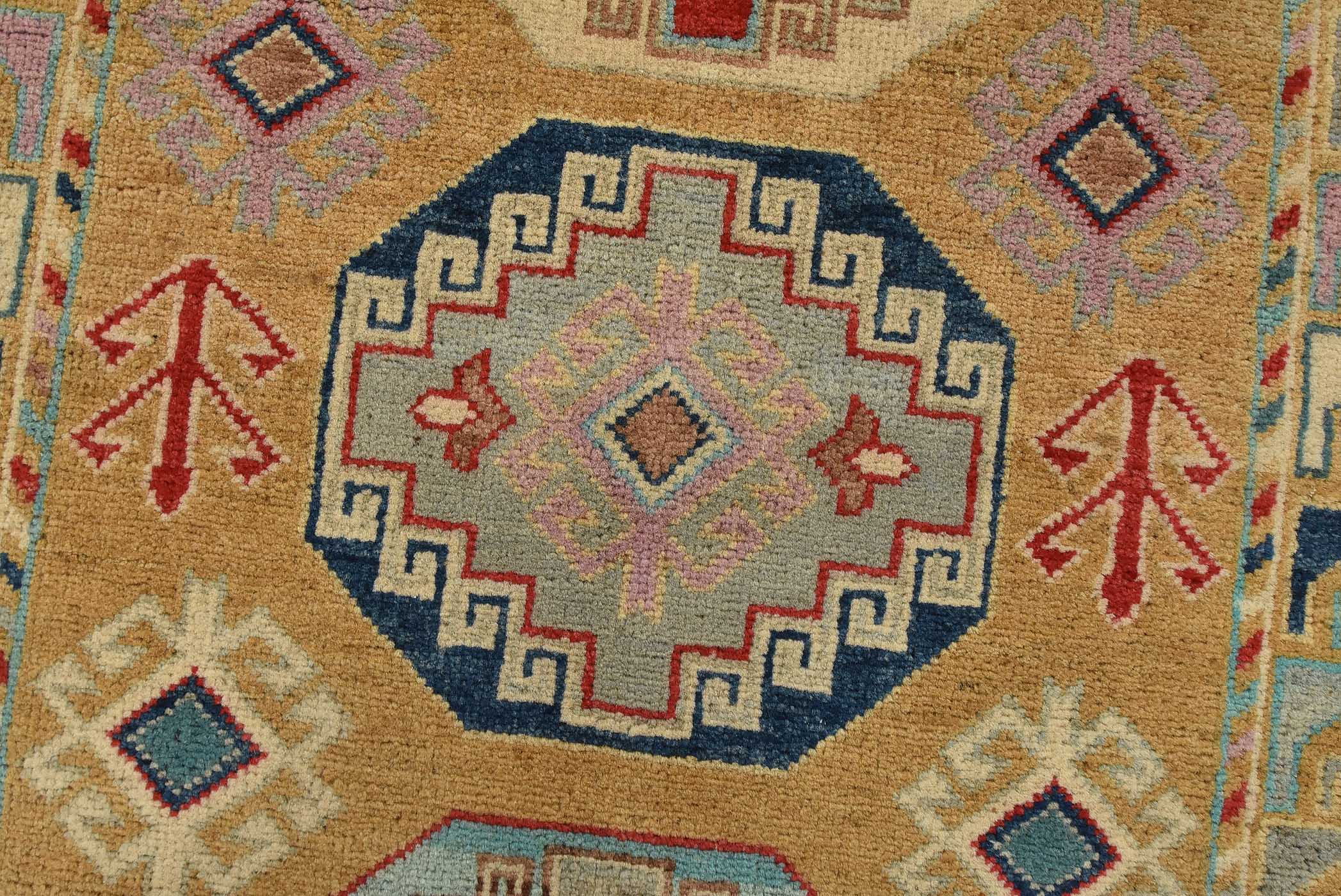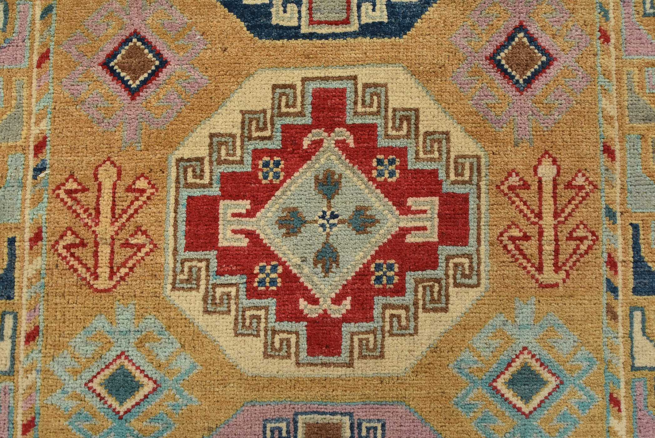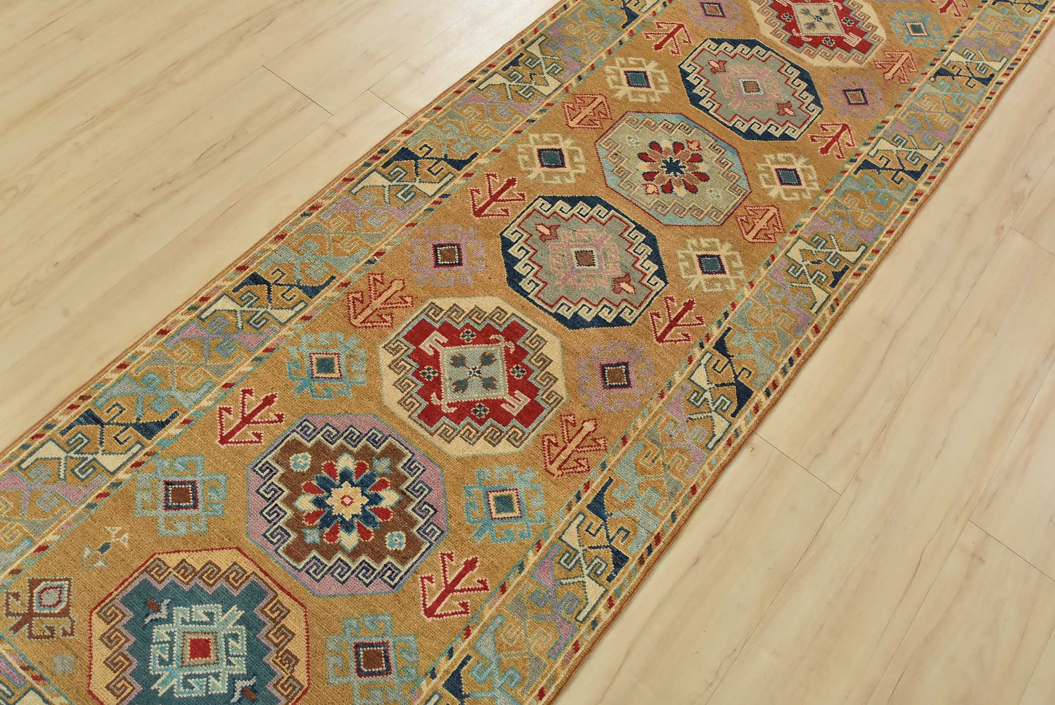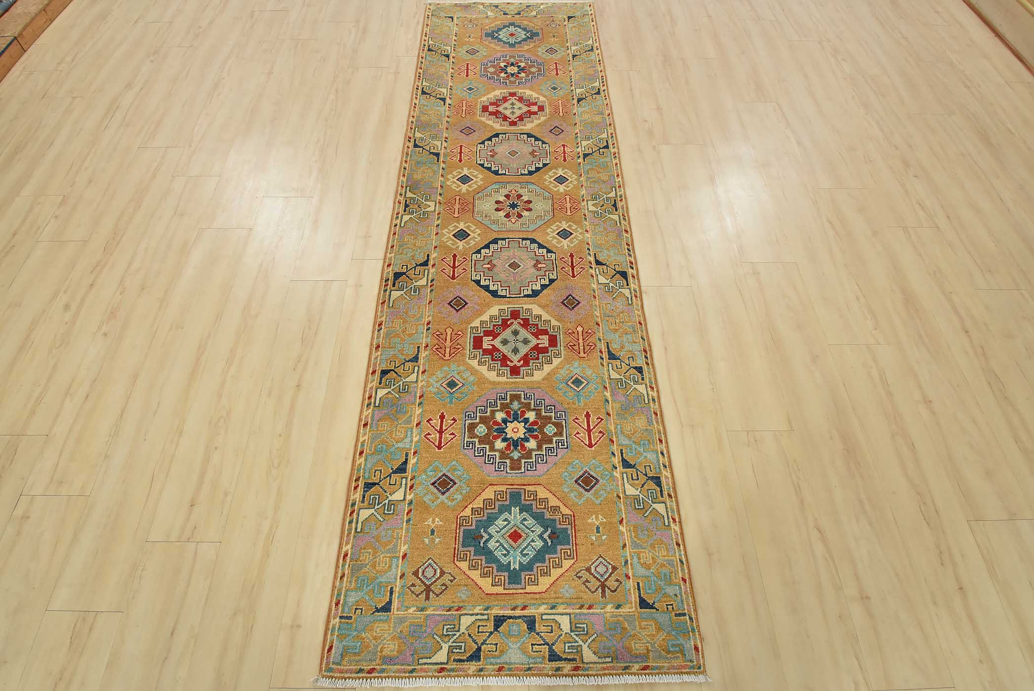 A tribal Caucasian Kazak runner hand-knotted with fine wool on a cotton foundation. This rug features a row of geometric medallions surrounded by small geometric motifs set against a brown background. It is new and in excellent condition.