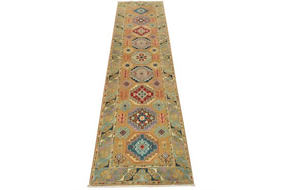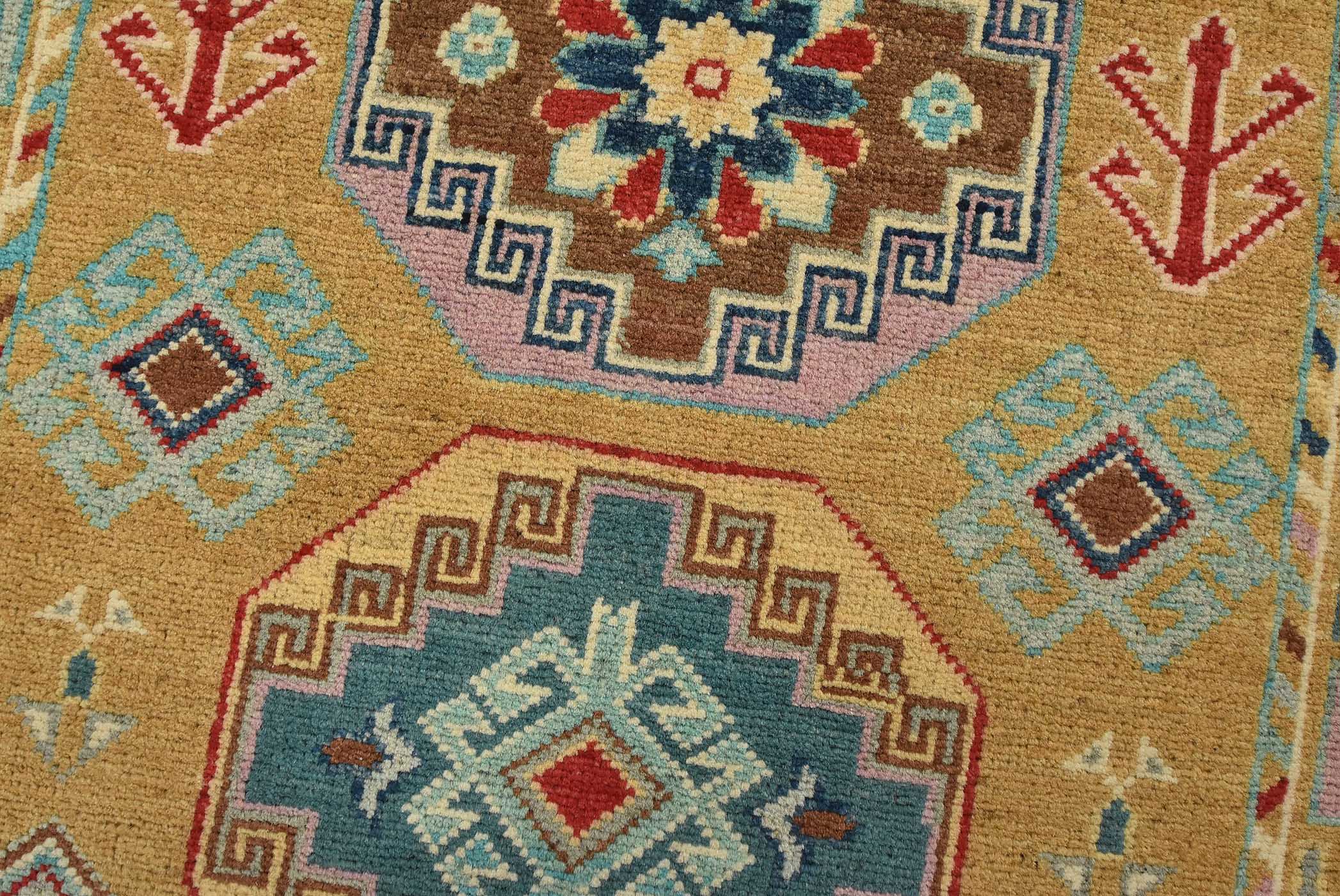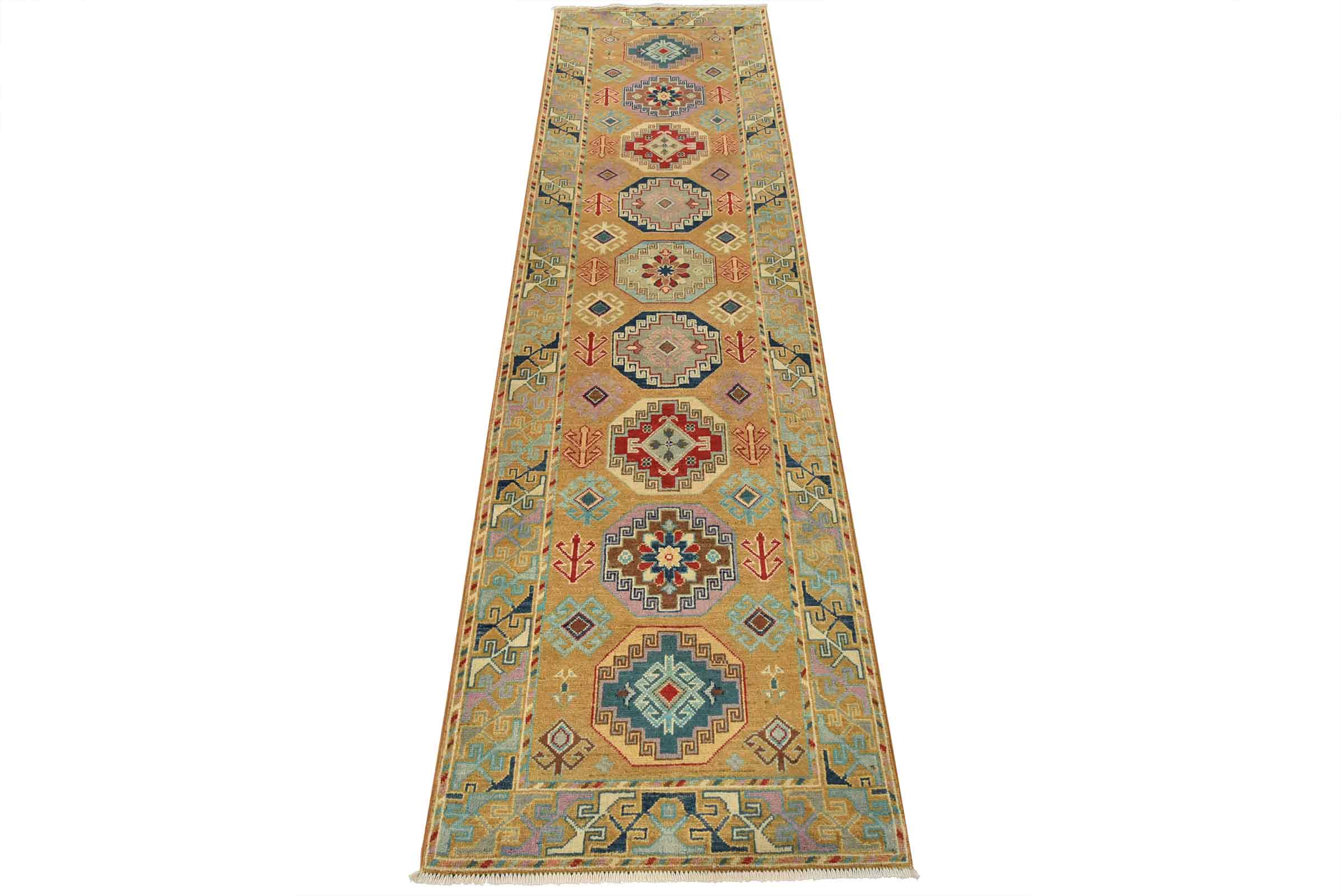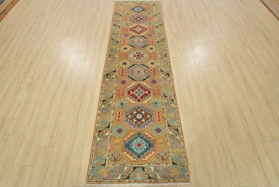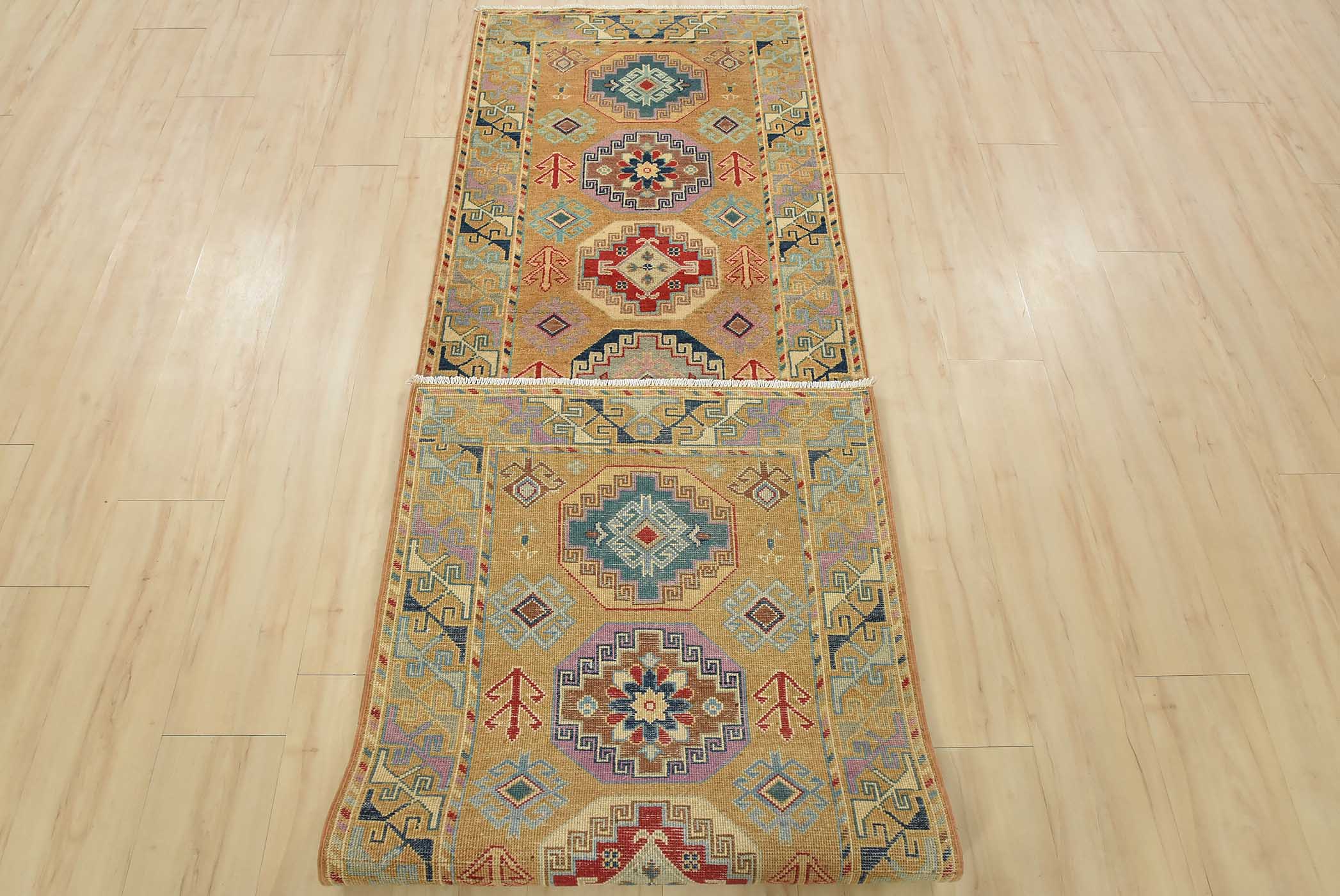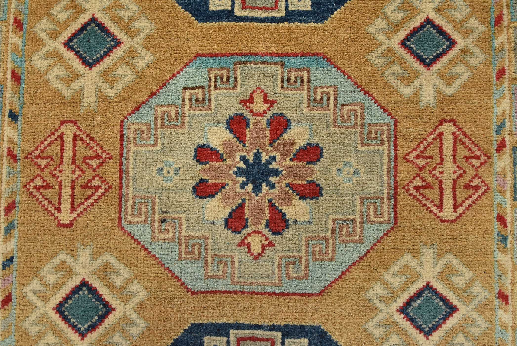 A tribal Caucasian Kazak runner hand-knotted with fine wool on a cotton foundation. This rug features a row of geometric medallions surrounded by small geometric motifs set against a brown background. It is new and in excellent condition.