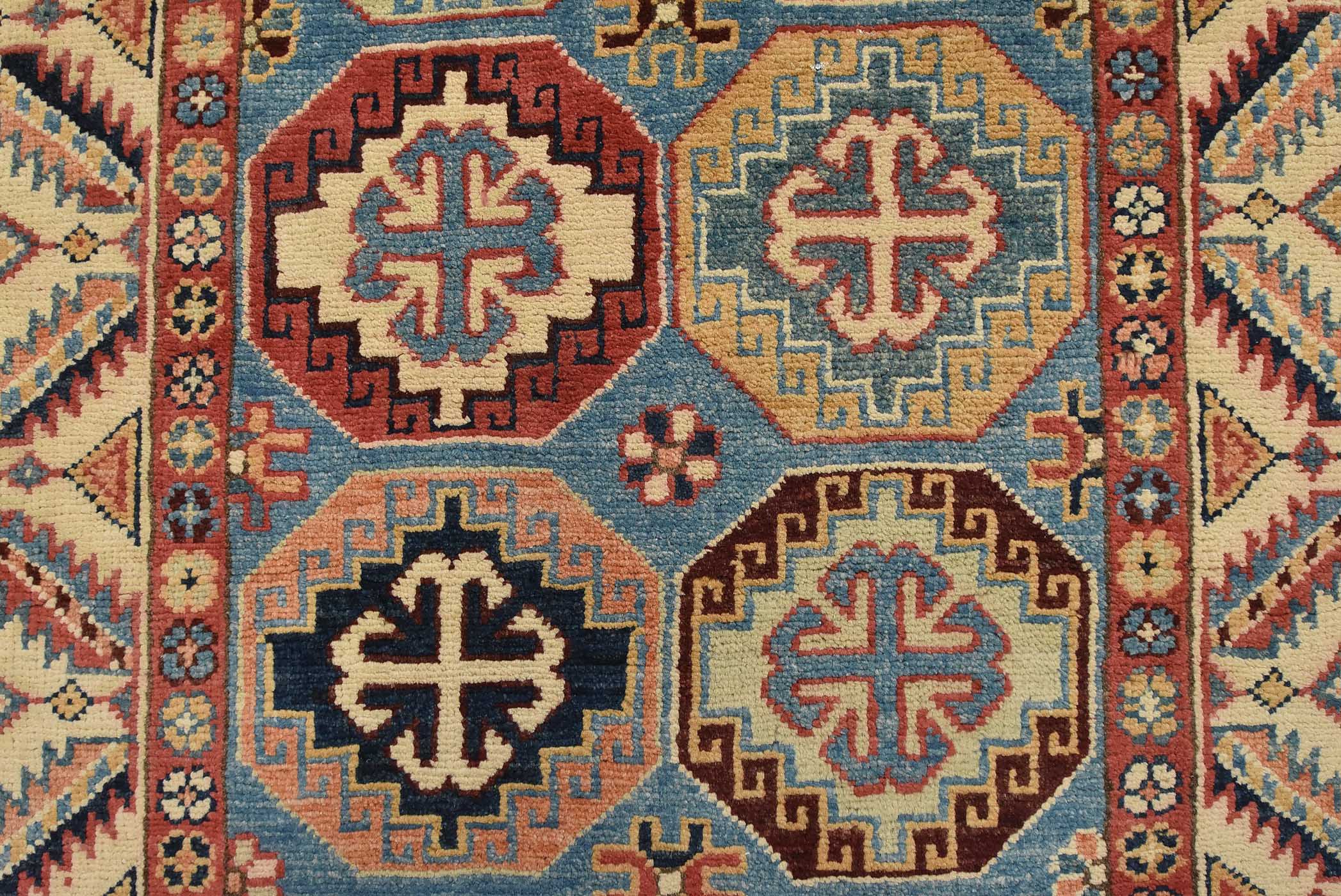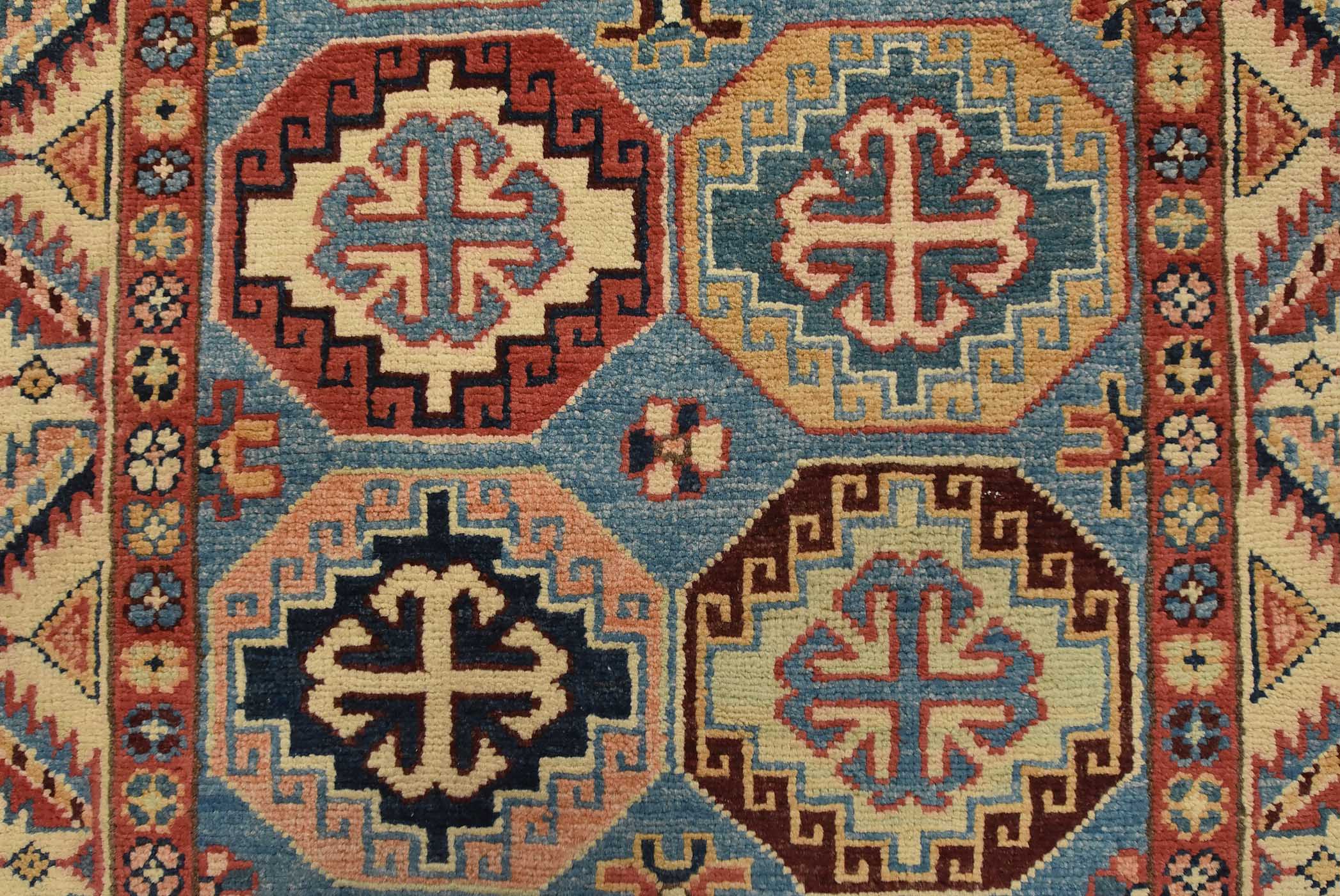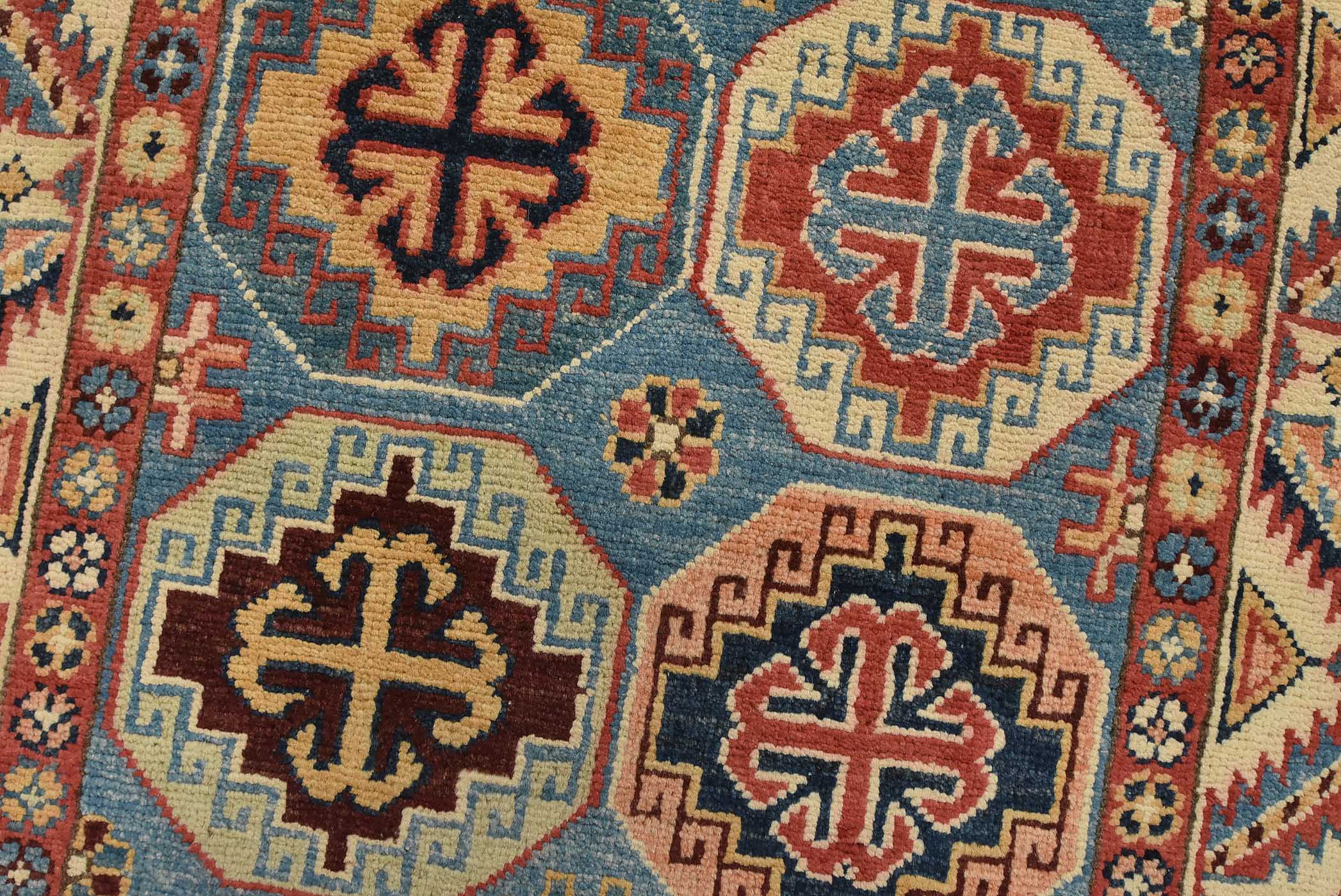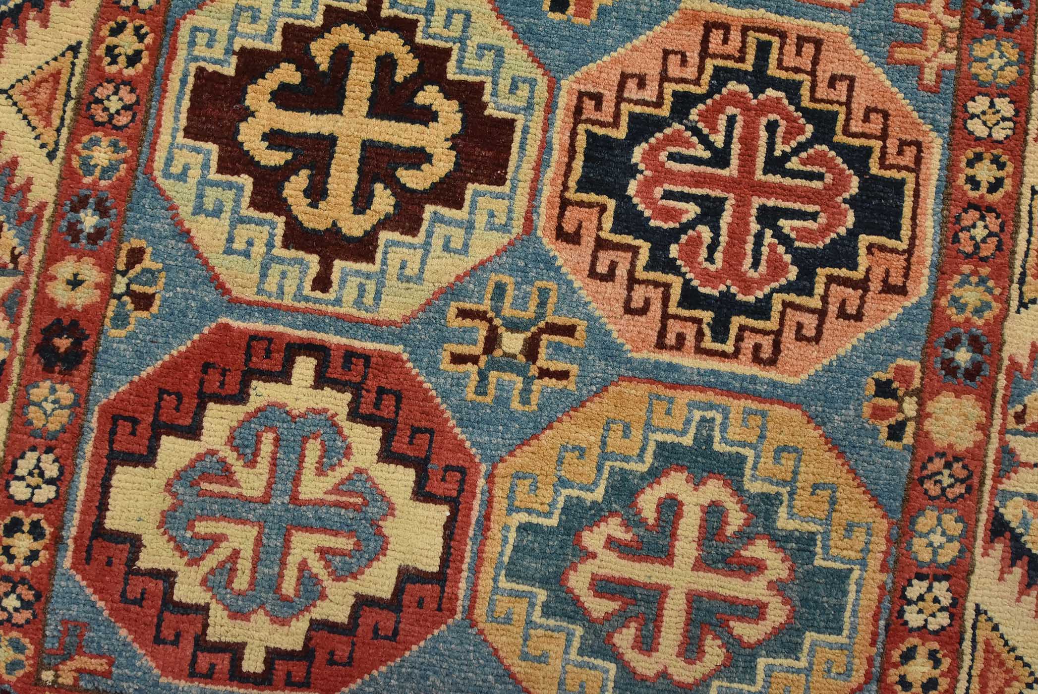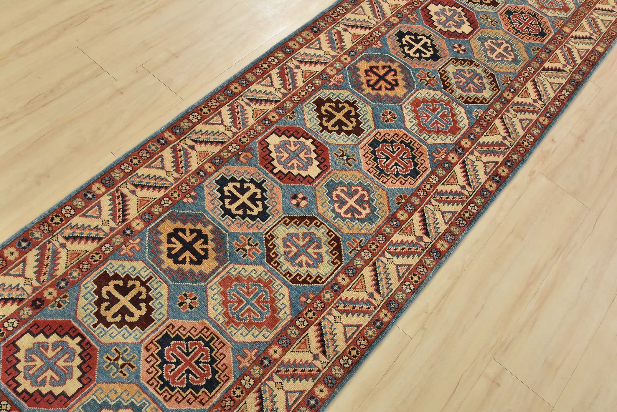 A tribal Caucasian Kazak runner hand-knotted with fine wool on a cotton foundation. This runner features rows of small medallions set against a blue background. It is new and in excellent condition.