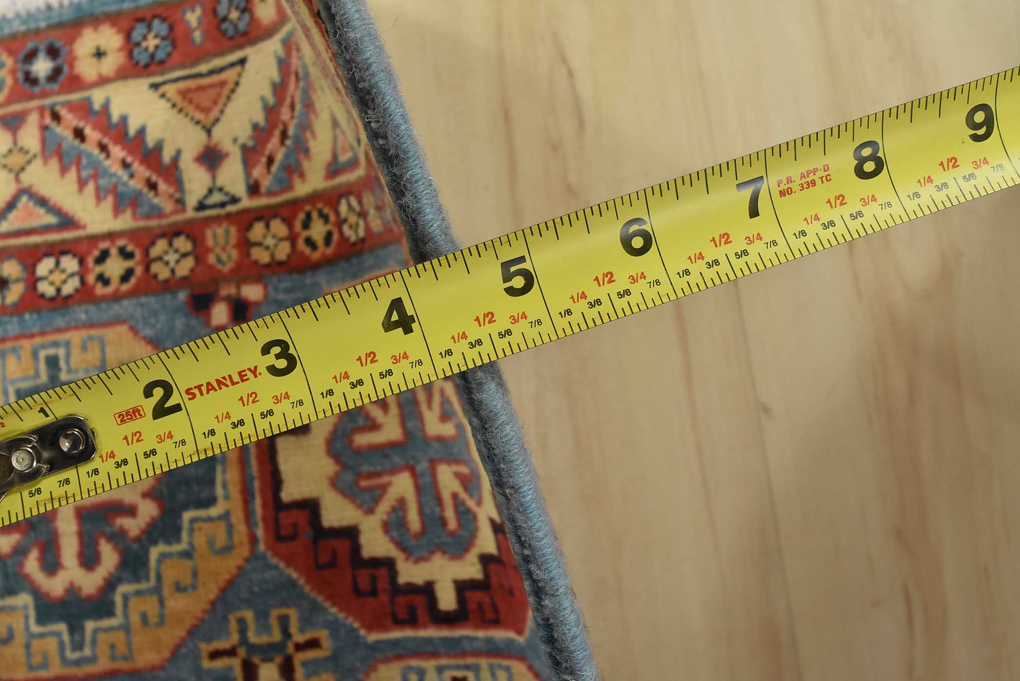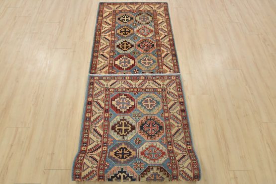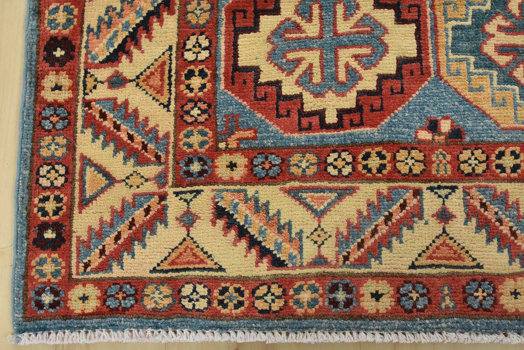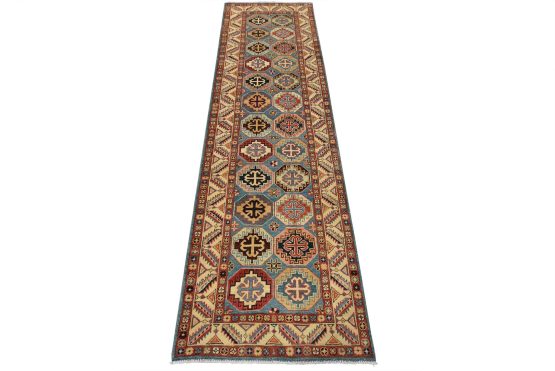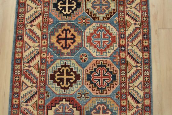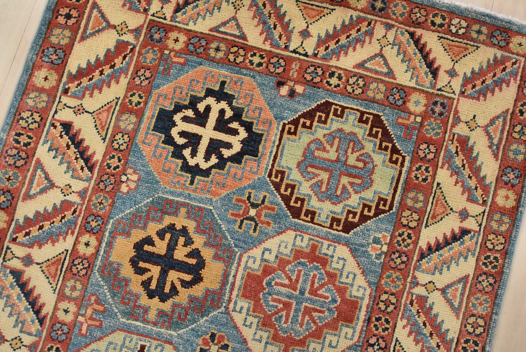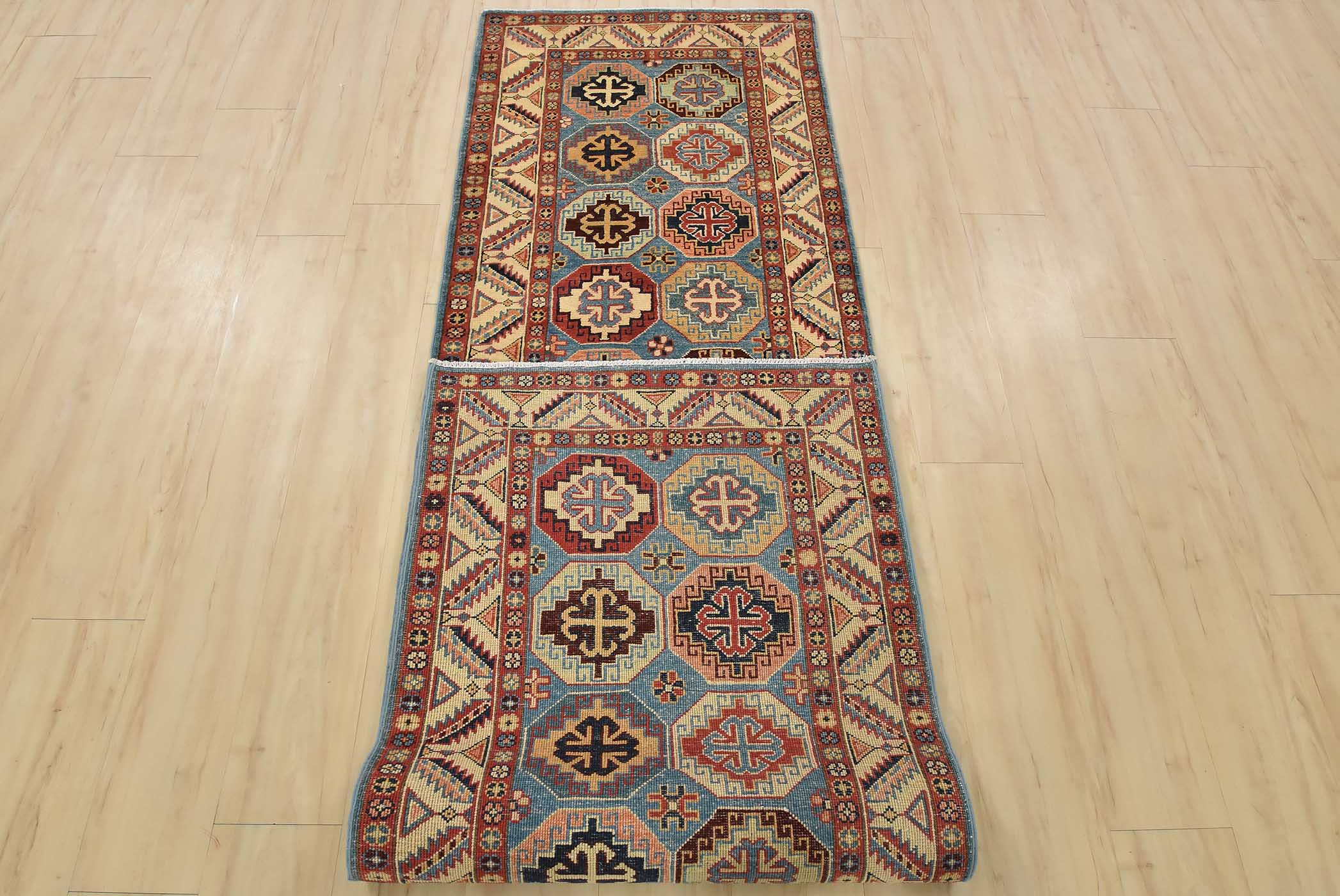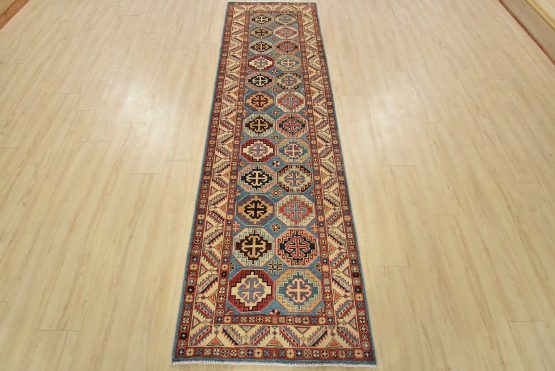 A tribal Caucasian Kazak runner hand-knotted with fine wool on a cotton foundation. This runner features rows of small medallions set against a blue background. It is new and in excellent condition.