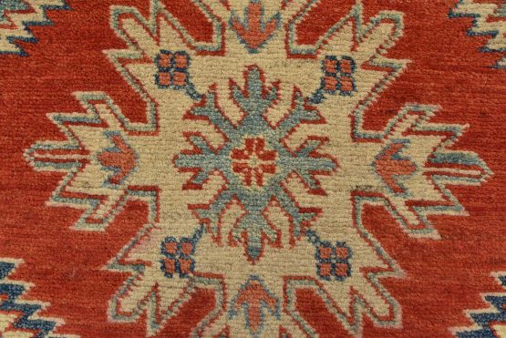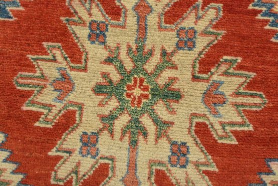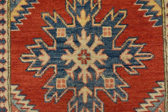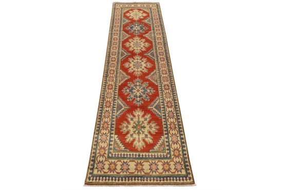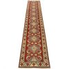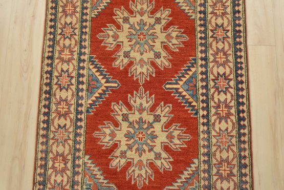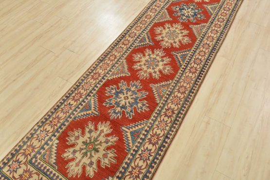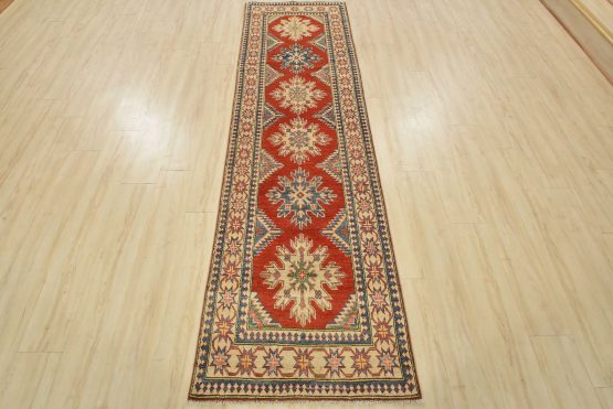 A tribal Caucasian Kazak runner hand-knotted with an all-wool pile on a cotton foundation. This oriental rug features rows of geometric medallions set against a red background. It is new and in excellent condition.