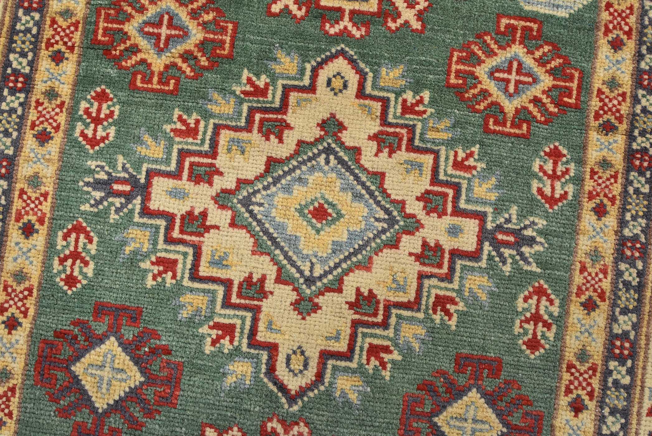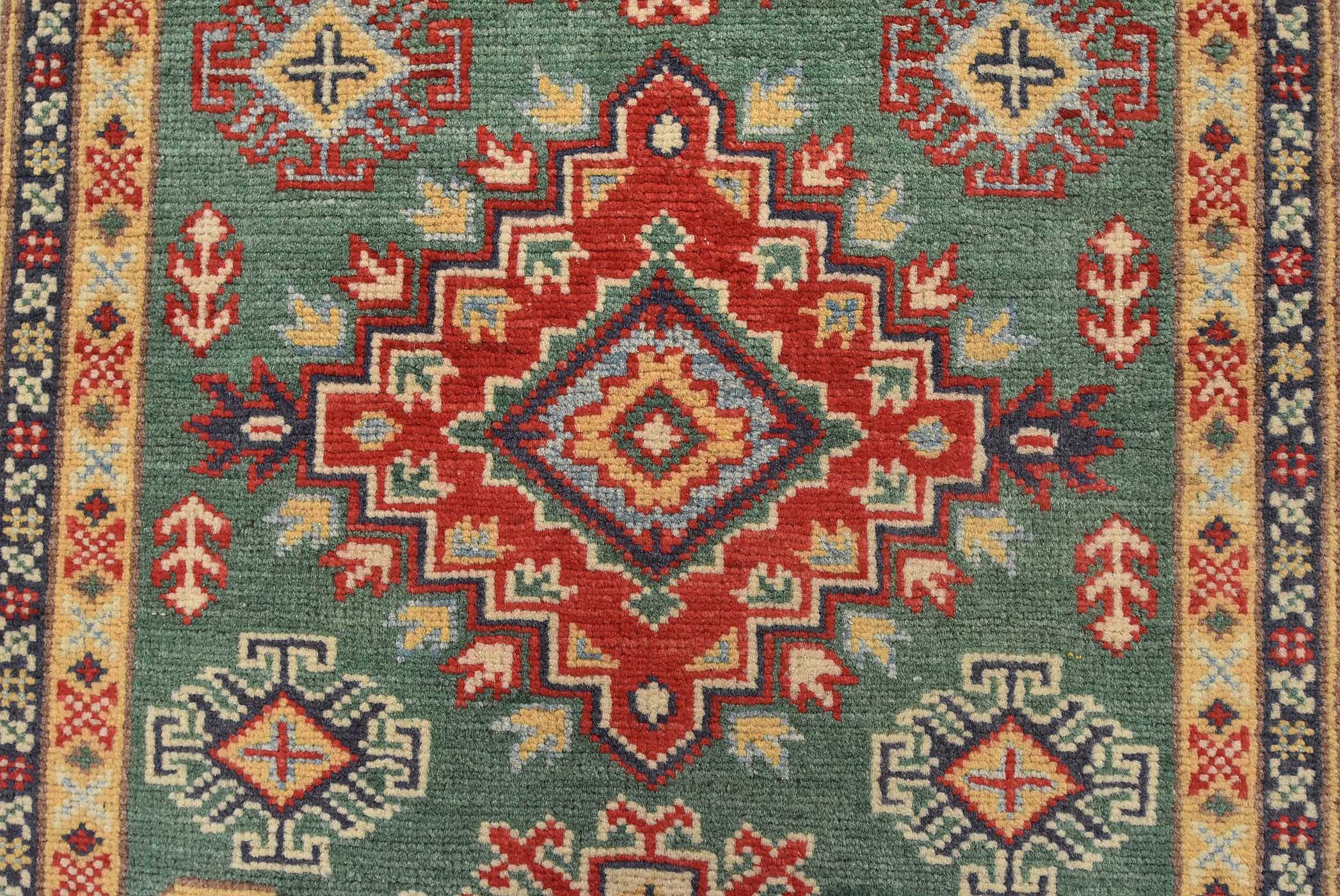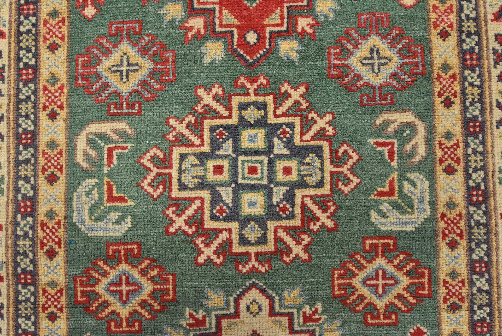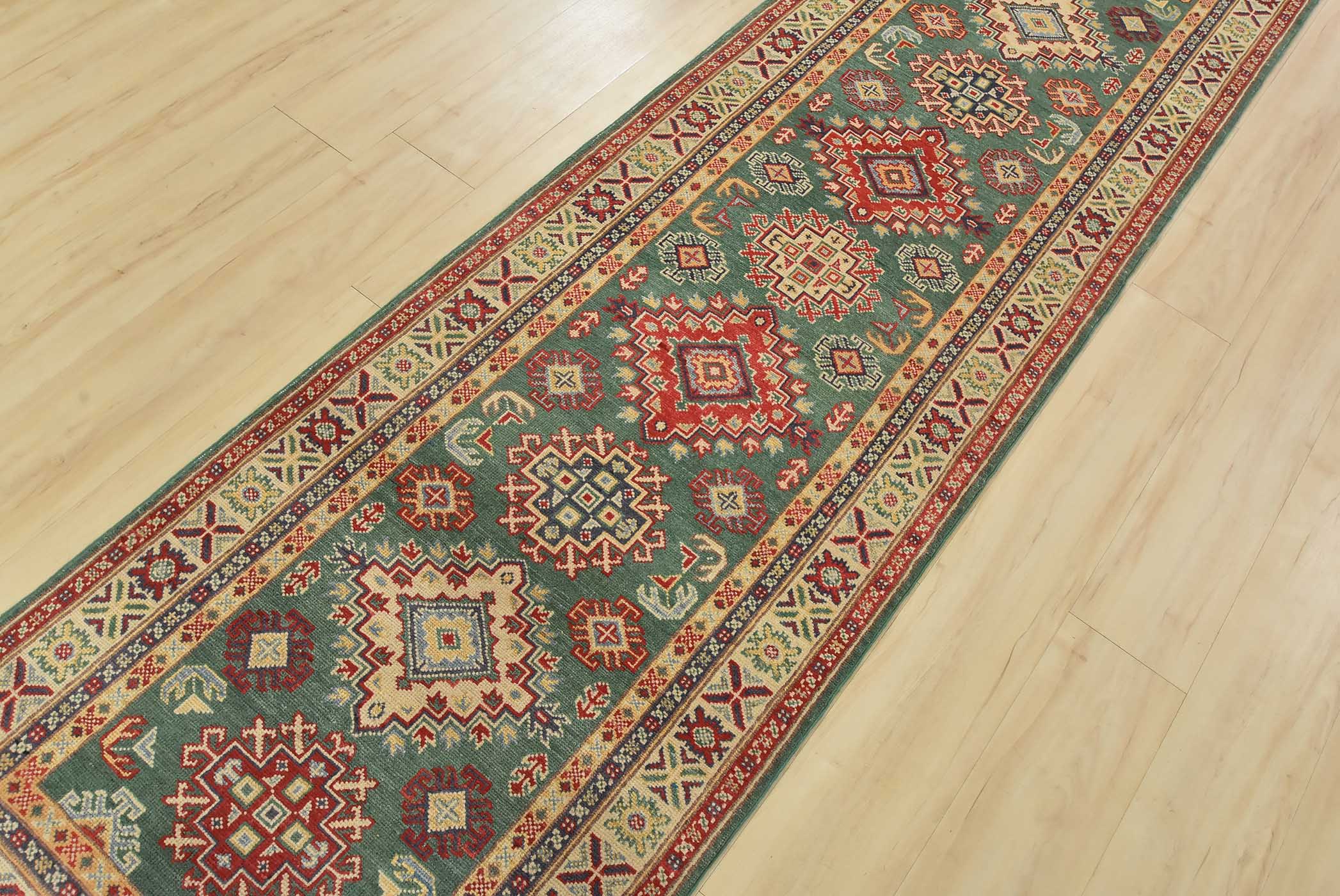 A tribal Caucasian Kazak runner hand-knotted with fine wool on a cotton foundation. This rug features a row of geometric medallions surrounded by by small geometric motifs set against a green background. It is new and in excellent condition.