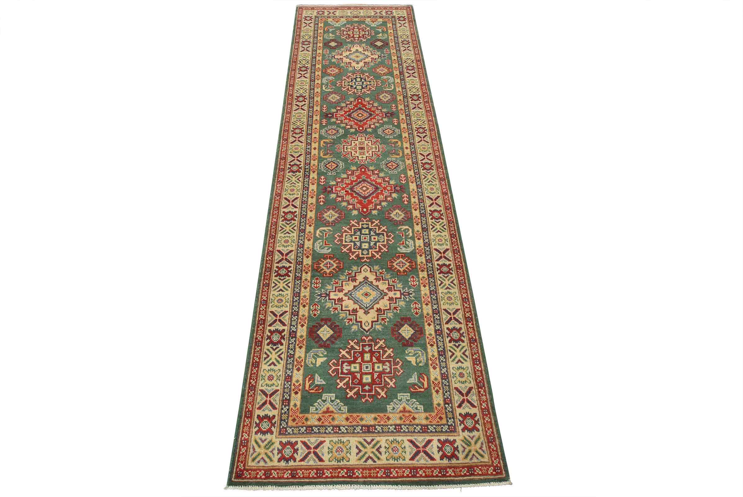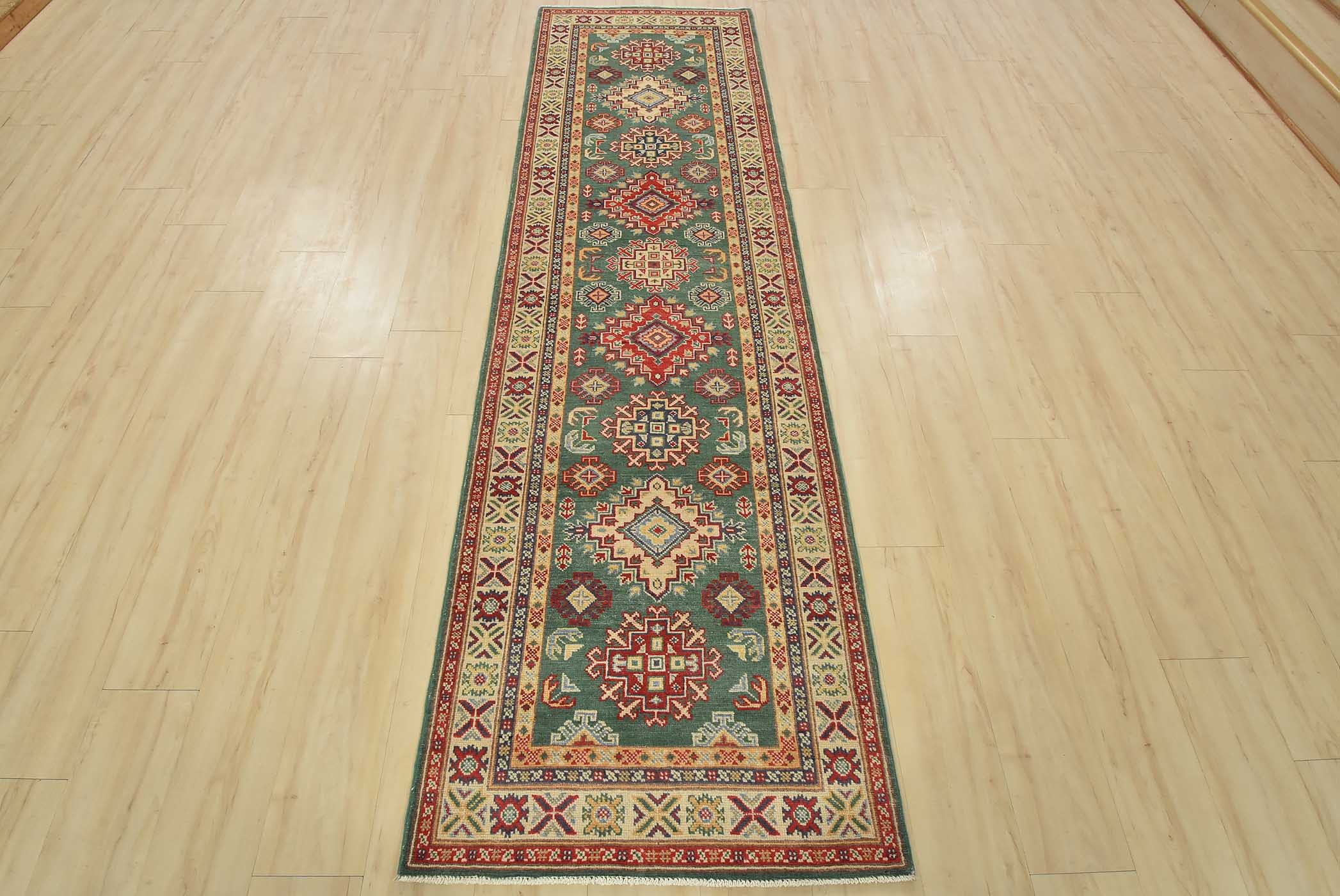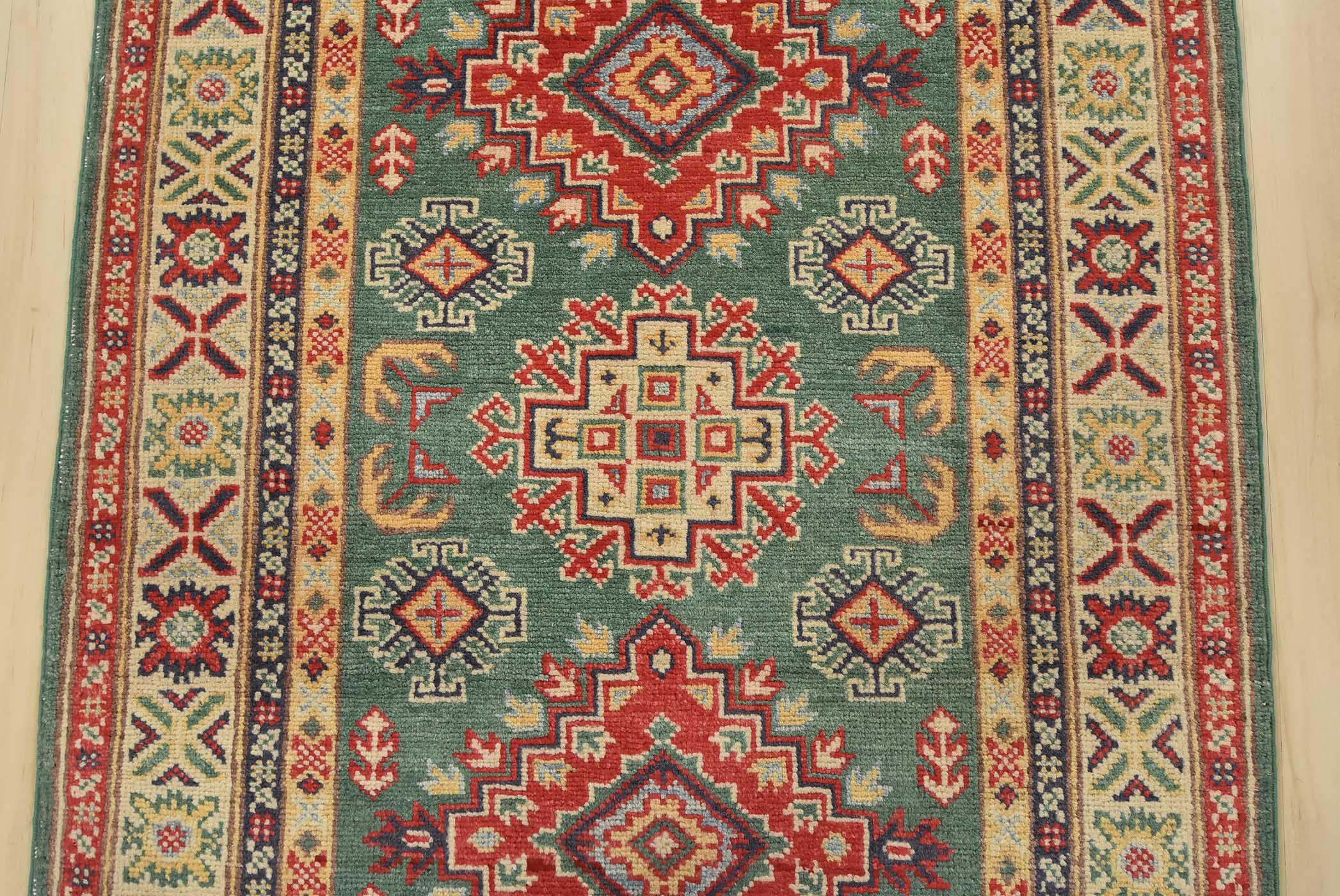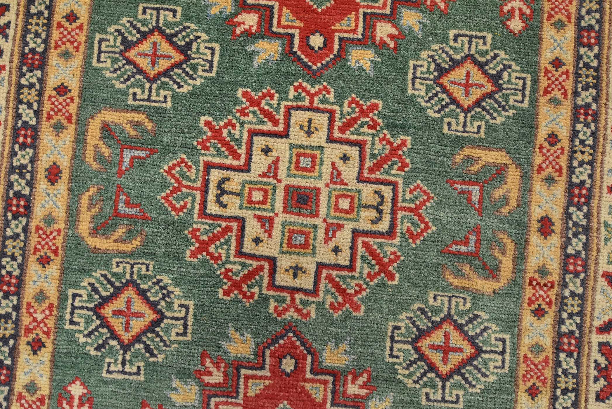 A tribal Caucasian Kazak runner hand-knotted with fine wool on a cotton foundation. This rug features a row of geometric medallions surrounded by by small geometric motifs set against a green background. It is new and in excellent condition.