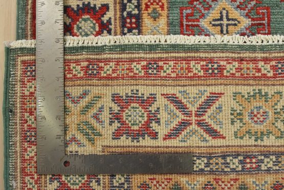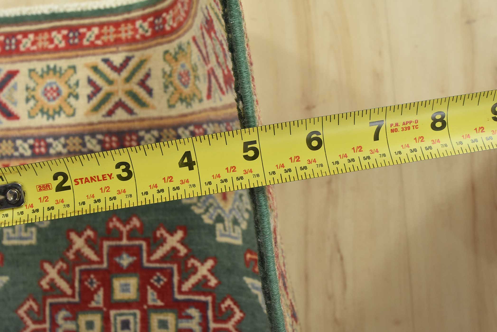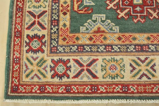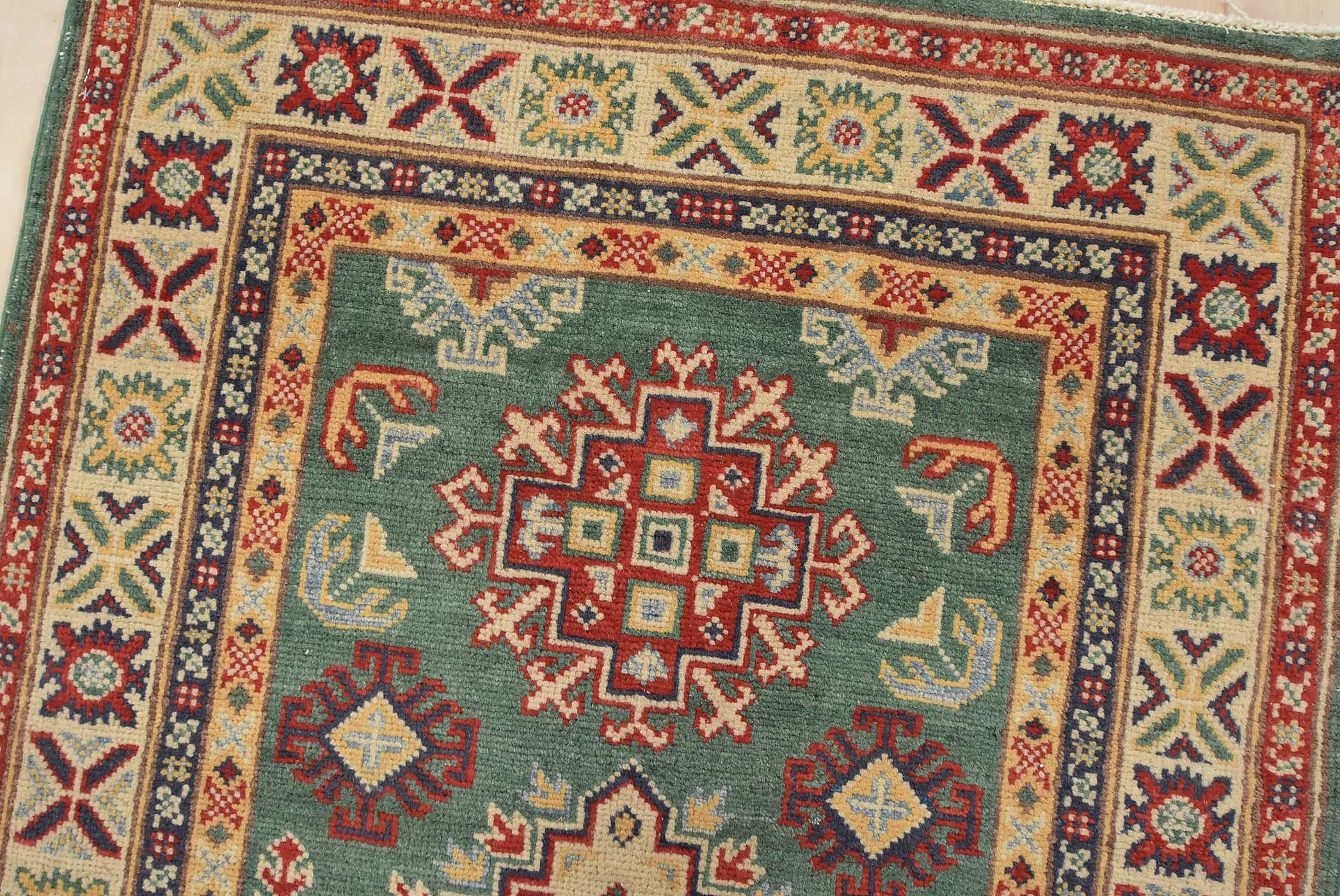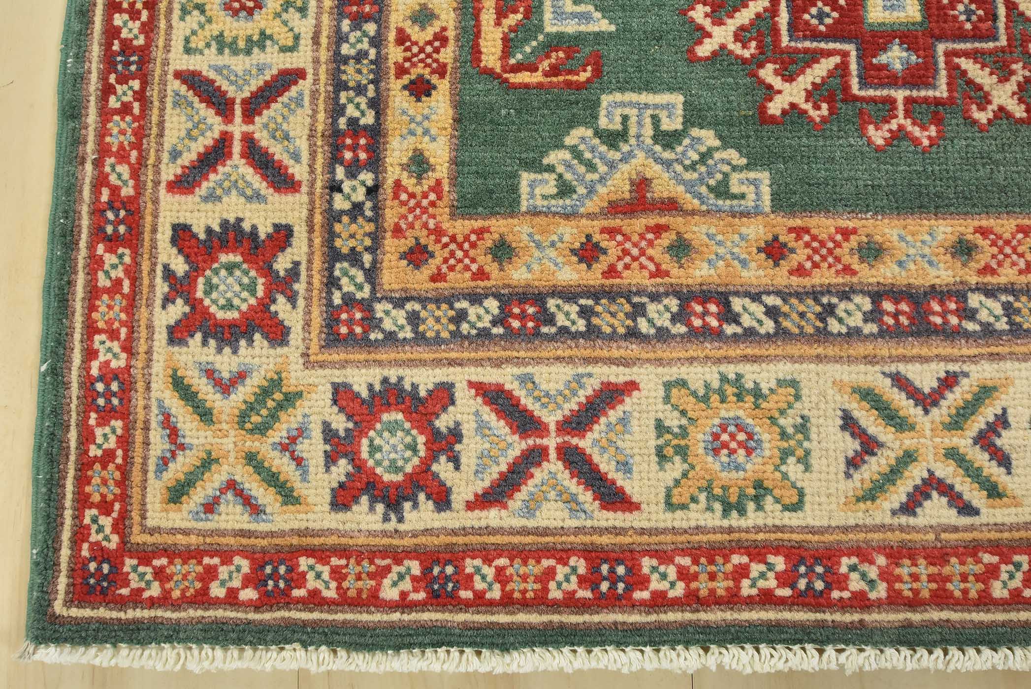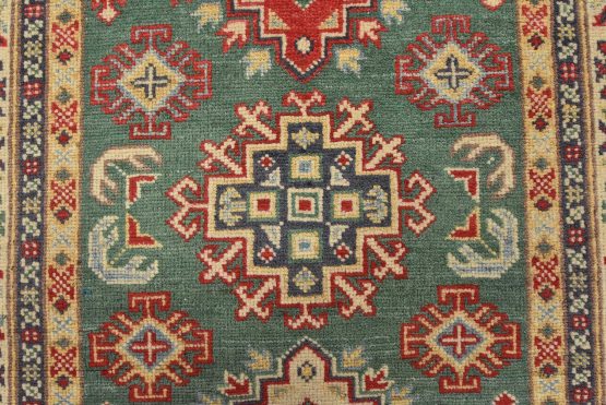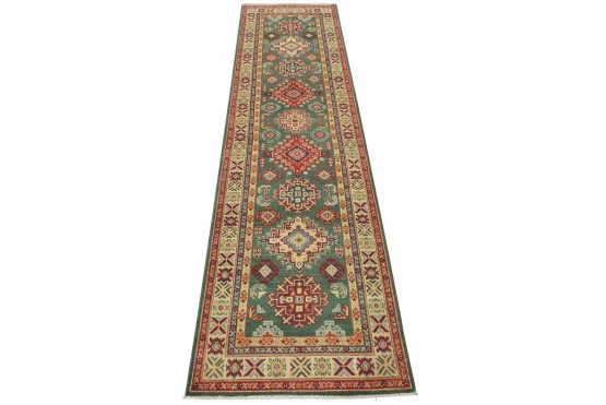 A tribal Caucasian Kazak runner hand-knotted with fine wool on a cotton foundation. This rug features a row of geometric medallions surrounded by by small geometric motifs set against a green background. It is new and in excellent condition.