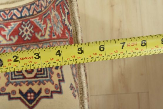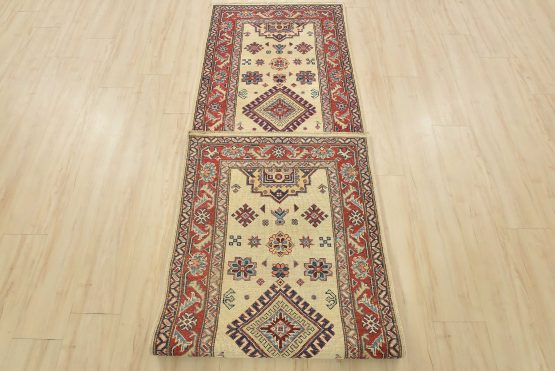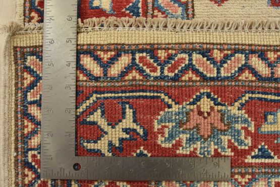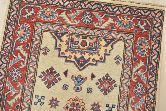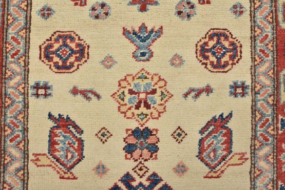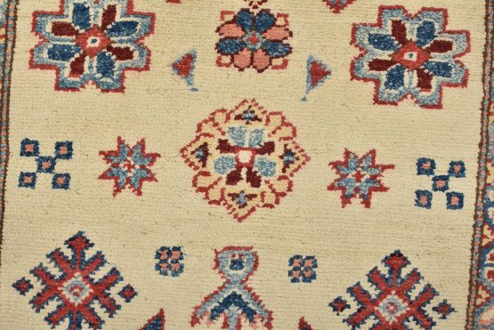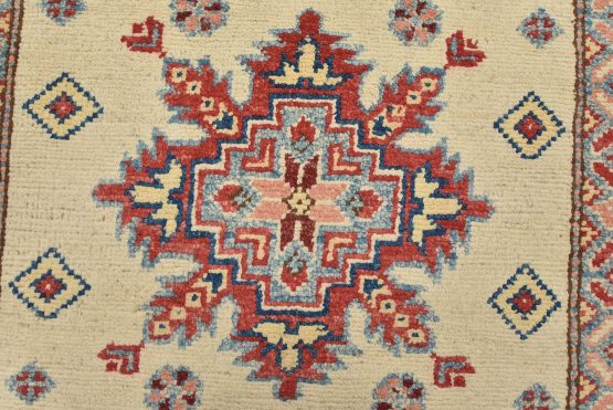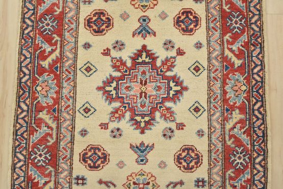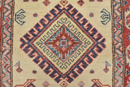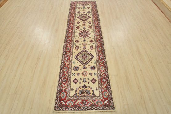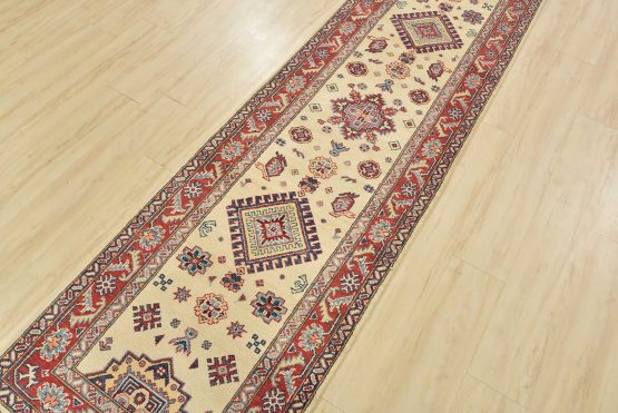 A tribal Caucasian Kazak runner hand-knotted with an all-wool pile on a cotton foundation. This oriental rug features geometric medallions surrounded by geometric motifs set against a beige background. It is new and in excellent condition.