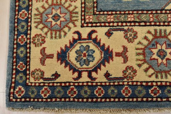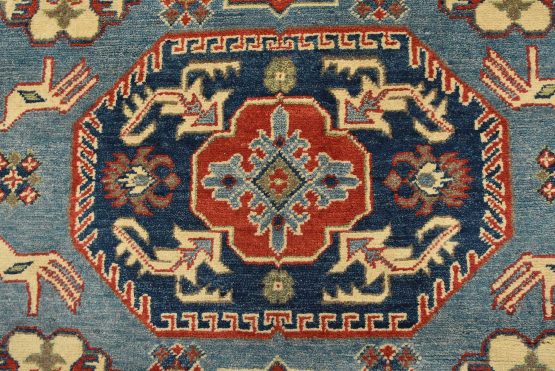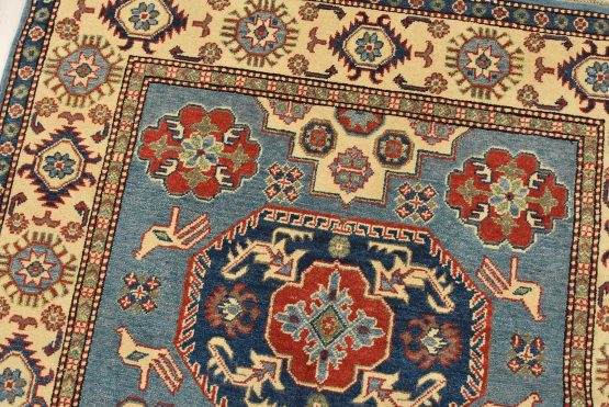 A traditional tribal Caucasian Kazak runner hand-knotted with an all-wool pile on a cotton foundation. This oriental rug features a row of geometric medallions surrounded by floral motifs and bird figures set against a blue background. It is new and in excellent condition.