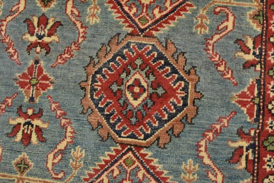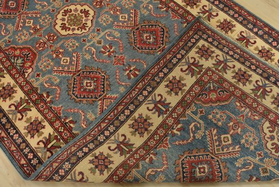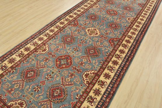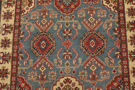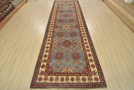 A traditional tribal Caucasian Kazak runner hand-knotted with an all-wool pile on a cotton foundation. This oriental rug features rows of geometric motifs set against a blue background. It is new and in excellent condition.