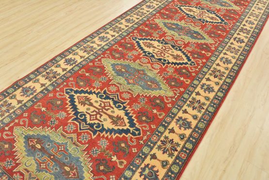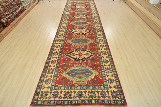 A tribal Caucasian Kazak runner hand-knotted with an all-wool pile on a cotton foundation. This oriental rug features a row of geometric medallions surrounded by botanical motifs set against a red background. It is new and in excellent condition.