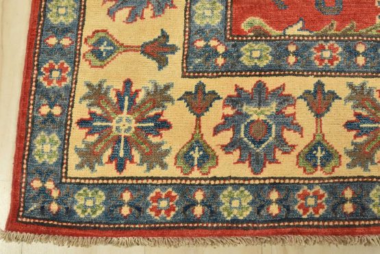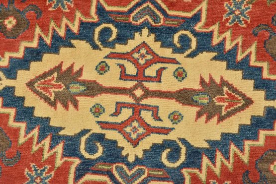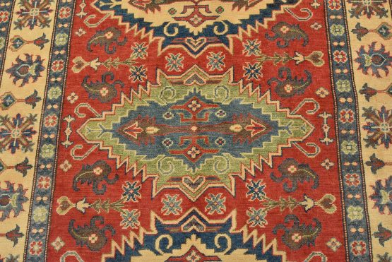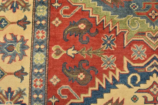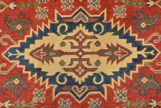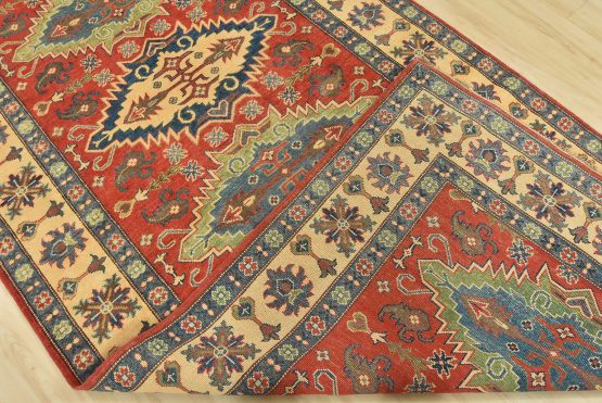 Original antique Kazak rugs from the Caucasus region inspire the creation of Kazak rugs. These rugs are woven with fine wool using traditional Kazak patterns and finished with a low-cut pile to give them an authentic vintage look.