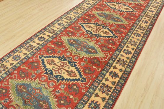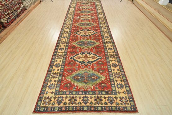 A traditional tribal Caucasian Kazak runner hand-knotted with an all-wool pile on a cotton foundation. This oriental rug features a row of geometric medallions surrounded by botanical motifs set against a red background. It is new and in excellent condition.