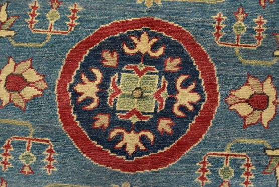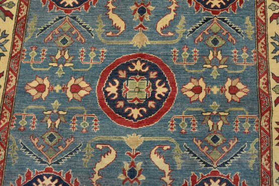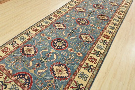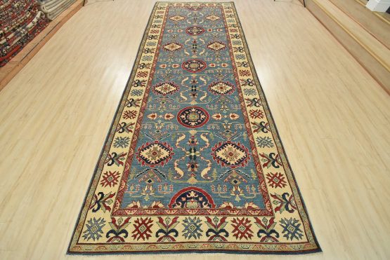 A traditional Caucasian Kazak runner hand-knotted with an all-wool pile on a cotton foundation. This oriental rug features small medallions surrounded by a botanical design set against a blue background. It is new and in excellent condition.