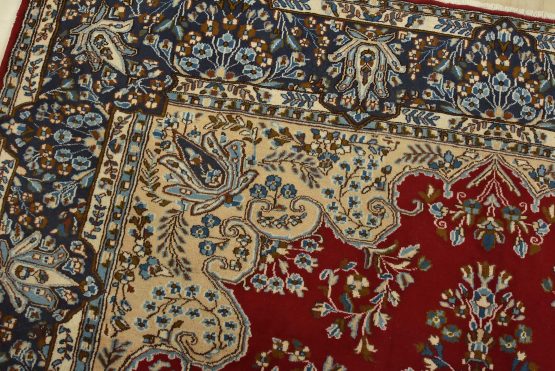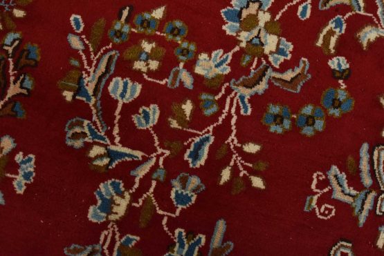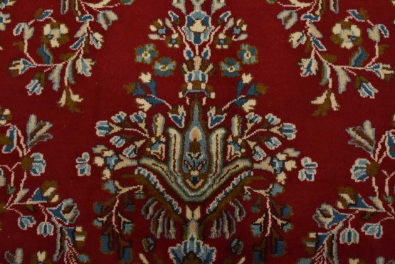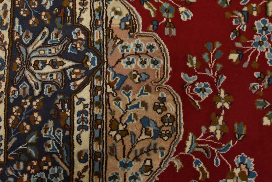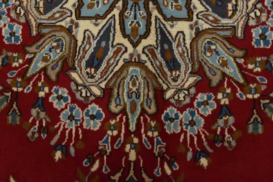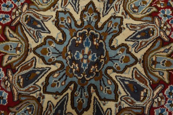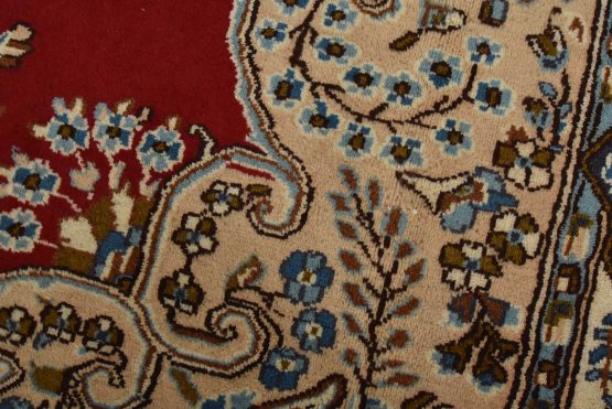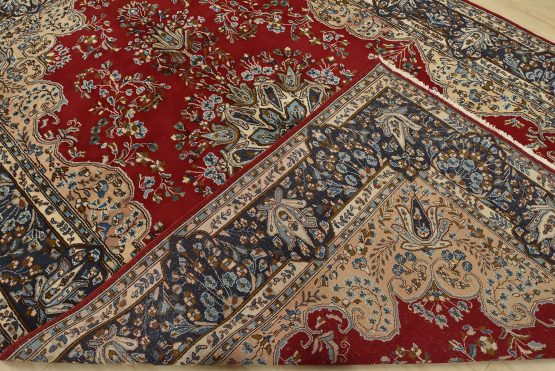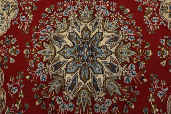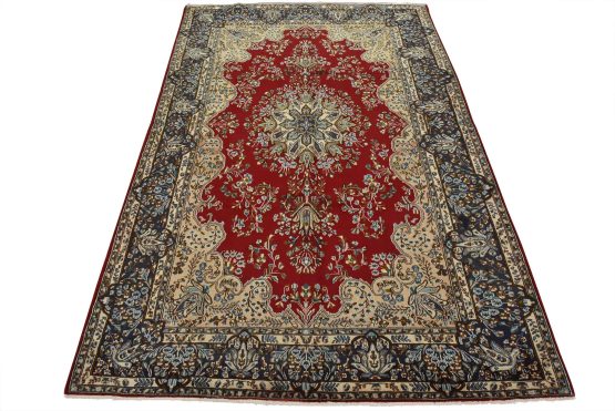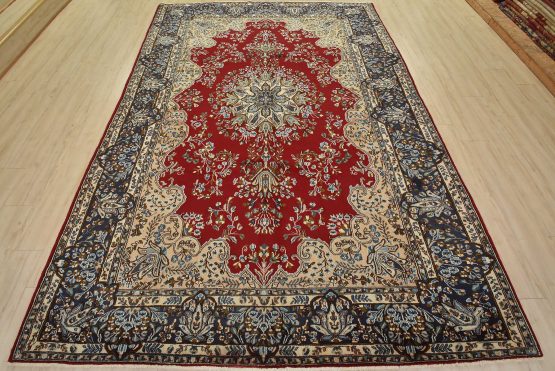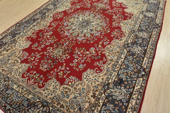 An authentic vintage traditional Kerman rug hand-knotted with fine wool and natural dyes. This oriental rug features a central medallion surrounded by floral motifs set against a red background. The wool pile shows some minor wear; please refer to the photos. Otherwise, the rug is in very good condition.