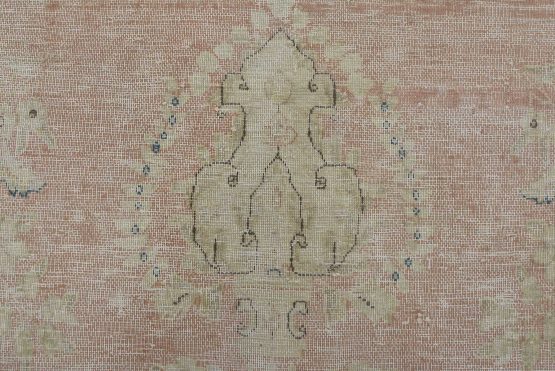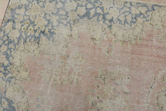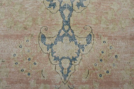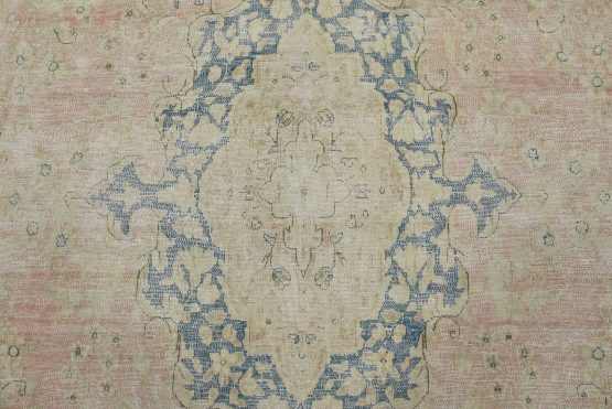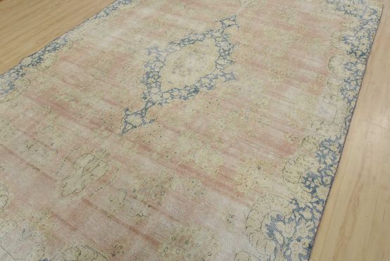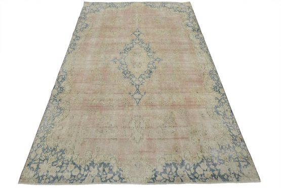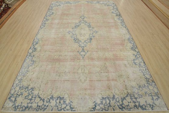 An authentic vintage traditional Kerman rug hand-knotted with fine wool and natural dyes. This oriental rug features a central medallion surrounded by a floral design set against a pink background. It has a low wool pile, is worn and distressed, and has minor imperfections (see photos). However, it is in very good condition.