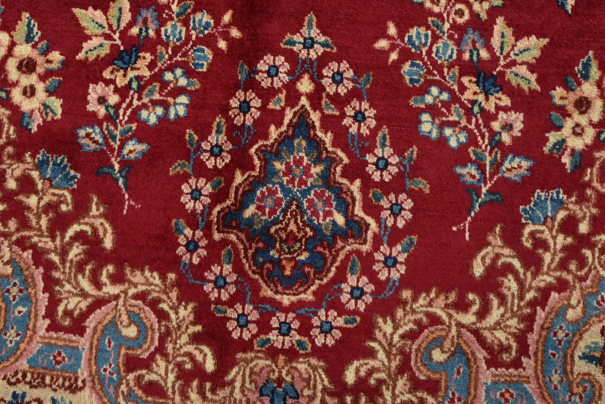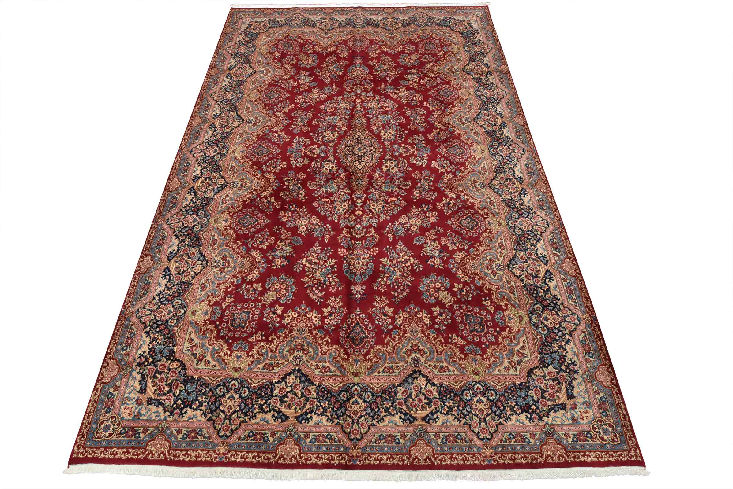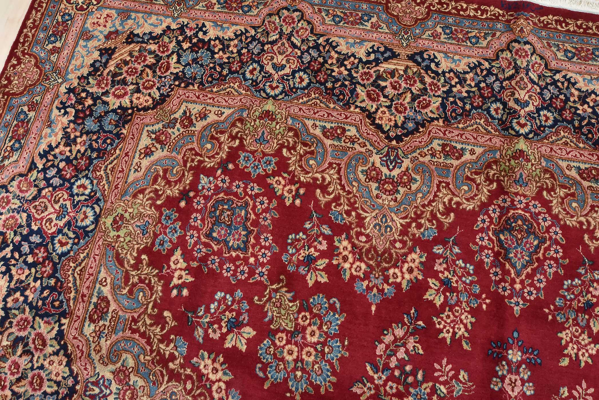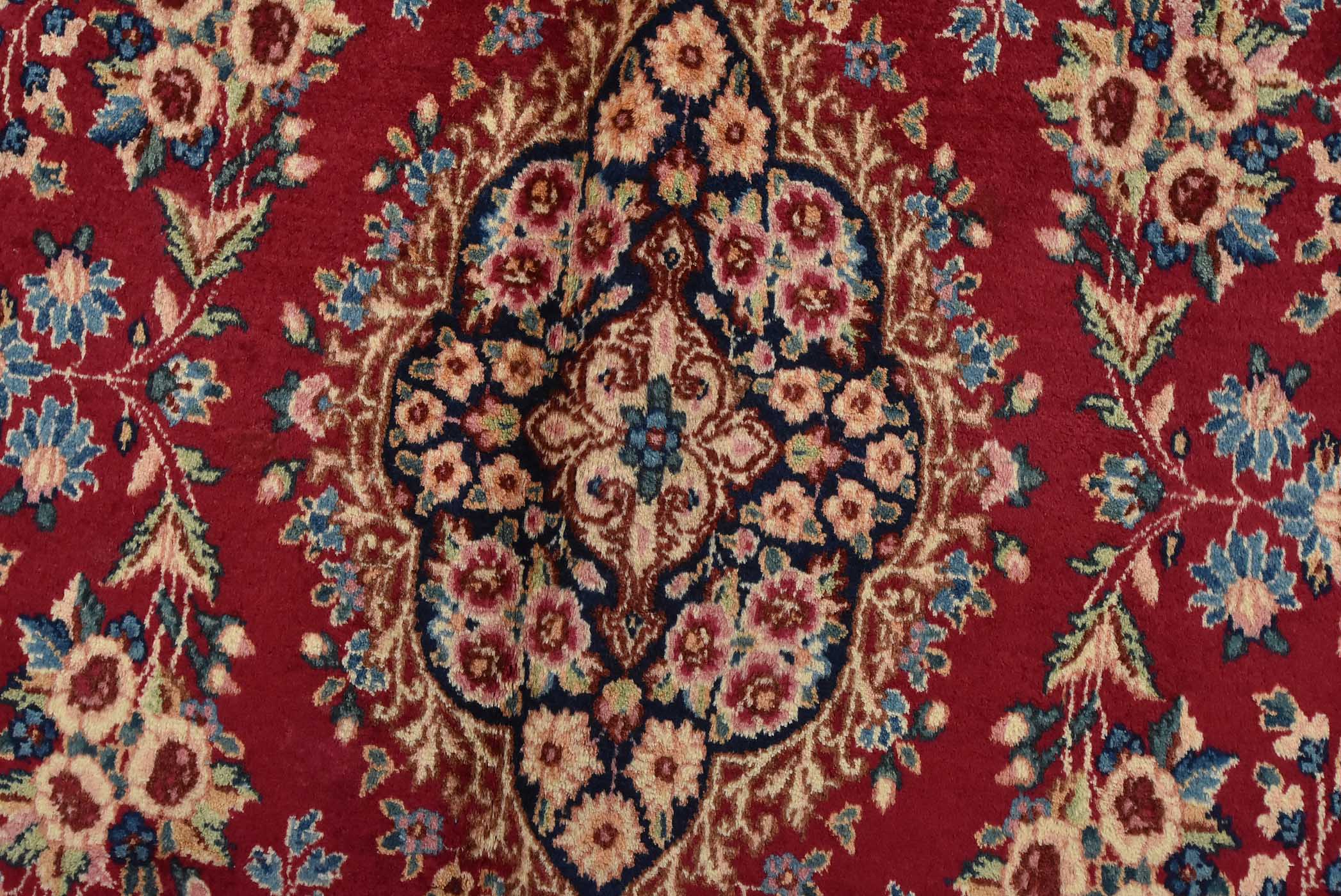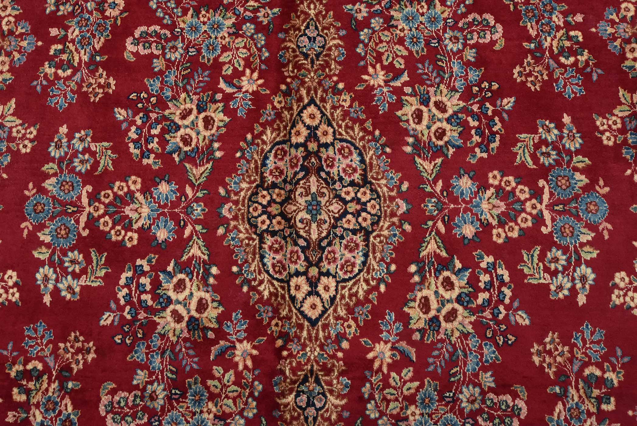 An authentic vintage traditional Kerman rug hand-knotted with fine wool and natural dyes. This oriental rug features a central medallion surrounded by intricate floral motifs set against a red background. It has a full wool pile with no worn areas and is in very good condition.