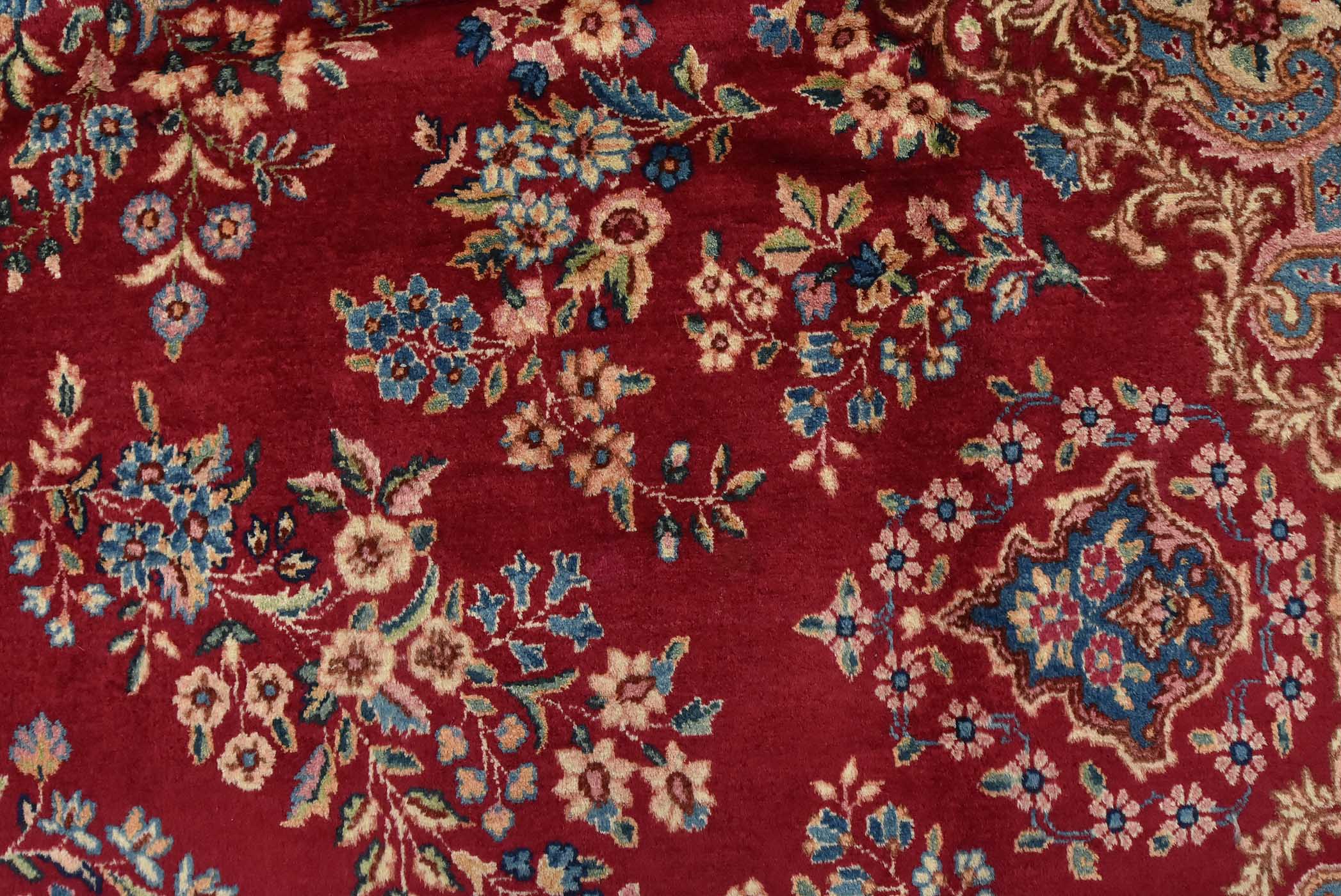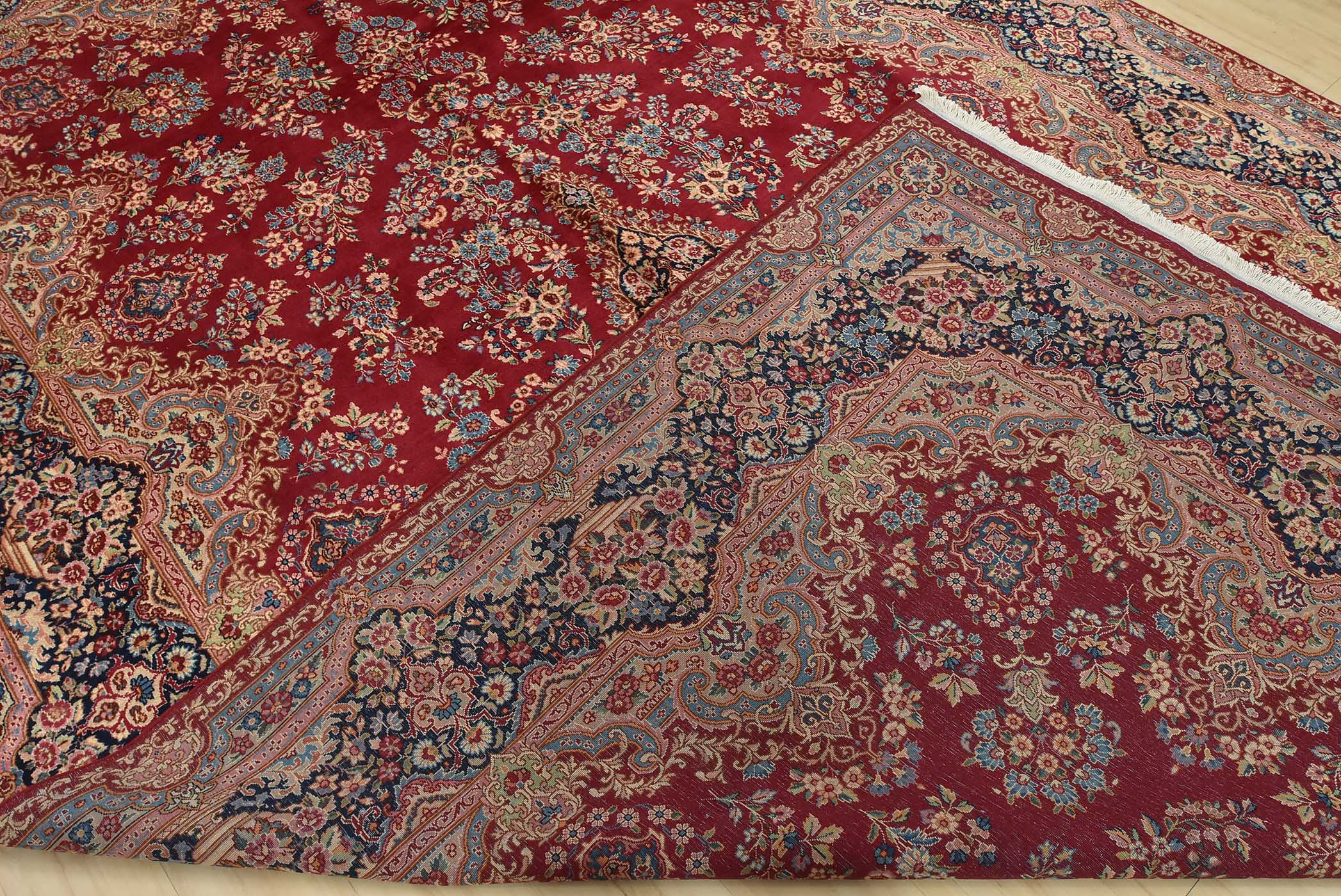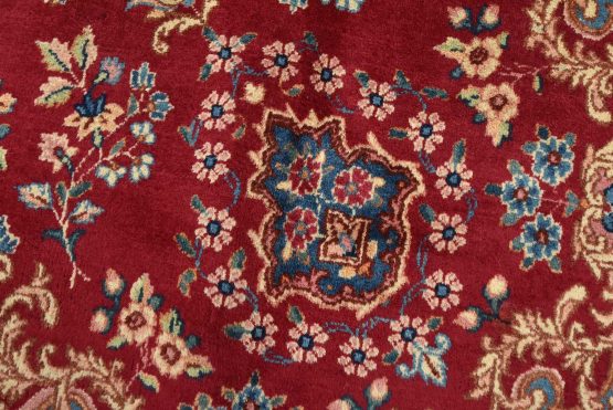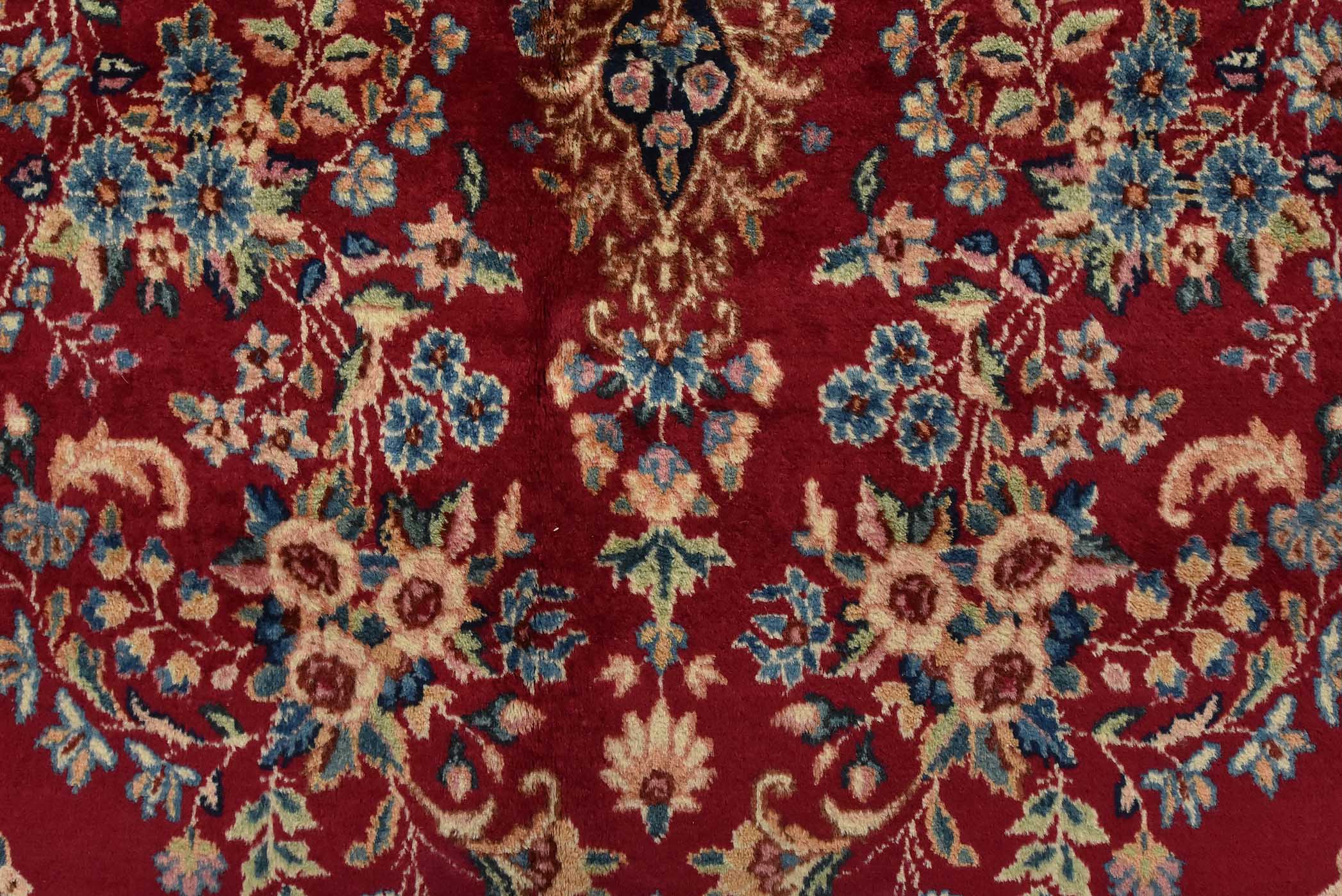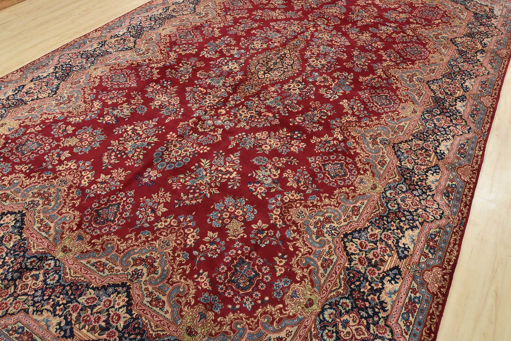 An authentic vintage traditional Kerman rug hand-knotted with fine wool and natural dyes. This oriental rug features a central medallion surrounded by intricate floral motifs set against a red background. It has a full wool pile with no worn areas and is in very good condition.