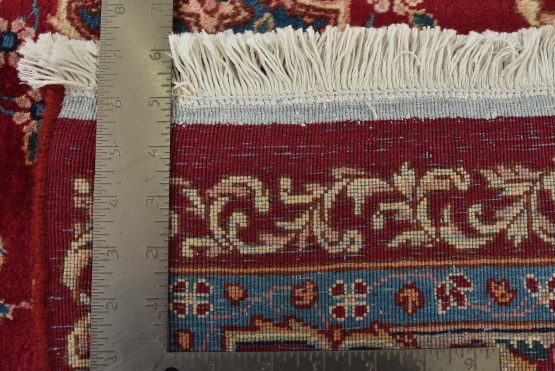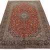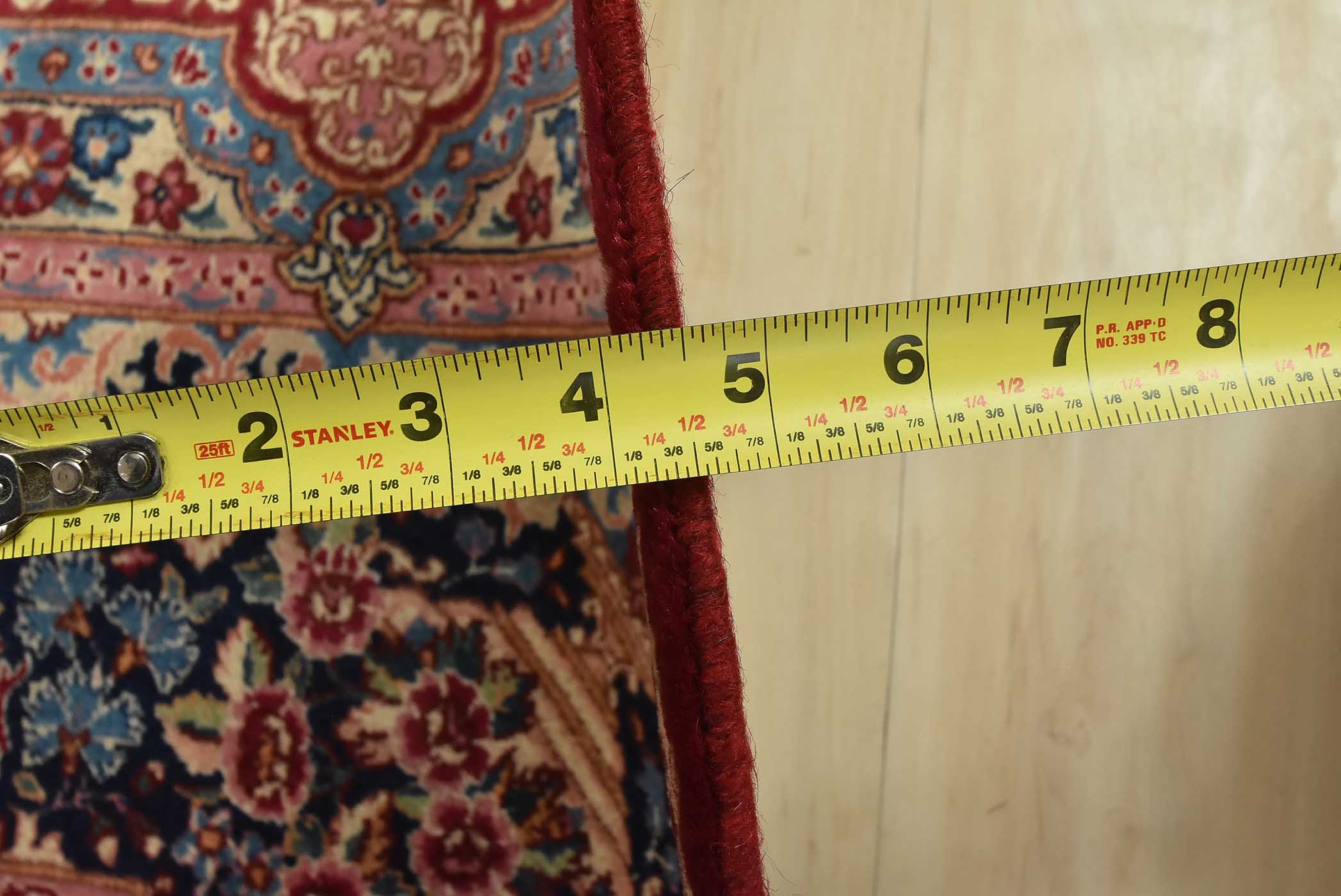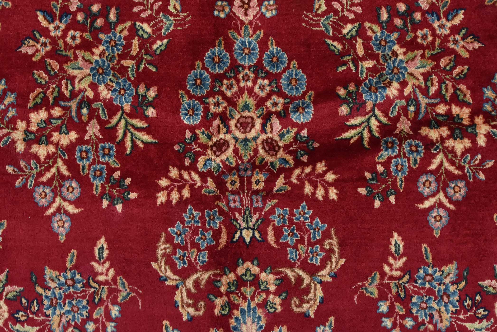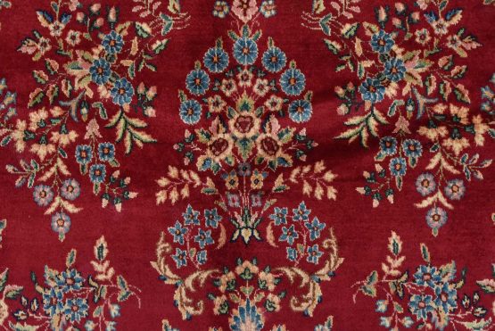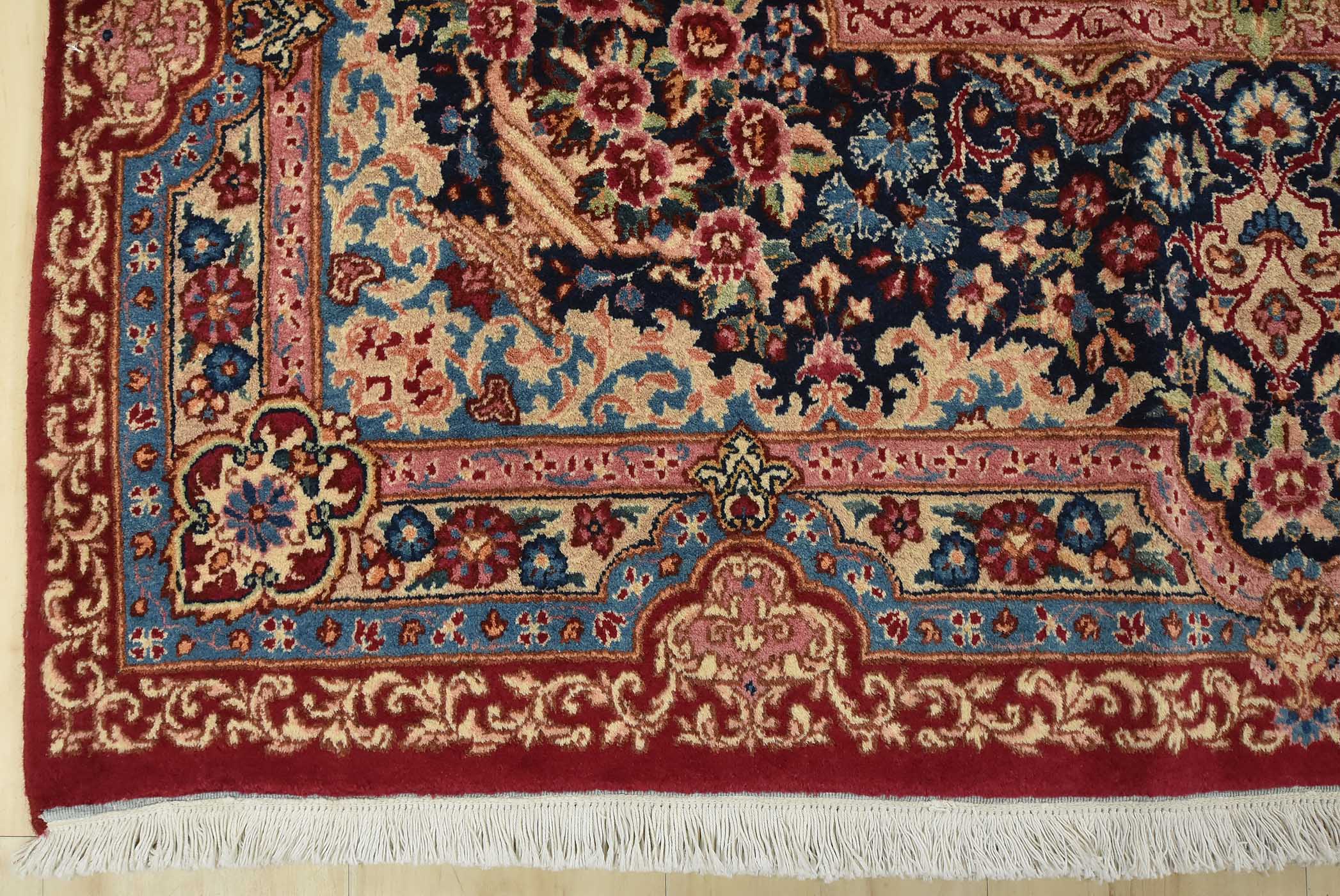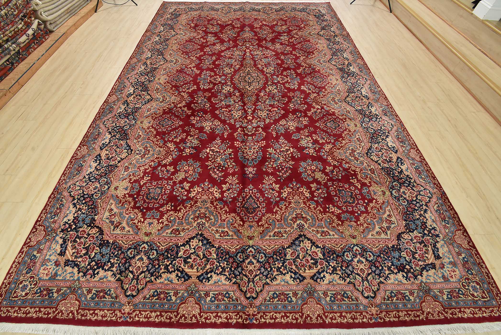 An authentic vintage traditional Kerman rug hand-knotted with fine wool and natural dyes. This oriental rug features a central medallion surrounded by intricate floral motifs set against a red background. It has a full wool pile with no worn areas and is in very good condition.