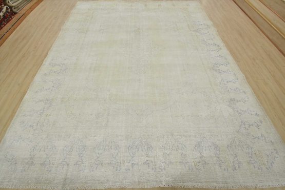 An authentic vintage traditional Kerman rug hand-knotted with fine wool and natural dyes. This oriental rug features a central medallion set against an Ivory background. It has a low wool pile, is worn and distressed, and has minor imperfections (see photos). However, it is in very good condition.