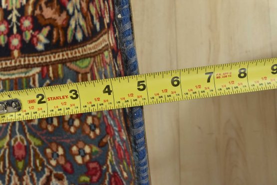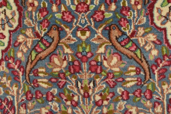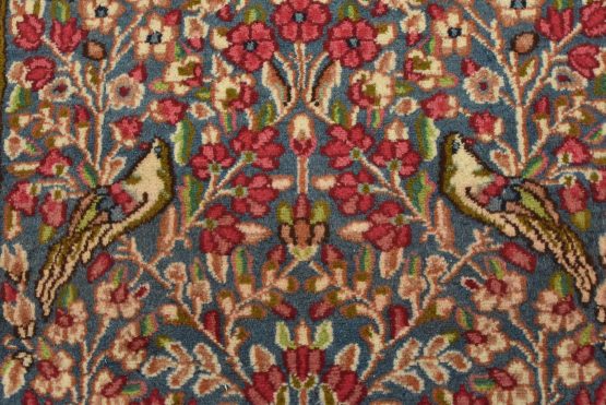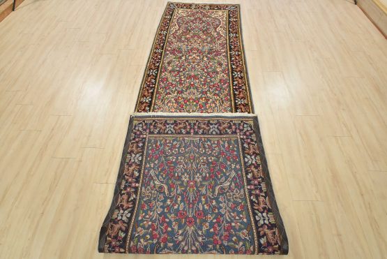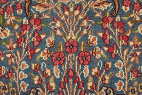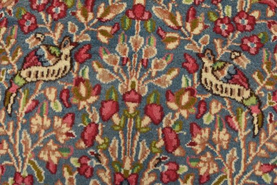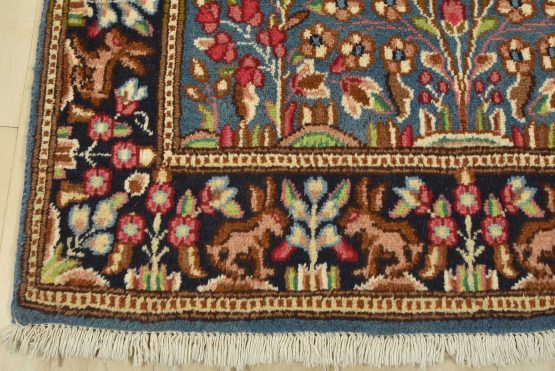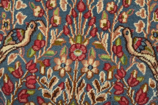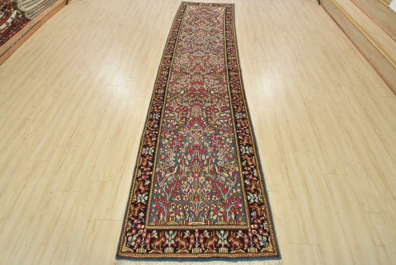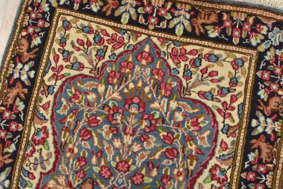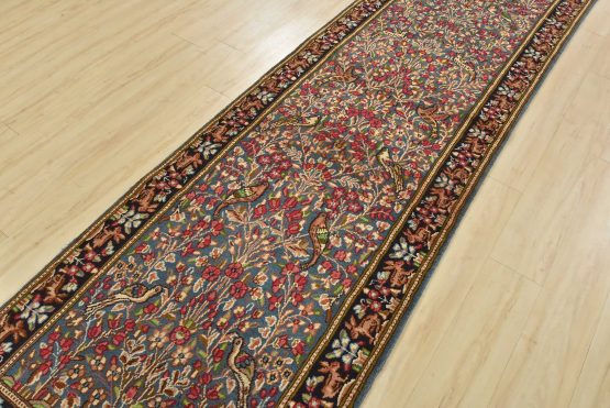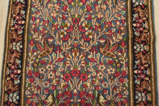 An authentic vintage traditional Kerman runner hand-knotted with fine wool and natural dyes. This rug features an all-over curvilinear floral pattern with bird and rabbit figures set against a blue background. The wool pile shows some minor wear; see photos. Otherwise, this rug is in very good condition.
