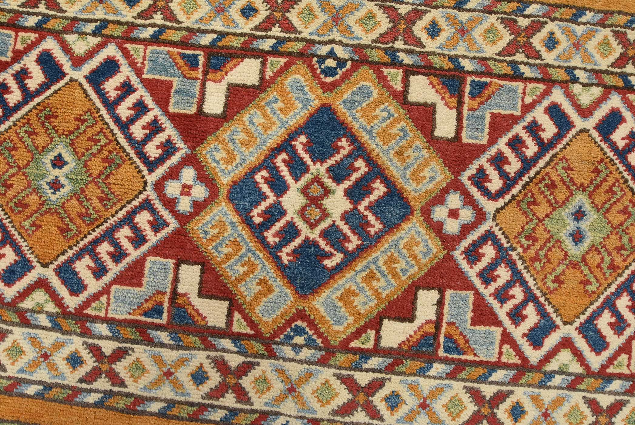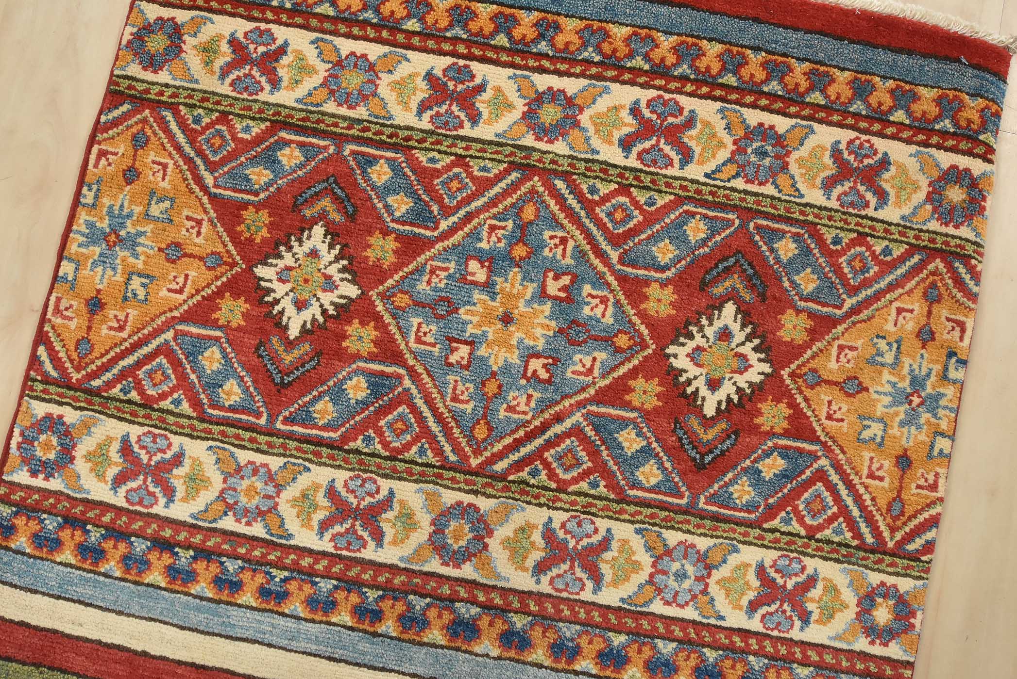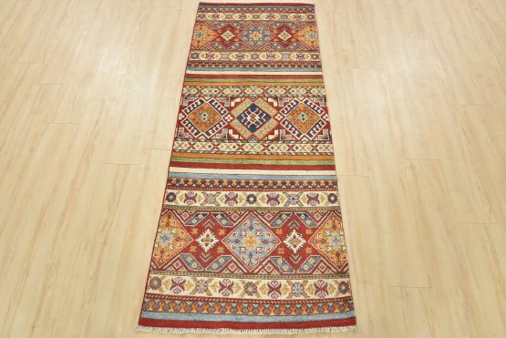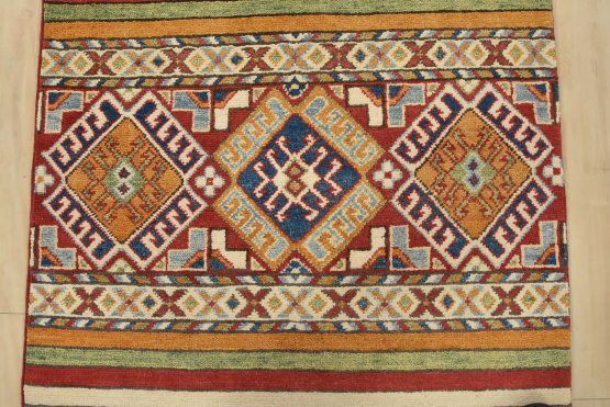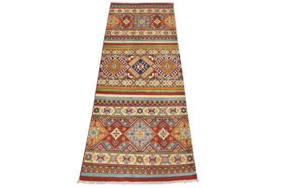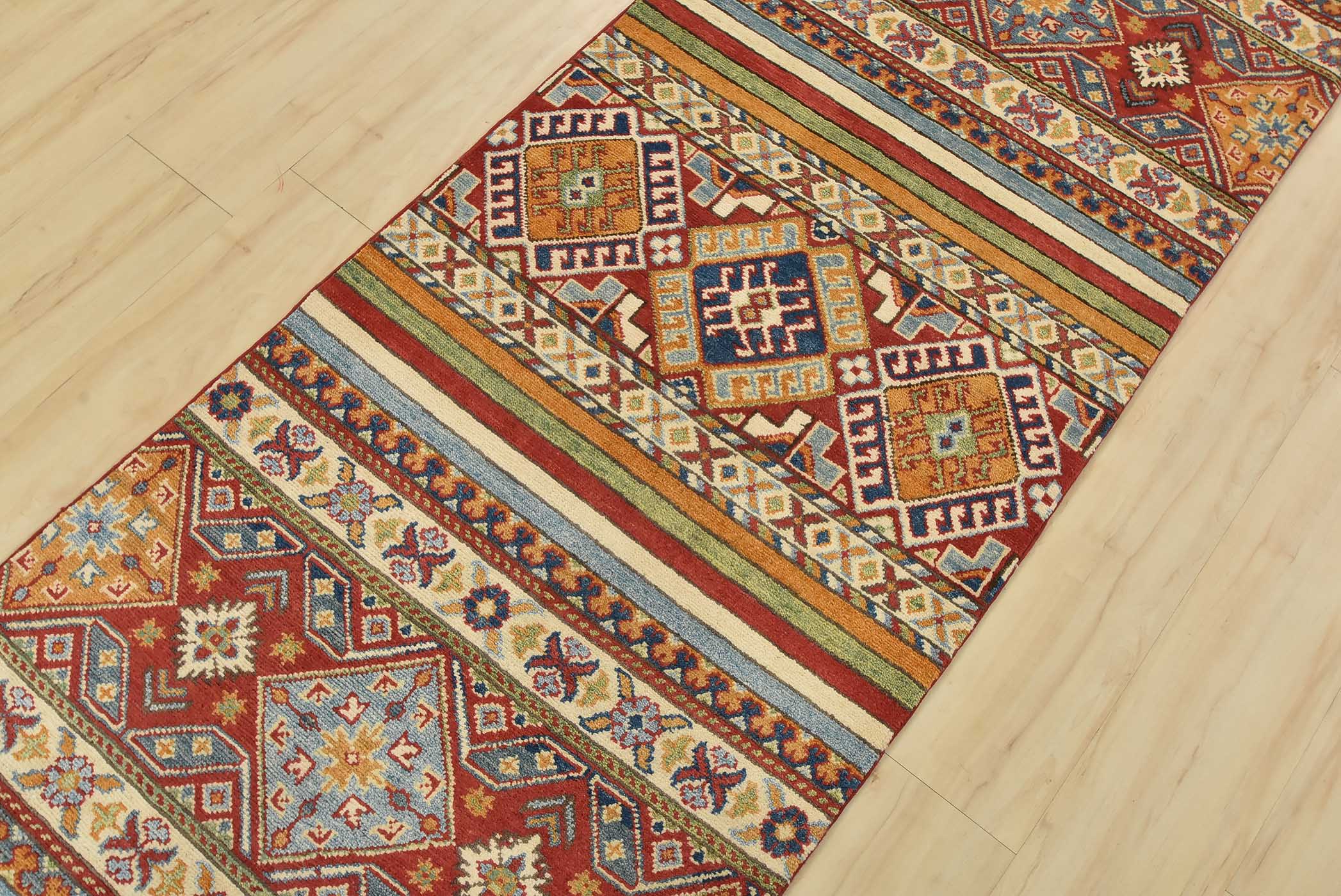 A tribal Khorjin runner hand-knotted with fine wool on a cotton foundation. This rug features multicolored stripes adorned with geometric motifs. It is new and in excellent condition.