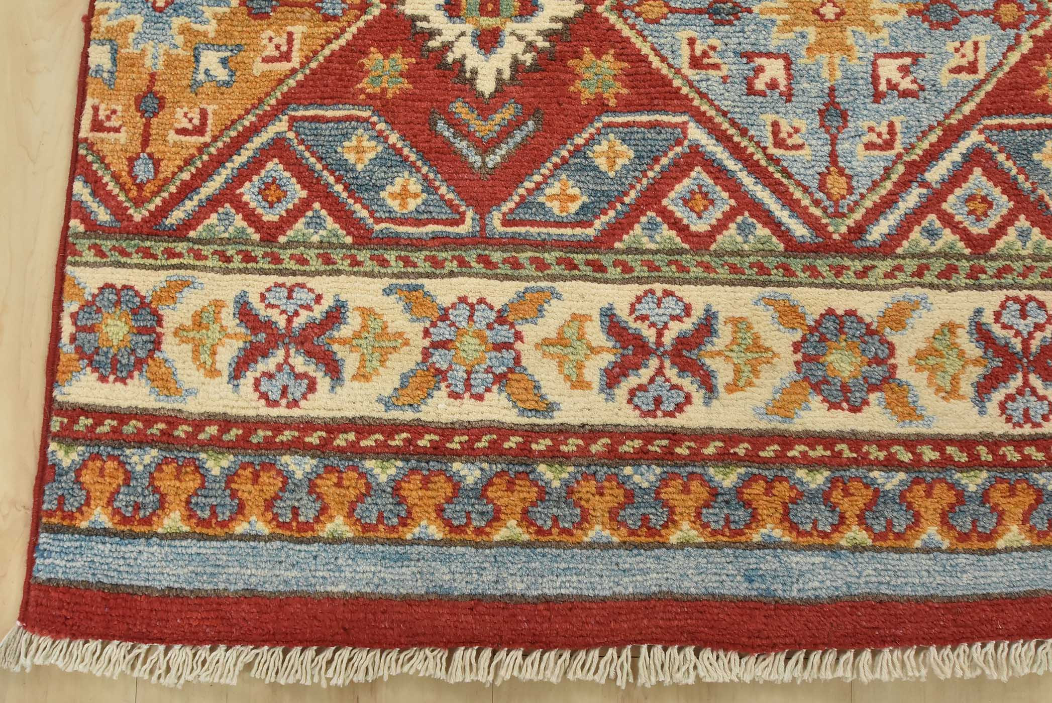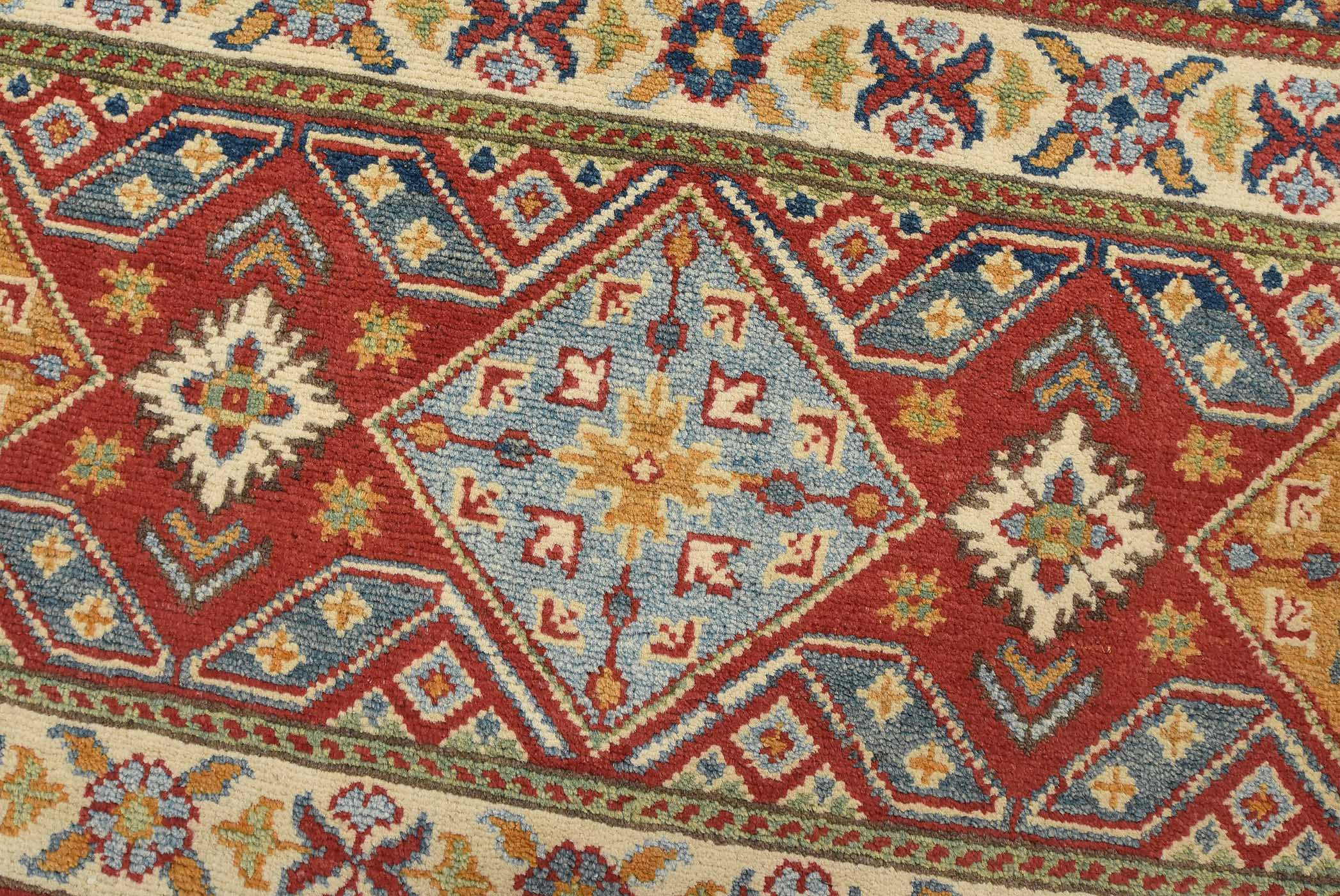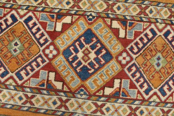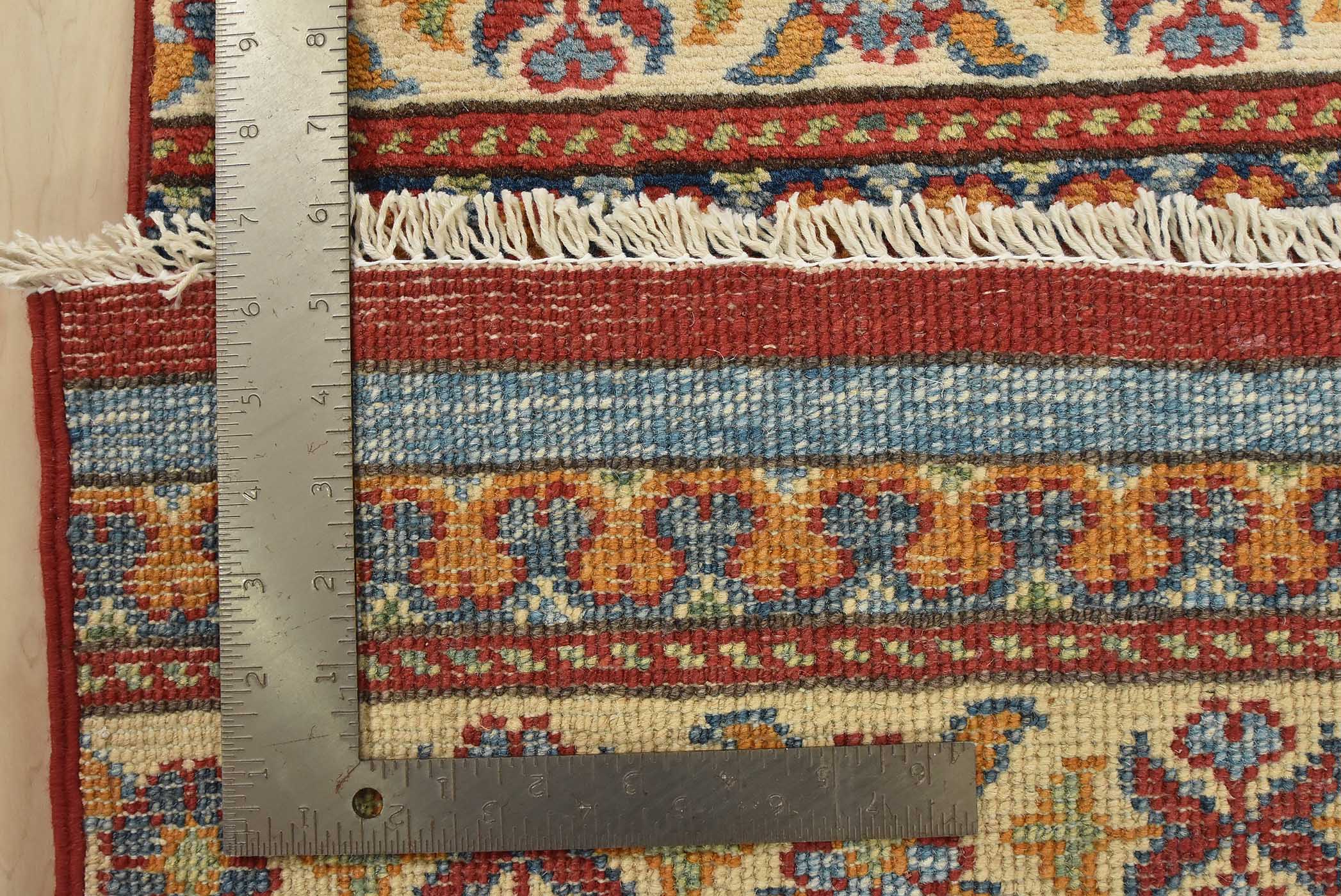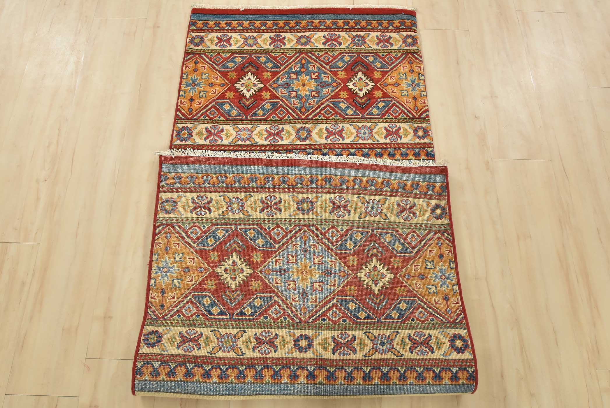 A tribal Khorjin runner hand-knotted with fine wool on a cotton foundation. This rug features multicolored stripes adorned with geometric motifs. It is new and in excellent condition.