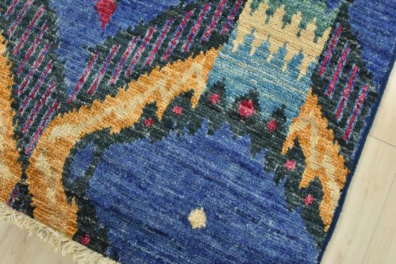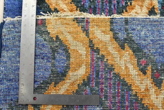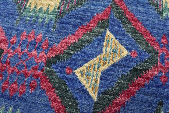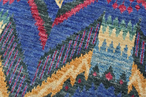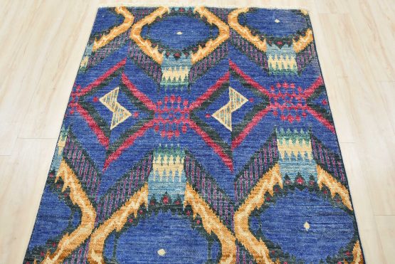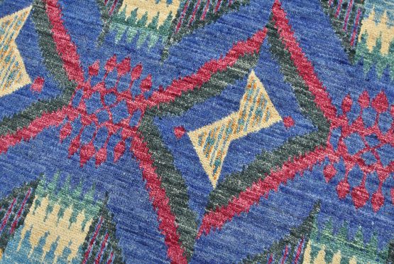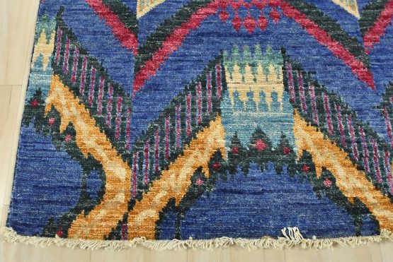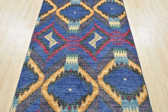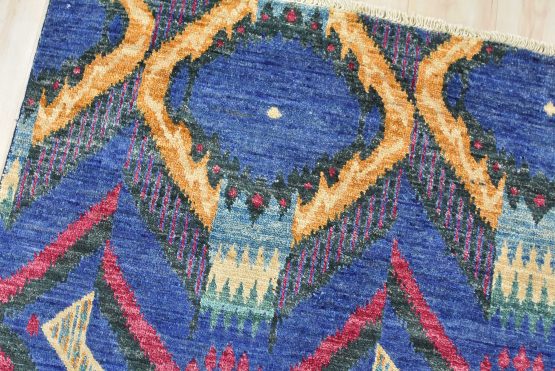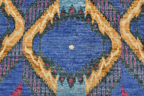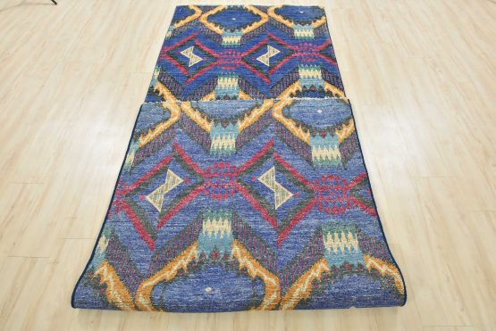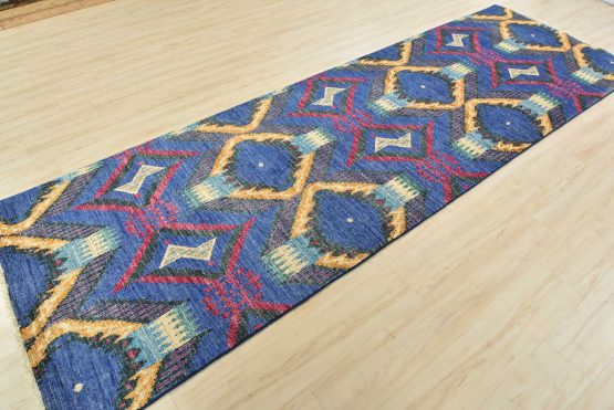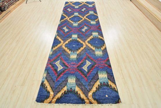 A modern Ikat runner hand-knotted with an all-wool pile on a cotton foundation. This oriental rug features an all-over geometric pattern set against a blue background. It is new and in excellent condition.