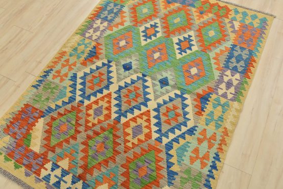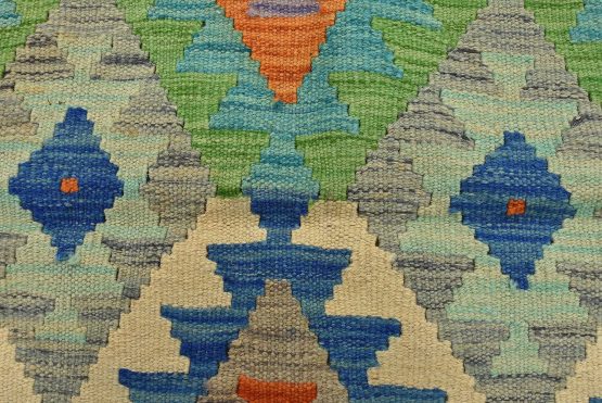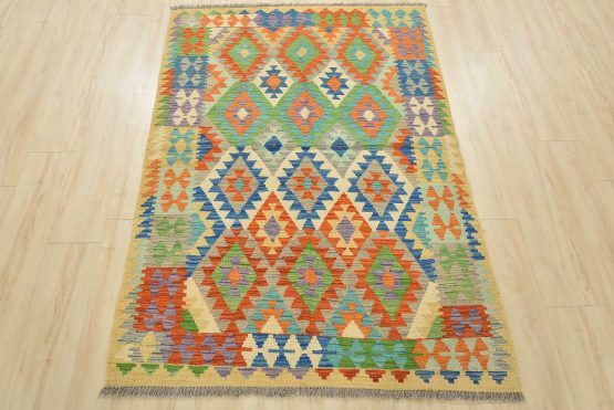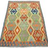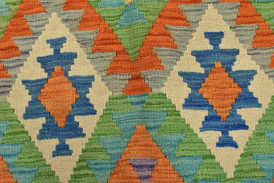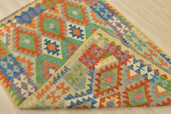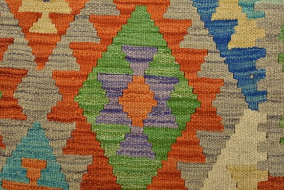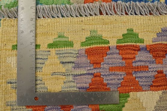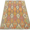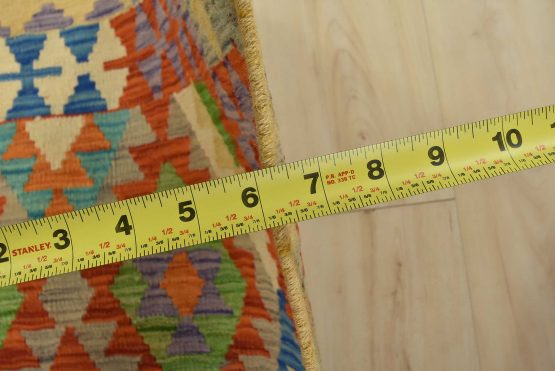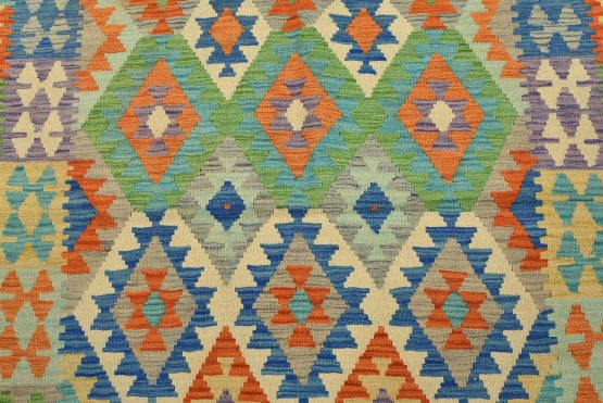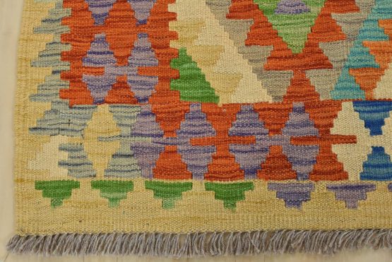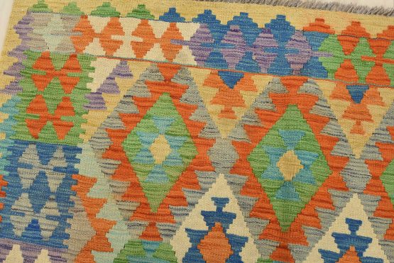 A tribal Kilim rug handwoven with fine wool on a wool foundation. This oriental rug features an all-over geometric pattern in multiple colors. It is new and in excellent condition.