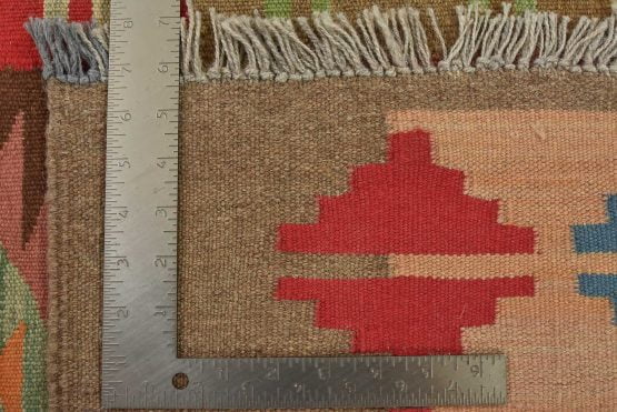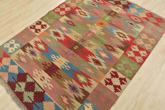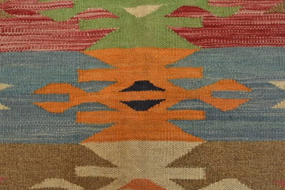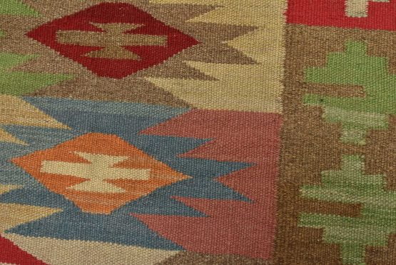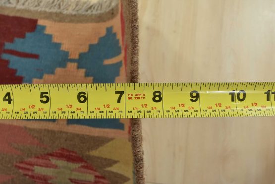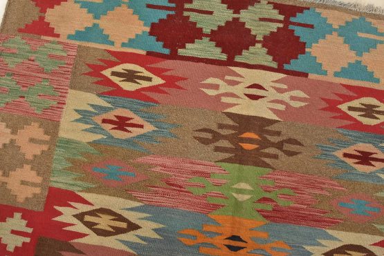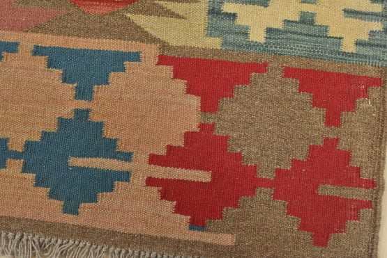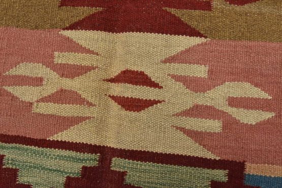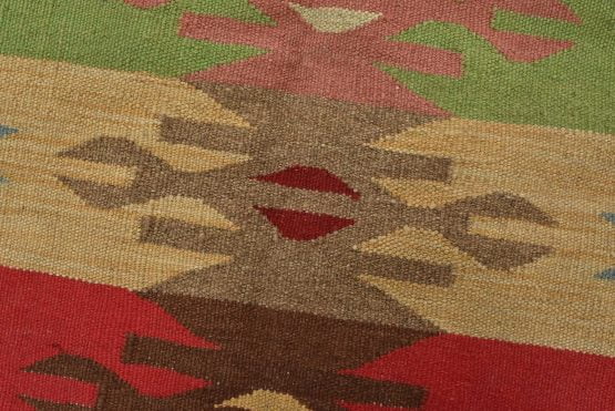 For this reason, most Kilims can be classed as “slit woven” textiles. Collectors love the slits, as they produce very sharp-etched designs emphasizing the geometry of the weave. The weft strands, which carry the visible design and color, are almost always wool, whereas the hidden warp strands can be wool or cotton. The warp strands are only visible at the ends, where they emerge as the fringe. Whether laying it over furniture or on the floor, a Kilim will add a splash of color to any room.