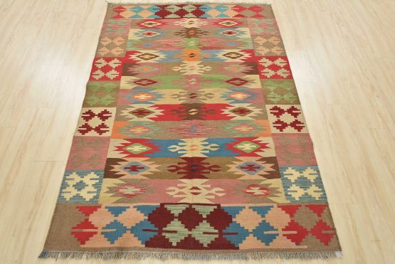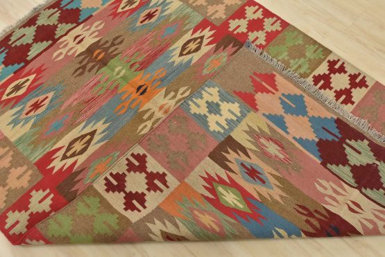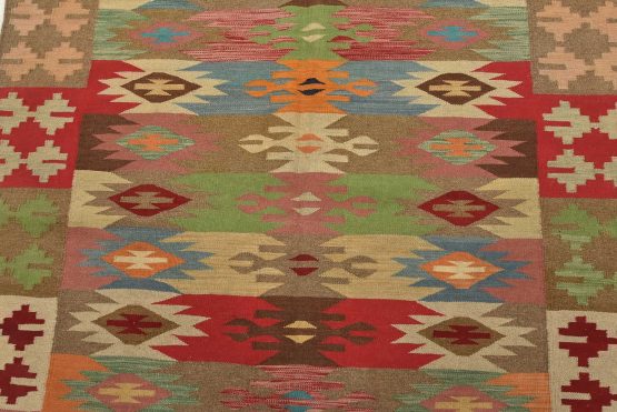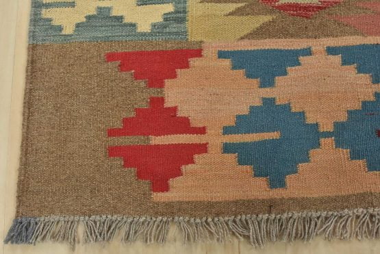 A tribal Kilim rug handwoven with all wool on a wool foundation. This oriental rug features an all-over pattern of geometric motifs. It is new and in excellent condition.