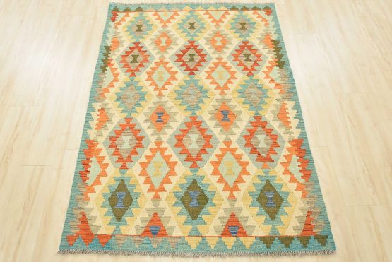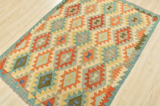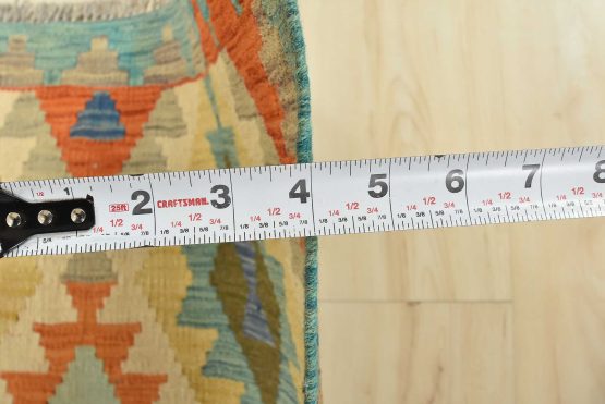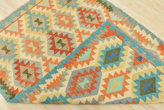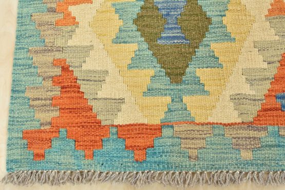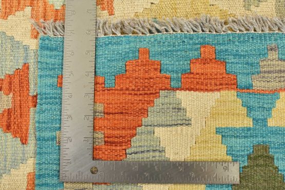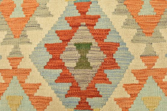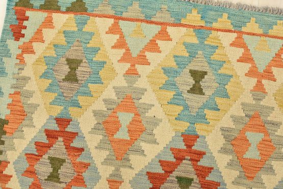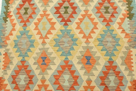 A tribal Kilim rug handwoven with fine wool on a wool foundation. This oriental rug features a geometric pattern set against an ivory background. It is new and in excellent condition.