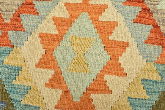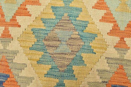 For this reason, most Kilims can be classed as “slit woven” textiles. Collectors love the slits, as they produce very sharp-etched designs emphasizing the geometry of the weave. The weft strands, which carry the visible design and color, are almost always wool, whereas the hidden warp strands can be wool or cotton. The warp strands are only visible at the ends, where they emerge as the fringe. Whether laying it over furniture or on the floor, a Kilim will add a splash of color to any room.