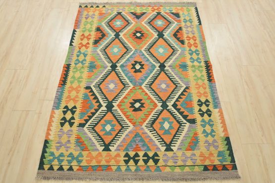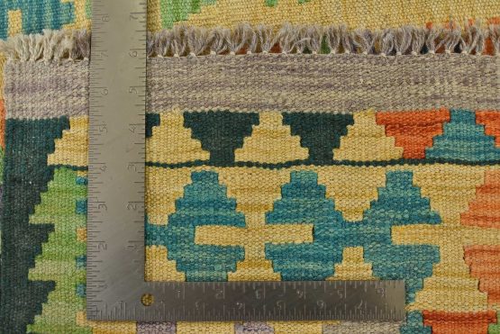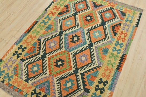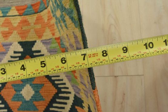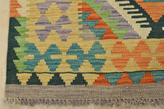 A tribal geometric Kilim rug handwoven with fine wool on a wool foundation. This oriental rug features an all-over geometric pattern in multiple colors. It is new and in excellent condition.