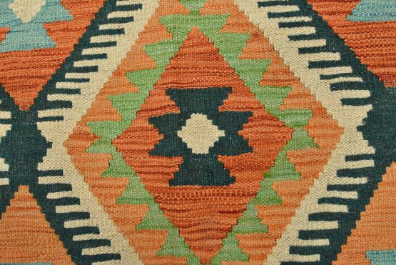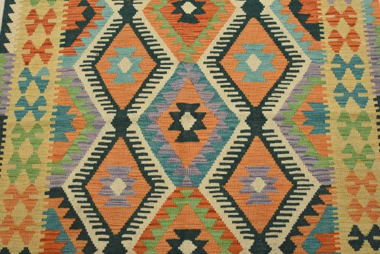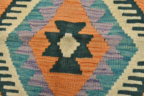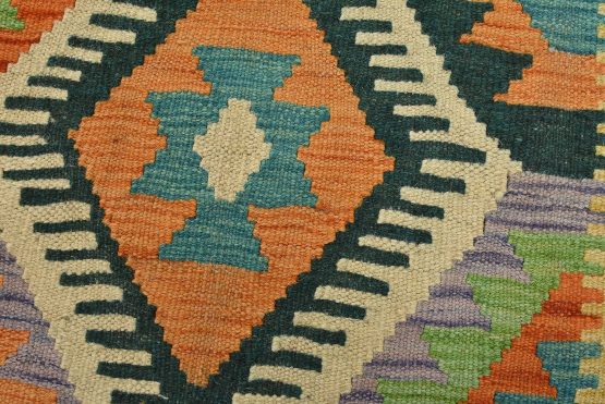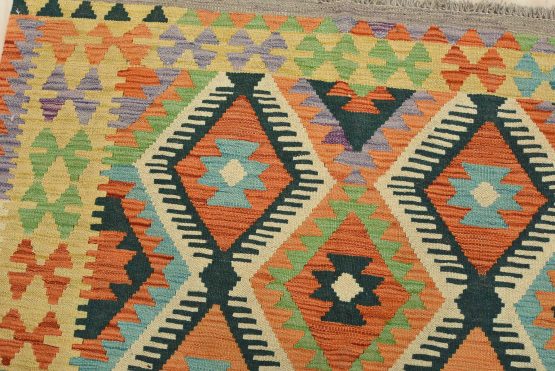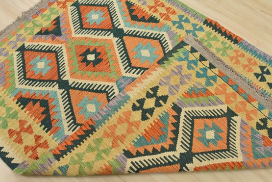 For this reason, most Kilims can be classed as “slit woven” textiles. Collectors love the slits, as they produce very sharp-etched designs emphasizing the geometry of the weave. The weft strands, which carry the visible design and color, are almost always wool, whereas the hidden warp strands can be wool or cotton. The warp strands are only visible at the ends, where they emerge as the fringe. Whether laying it over furniture or on the floor, a Kilim will add a splash of color to any room.