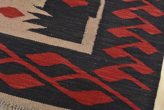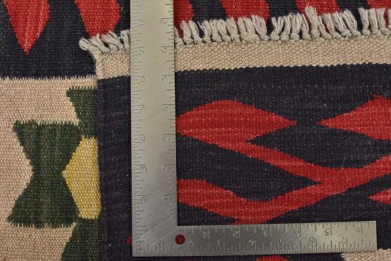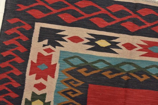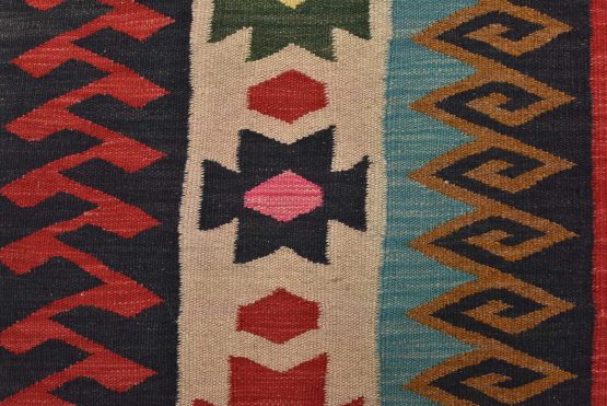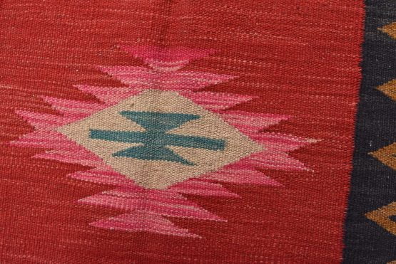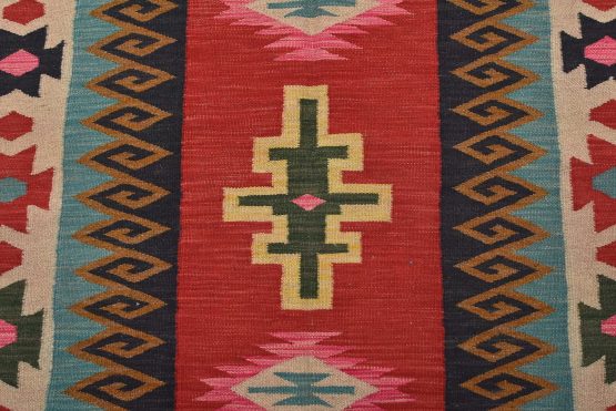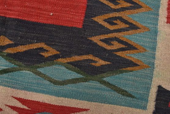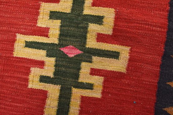 For this reason, most Kilims can be classed as “slit woven” textiles. Collectors love the slits, as they produce very sharp-etched designs emphasizing the geometry of the weave. The weft strands, which carry the visible design and color, are almost always wool, whereas the hidden warp strands can be wool or cotton. The warp strands are only visible at the ends, where they emerge as the fringe. Whether laying it over furniture or on the floor, a Kilim will add a splash of color to any room.