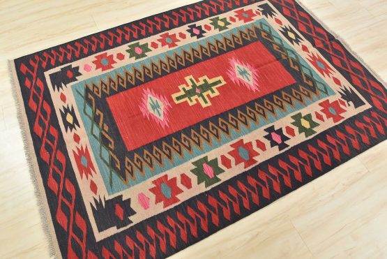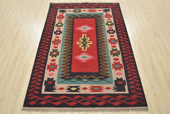 A tribal Kilim rug handwoven with fine wool on a wool foundation. This oriental rug features geometric motifs set against a red background. It is new and in excellent condition.