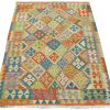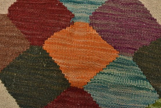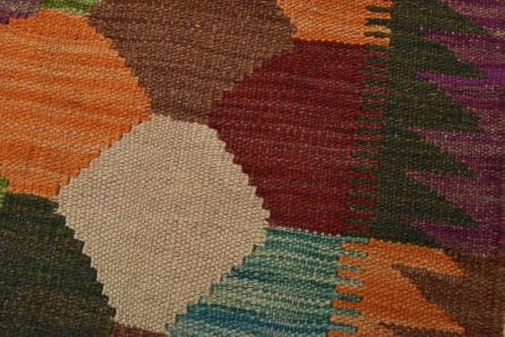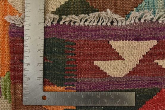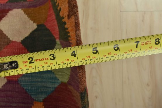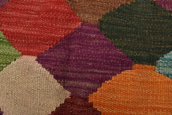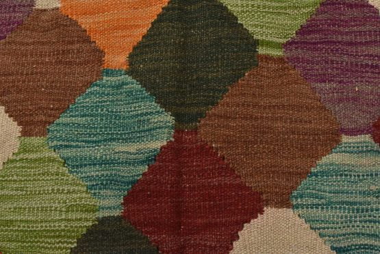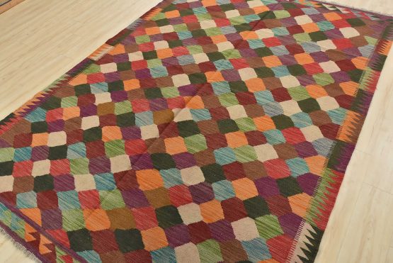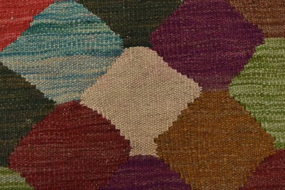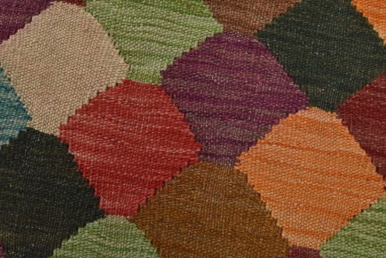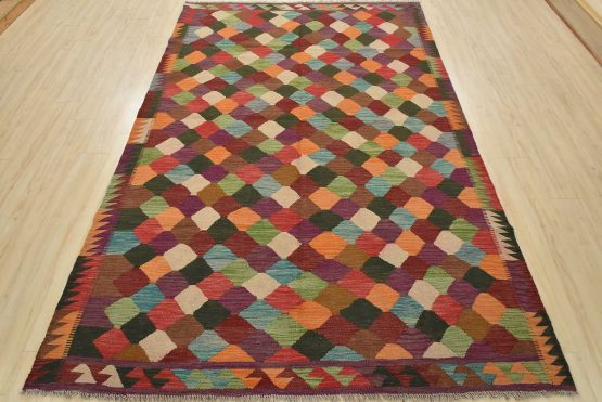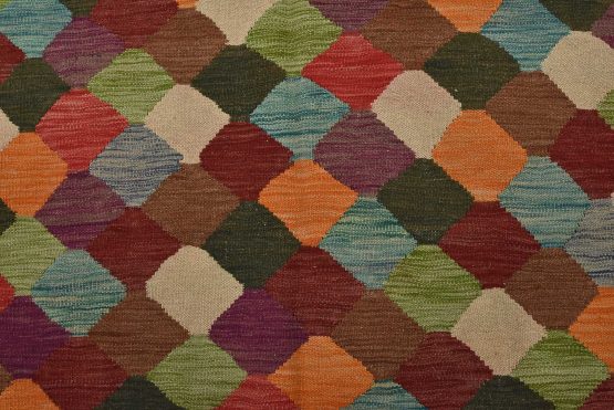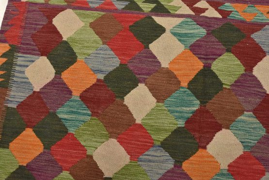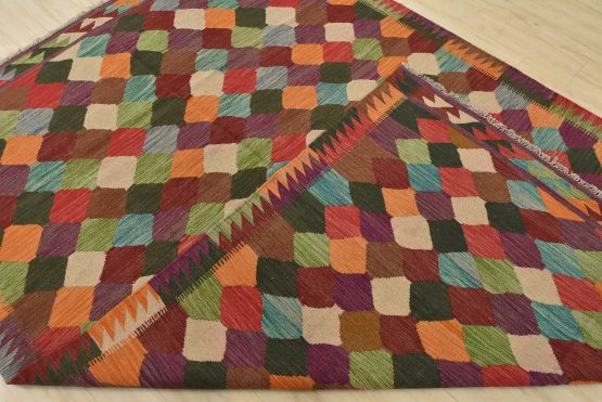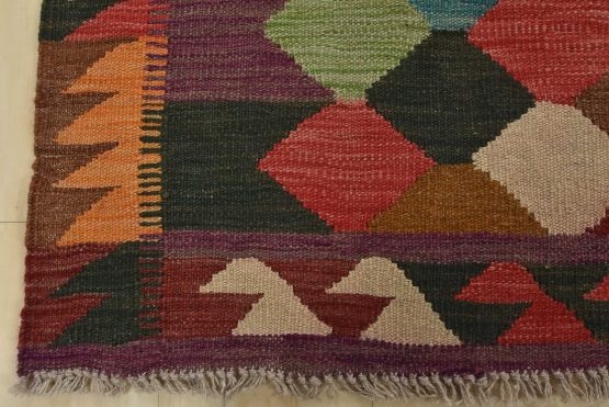A tribal Kilim rug handwoven with fine wool on a wool foundation. This oriental rug features an all-over geometric pattern in multiple colors. It is new and in excellent condition.