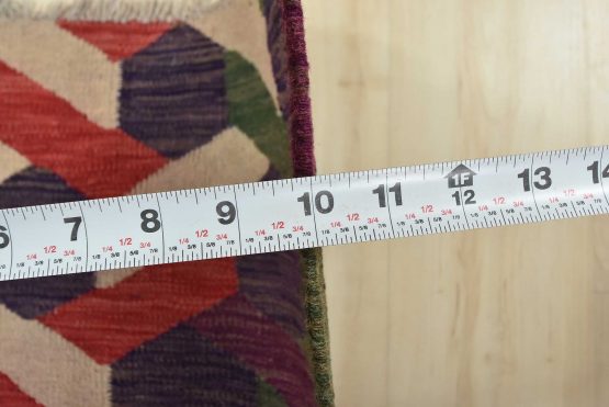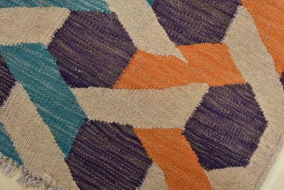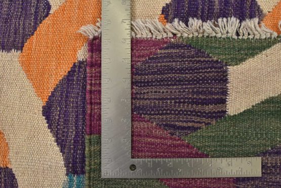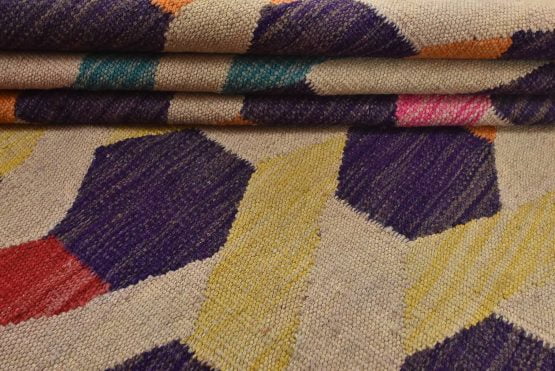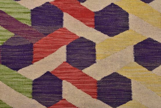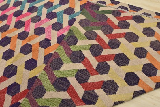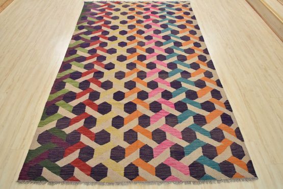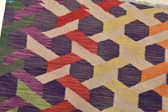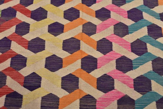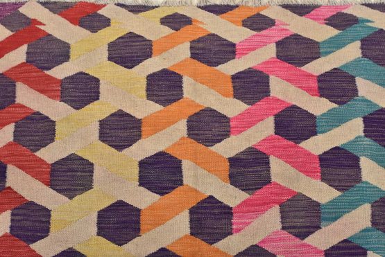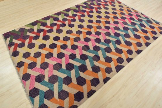 A modern geometric Kilim rug handwoven entirely from wool on a wool foundation. This oriental rug features an all-over geometric pattern in multiple colors. It is new and in excellent condition.