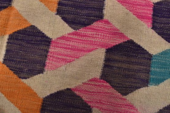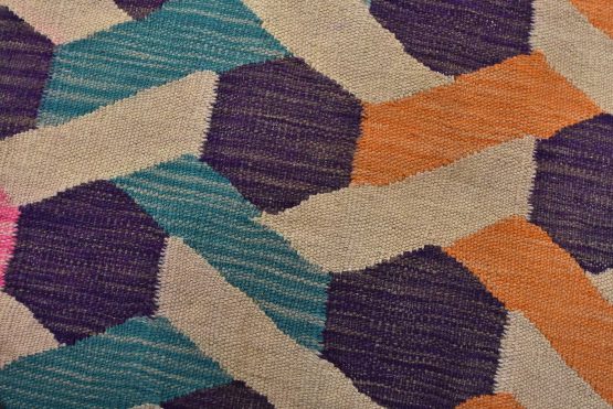 For this reason, most Kilims can be classed as “slit woven” textiles. Collectors love the slits, as they produce very sharp-etched designs emphasizing the geometry of the weave. The weft strands, which carry the visible design and color, are almost always wool, whereas the hidden warp strands can be wool or cotton. The warp strands are only visible at the ends, where they emerge as the fringe. Whether laying it over furniture or on the floor, a Kilim will add a splash of color to any room.